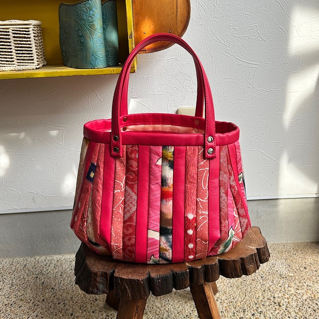 革と古布のパッチワークバッグ(ピンクの革+着物生地)01016-118