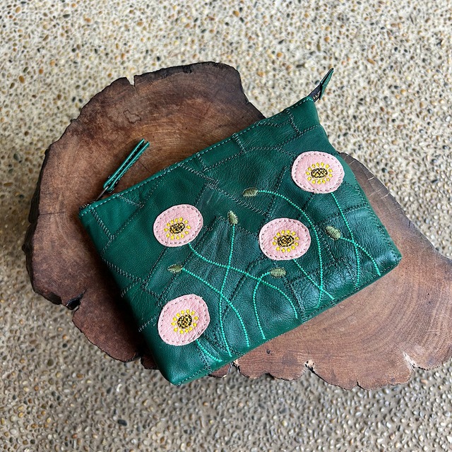 革パッチワークのファスナーポーチ(グリーンの革にポピーの刺繍)03008-20