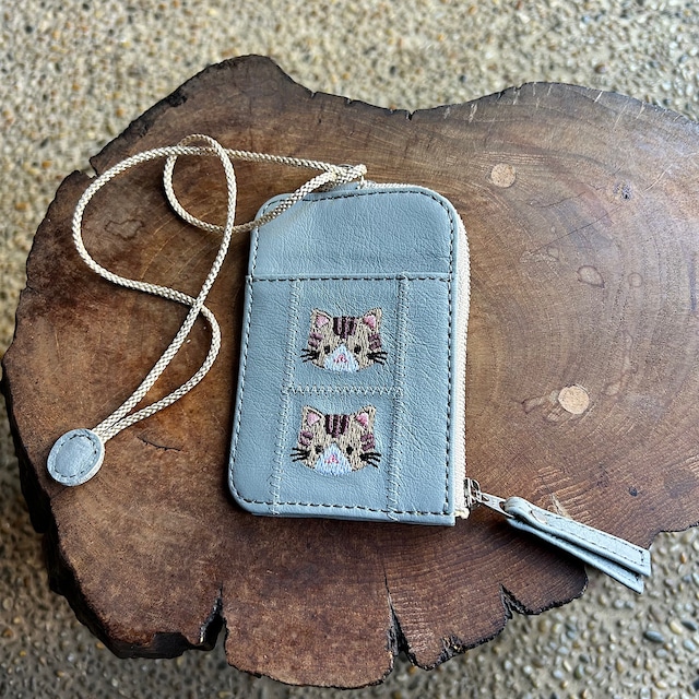 パスケース2枚用 小銭入れ付き(ライトグレーの革に茶トラ猫の刺繡)03003-51