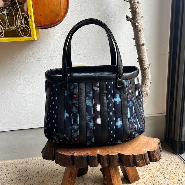 革と古布のパッチワークバッグ(黒の革+絣)01016-100