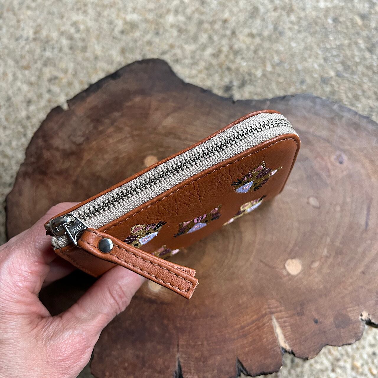 赤茶色の牛革に茶トラ猫の刺繡を施して 素敵なコンパクト財布が出来上がりました。