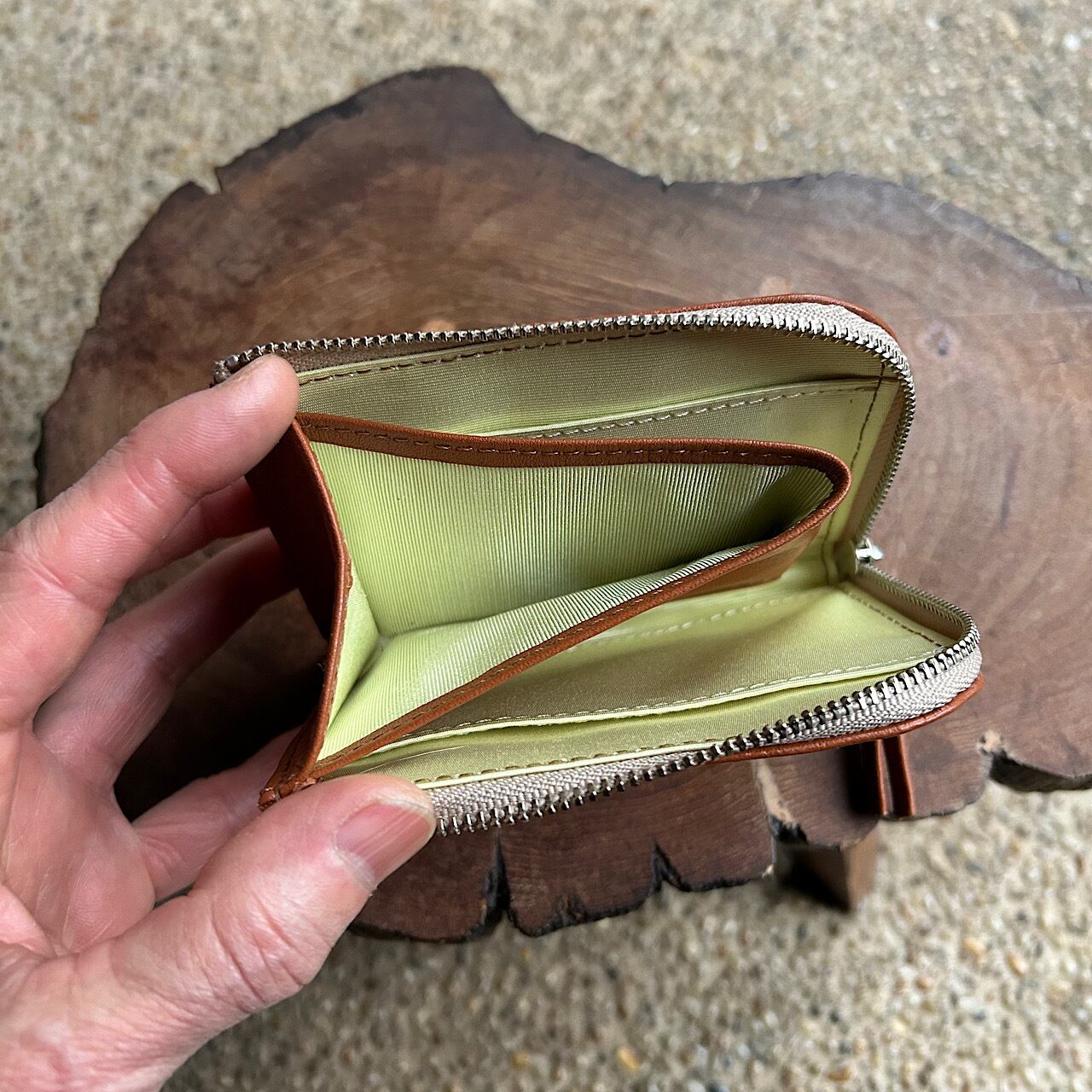 中央が小銭スペース、その両側にお札やレシート、カードポケットは2か所。6~8枚目の画像は色違いのものですが、使用例です。