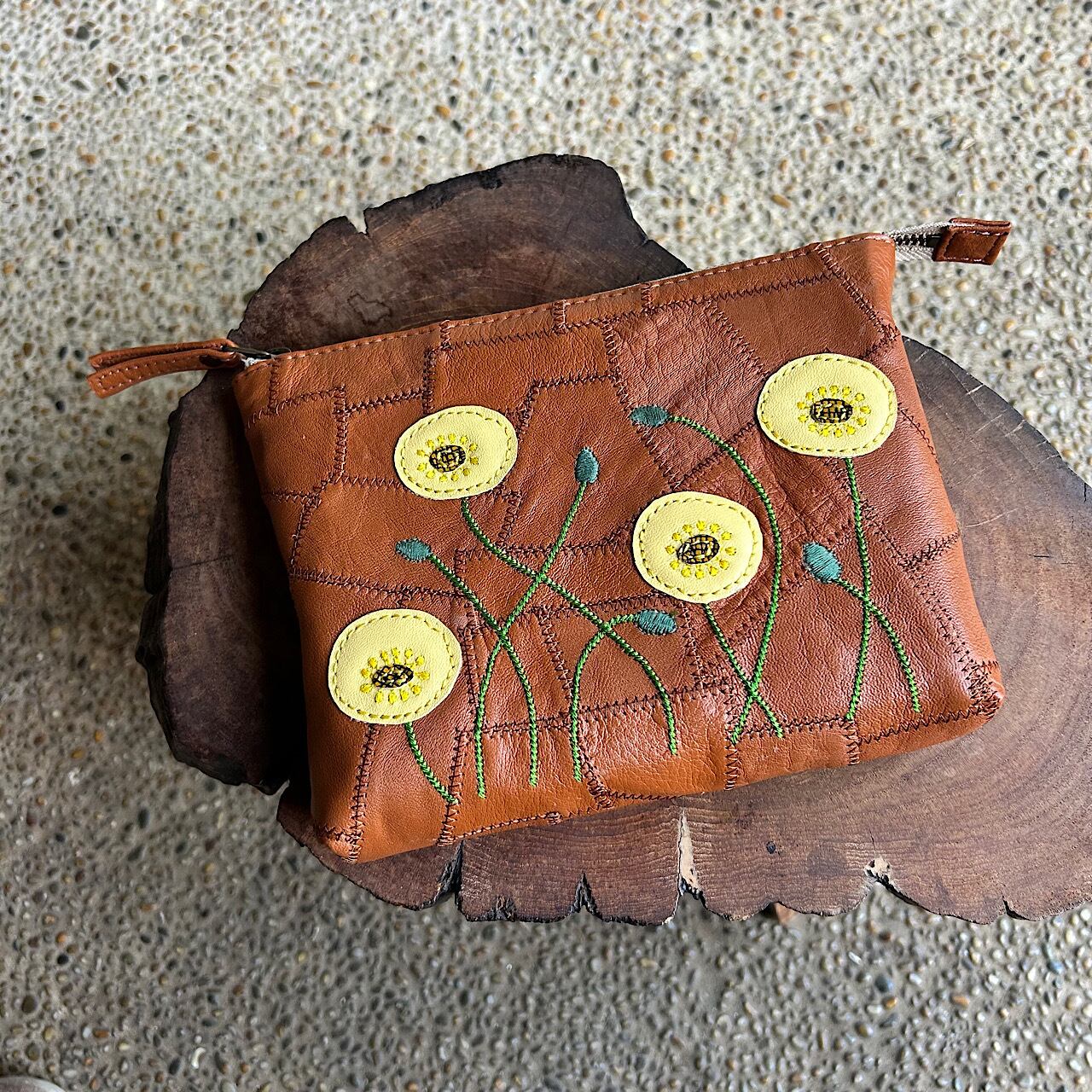 クレイジーキルトを革で施しファスナーポーチを作りました。