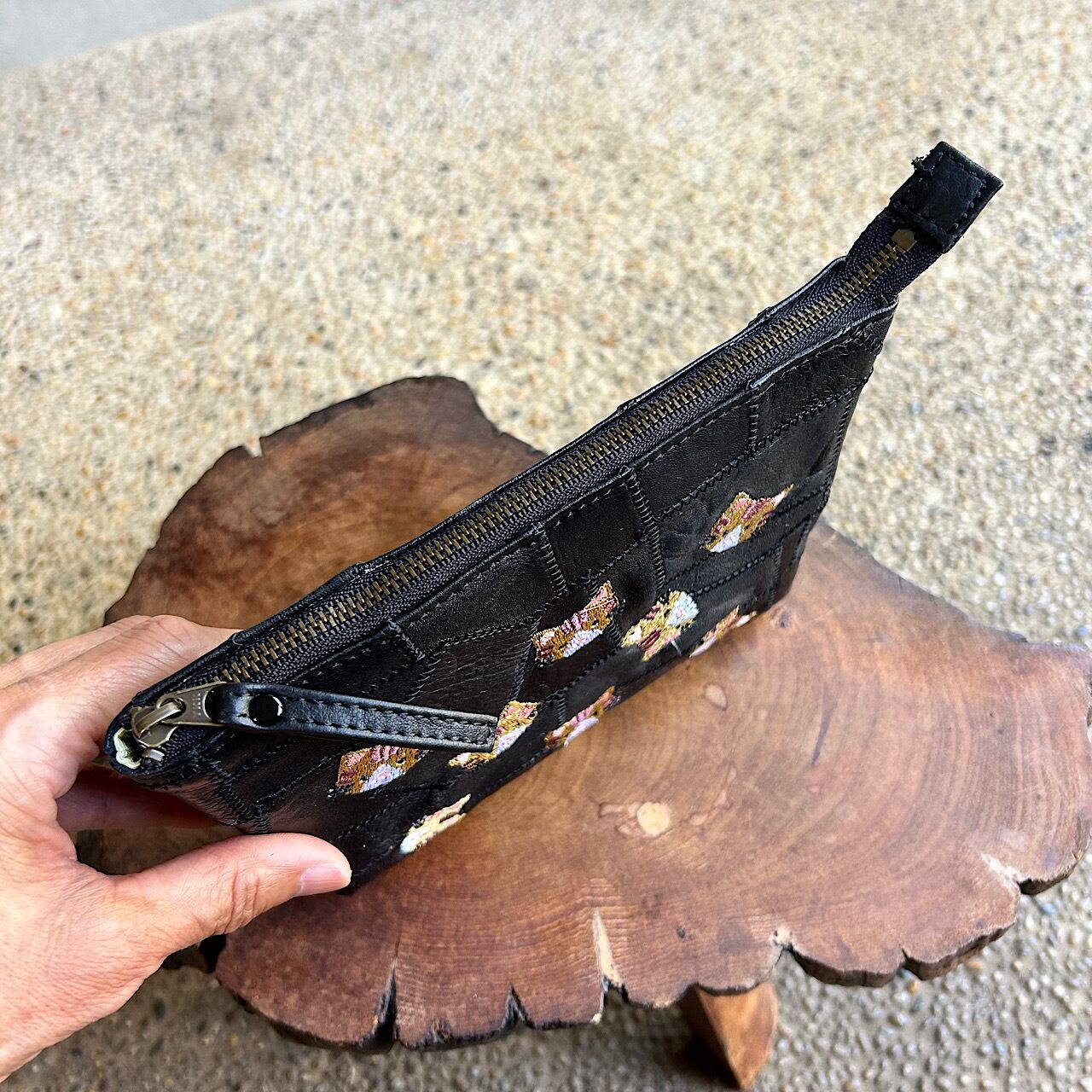 革パッチワークのファスナーポーチ(黒の革+トラ猫の刺繍)03008-22