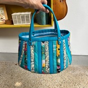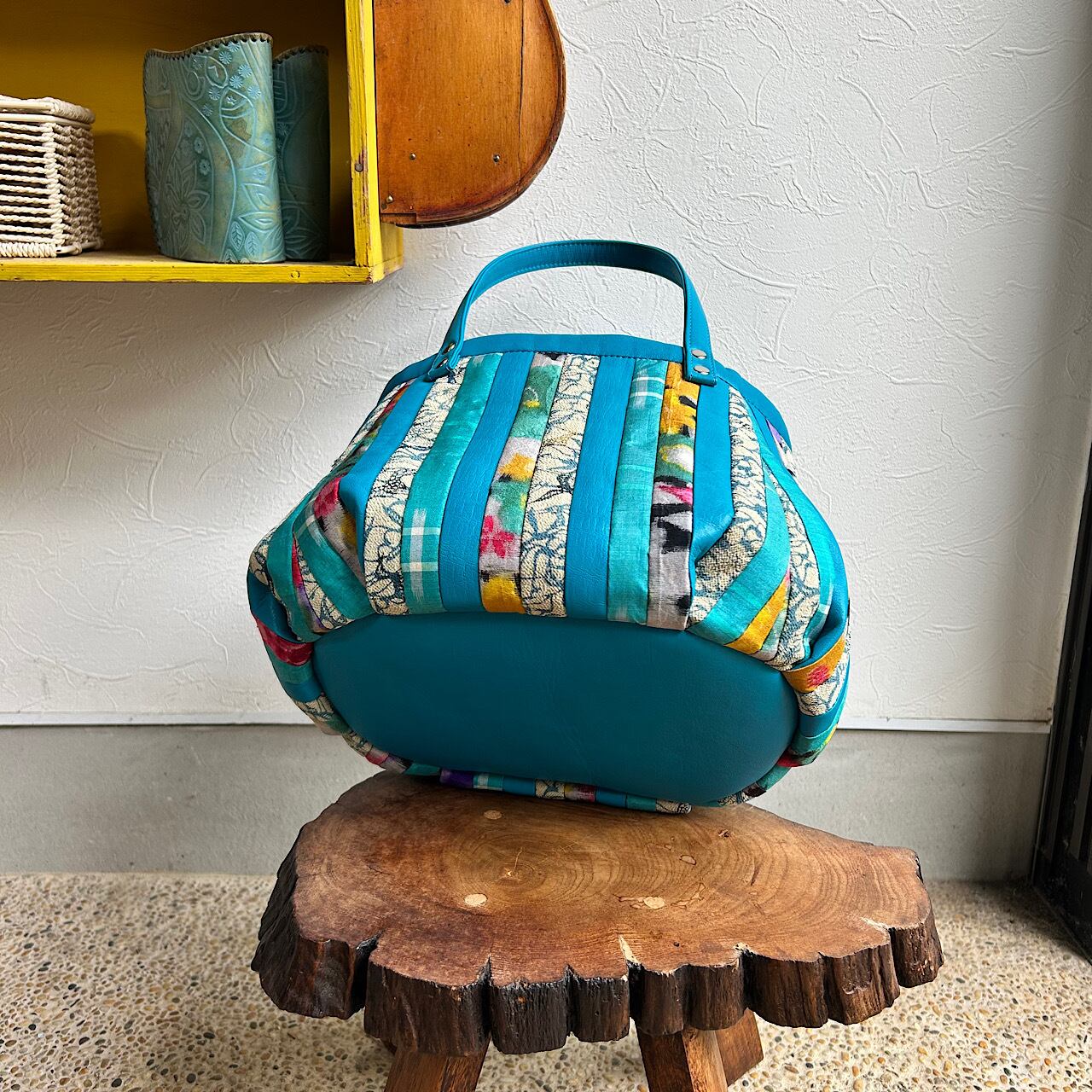新色のスカイブルーの牛革と銘仙などと共にパッチワークをして爽やかなバッグが出来ました。