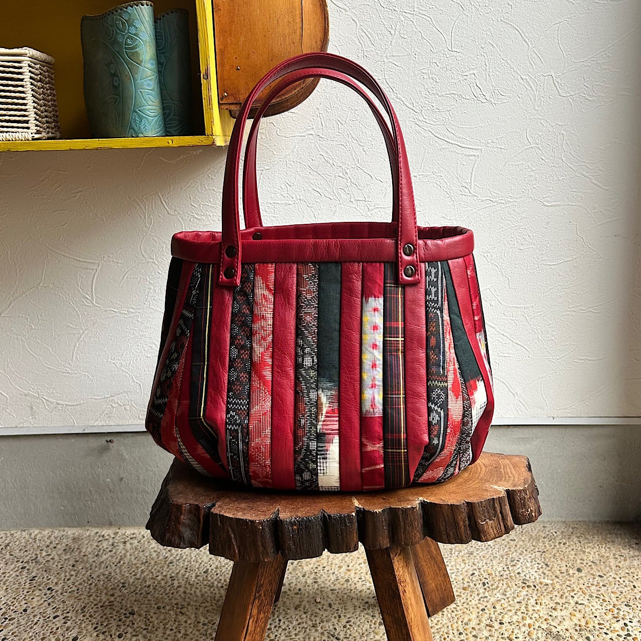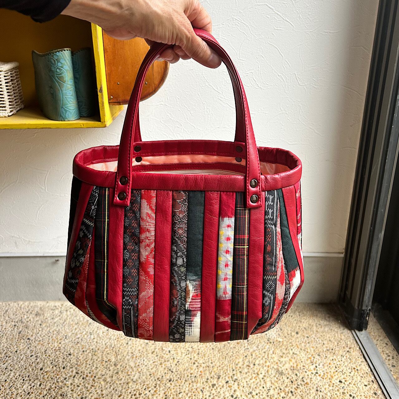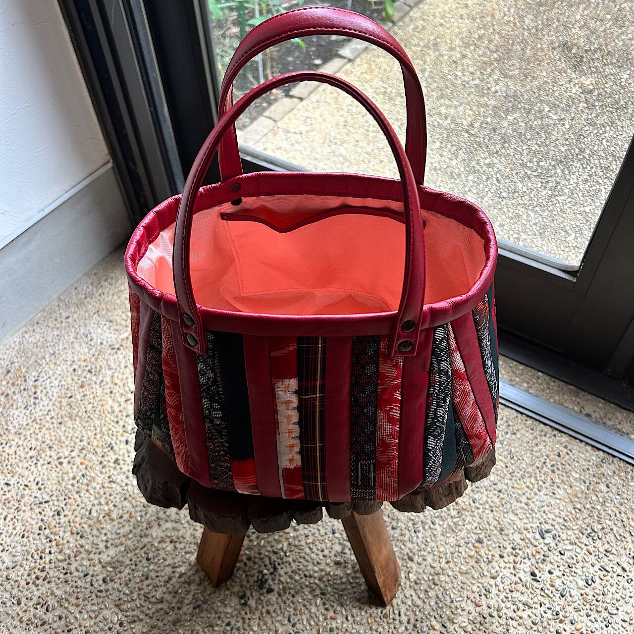 着物リメイクバッグ。今回は赤黒基調の色合わせにしました。