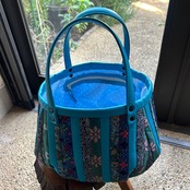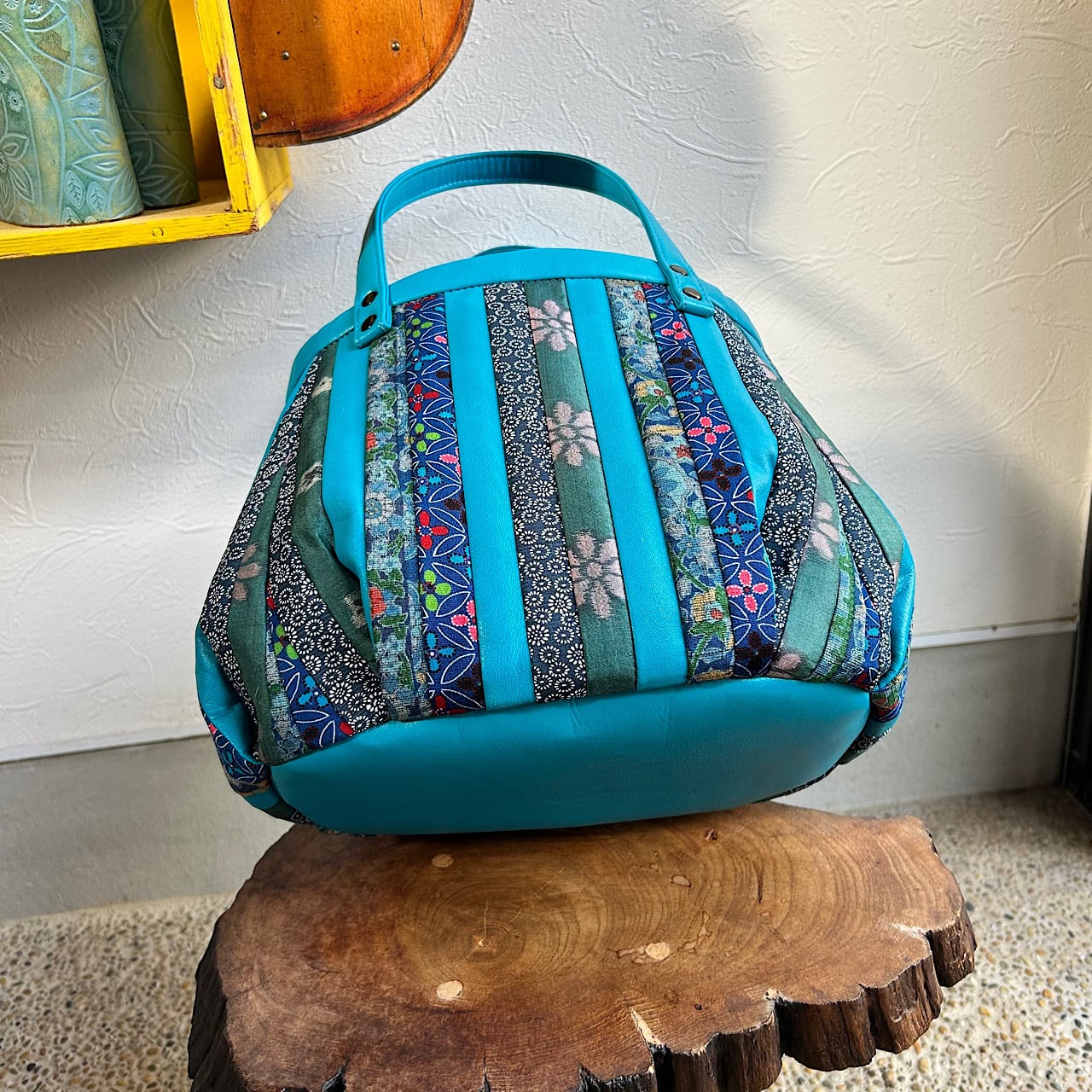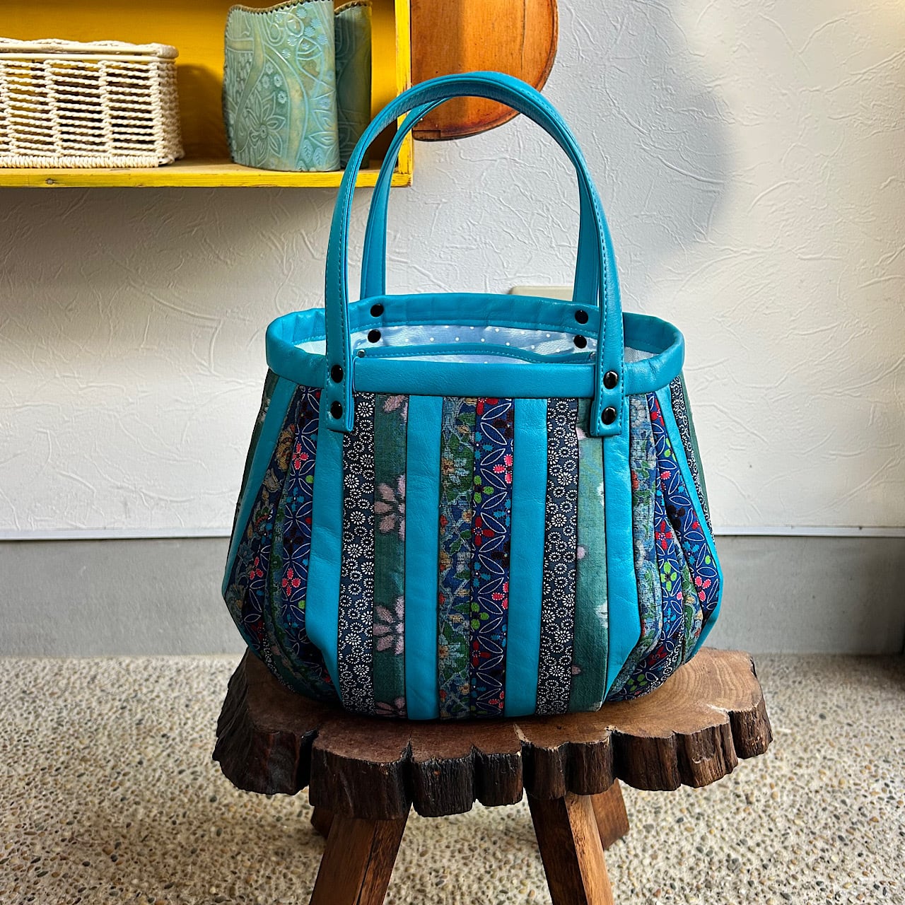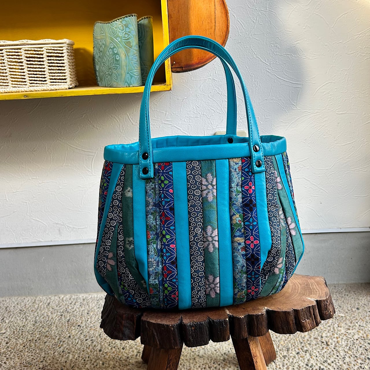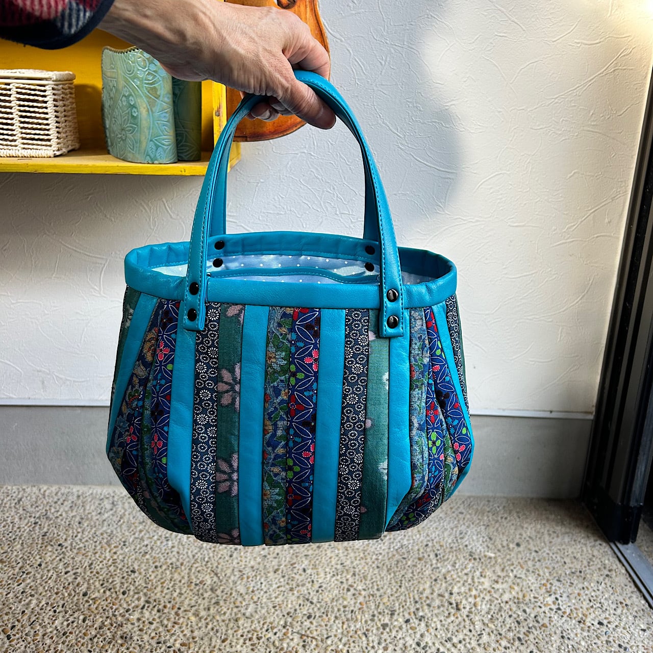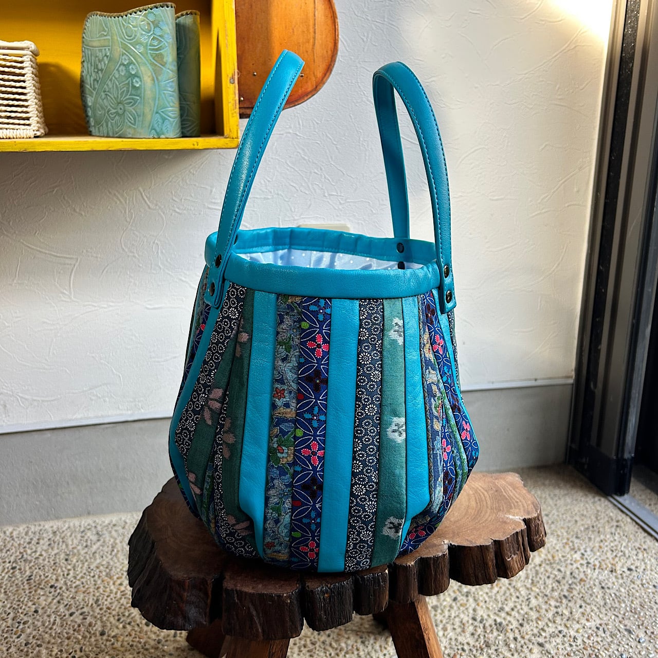スカイブルーの牛革と着物の生地(古布)でパッチワークをして作りました。