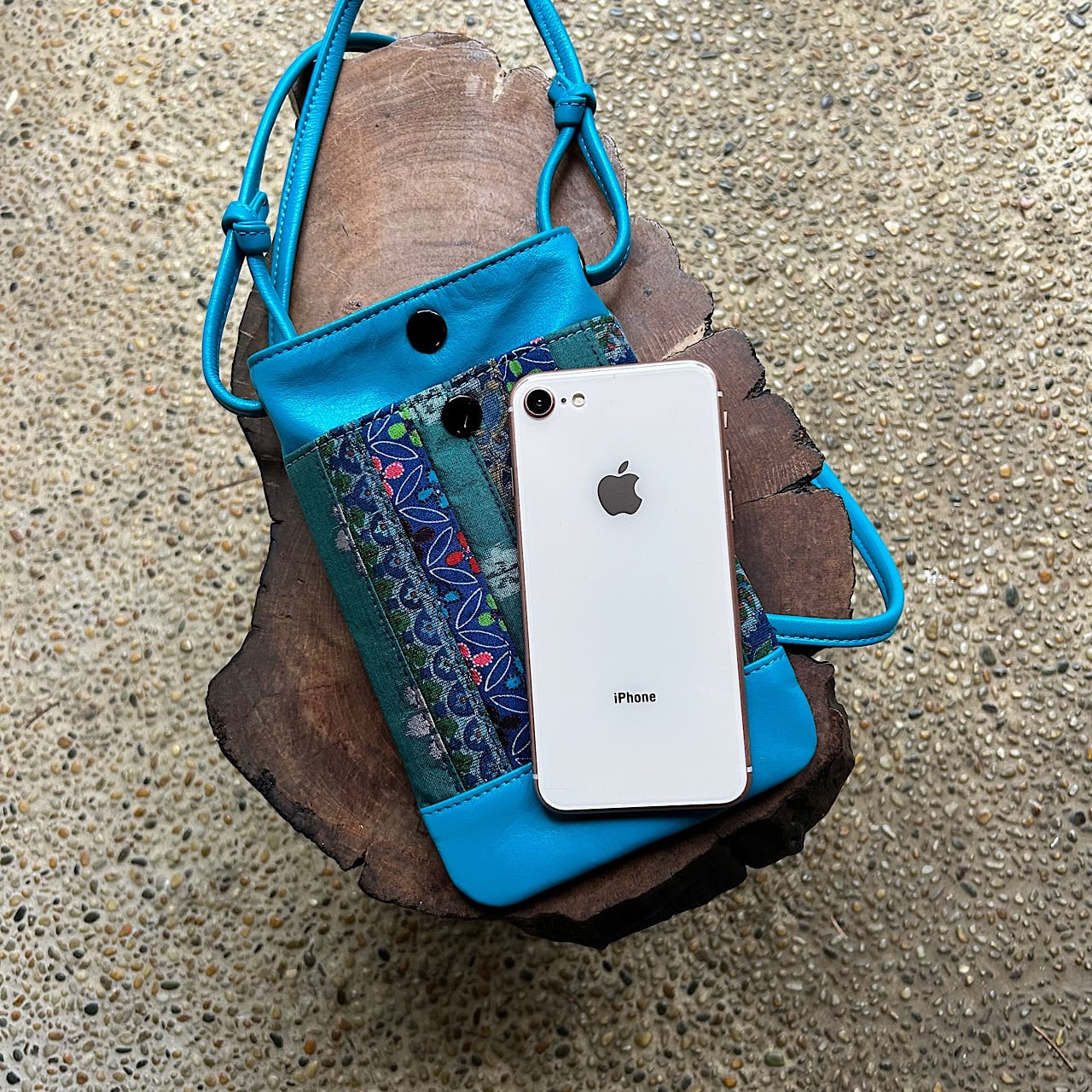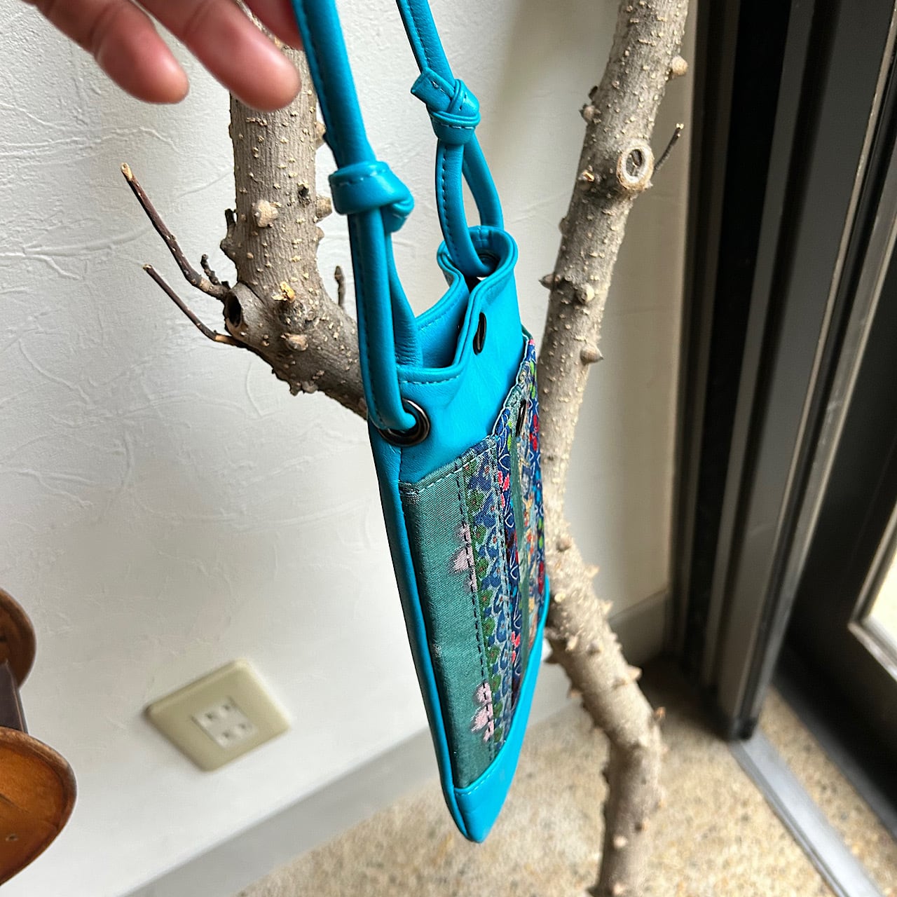 スカイブルーの牛革と着物生地のパッチワークと刺し子を組ませて作りました。