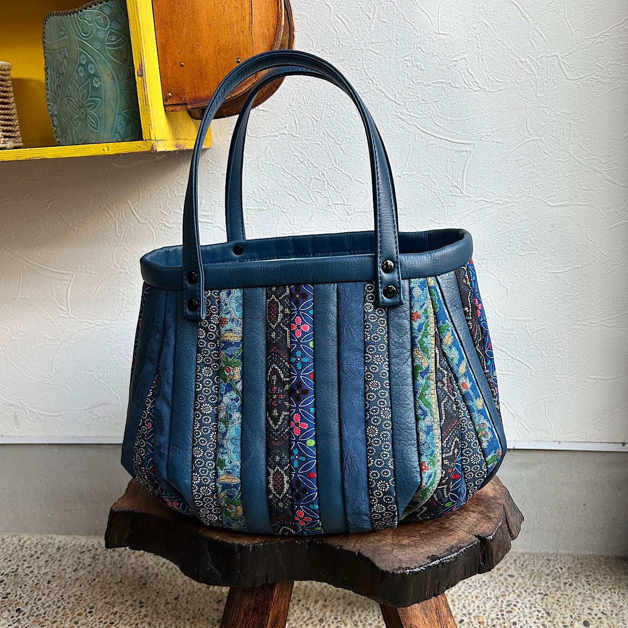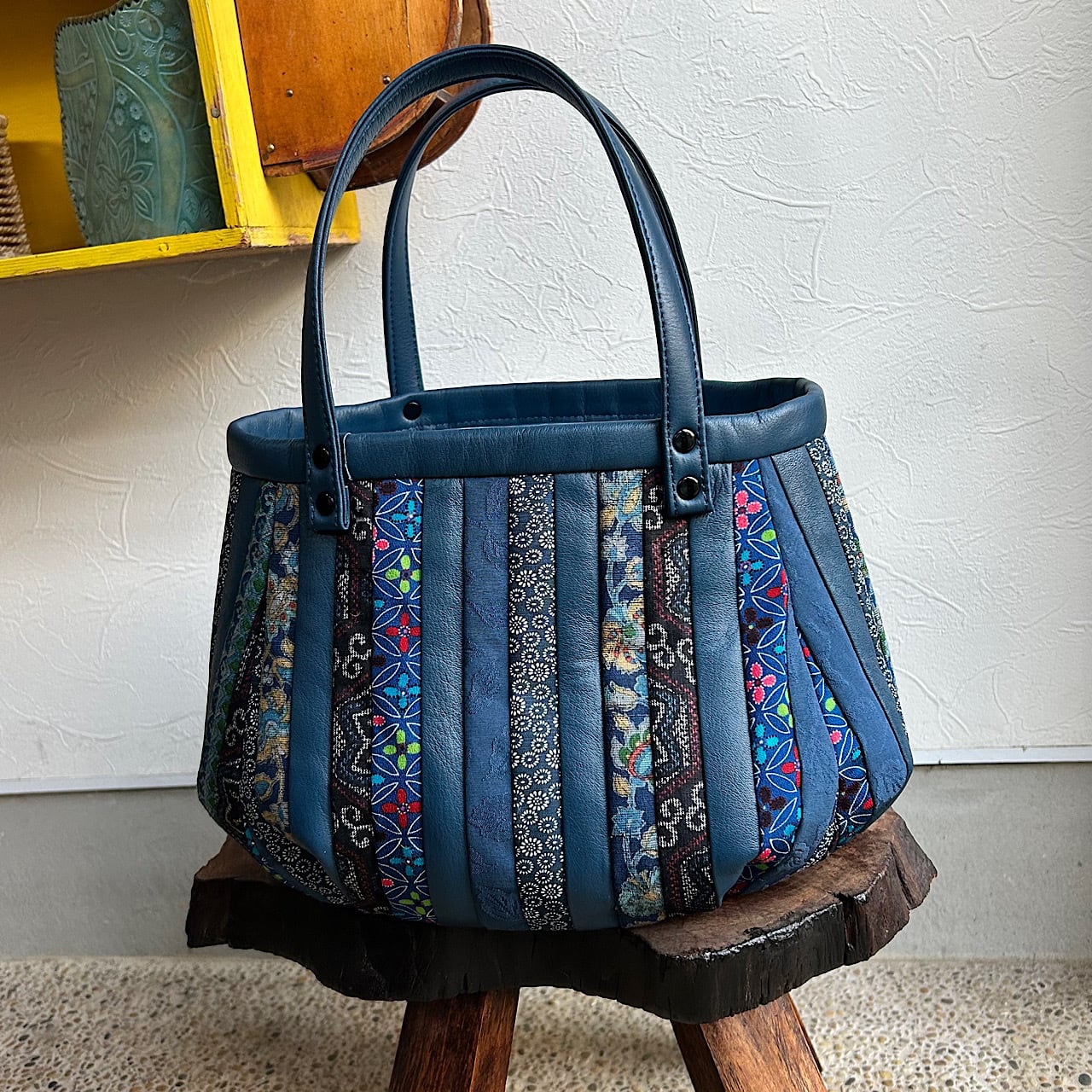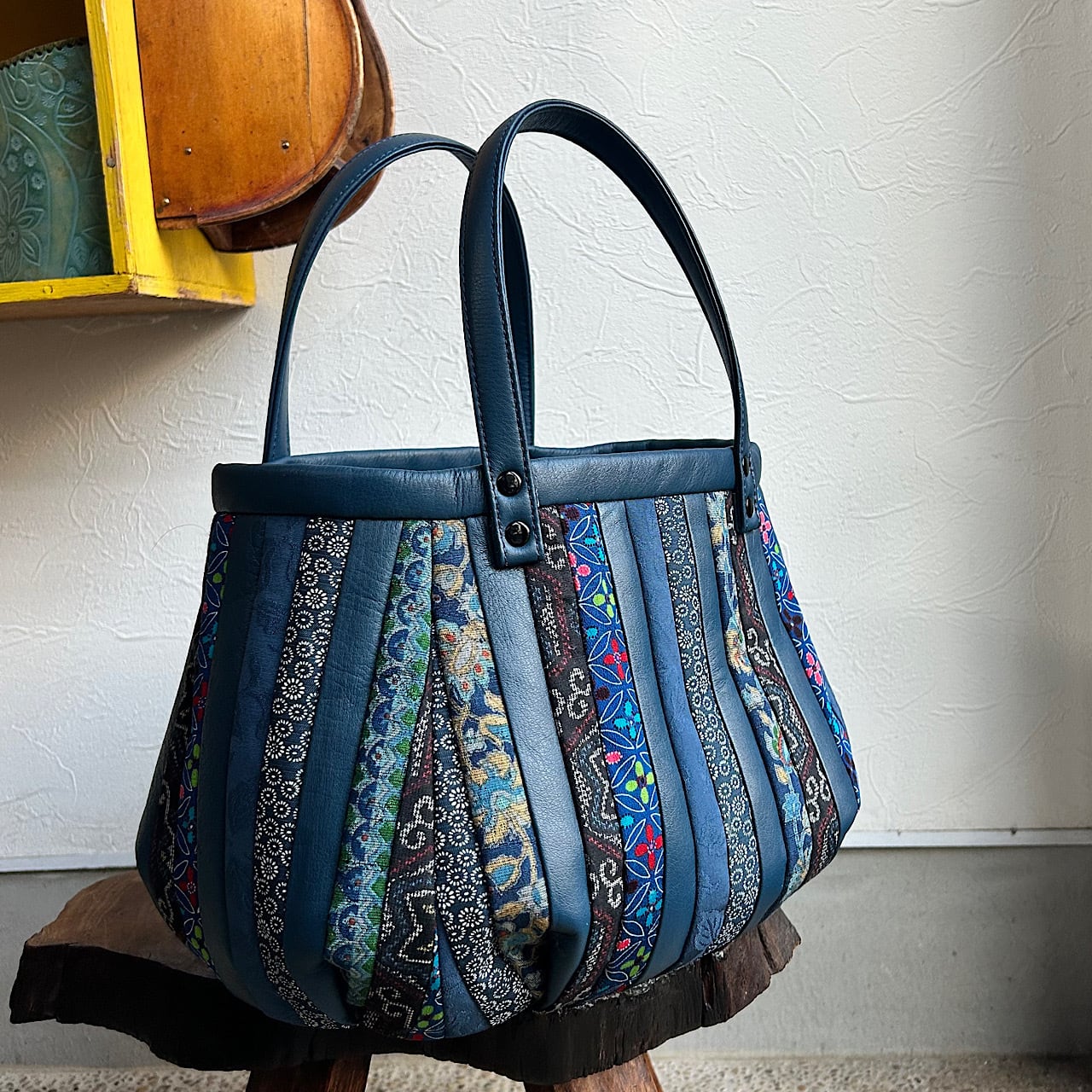 革と古布のパッチワークバッグ(ネイビーの革+着物生地)01016-124
