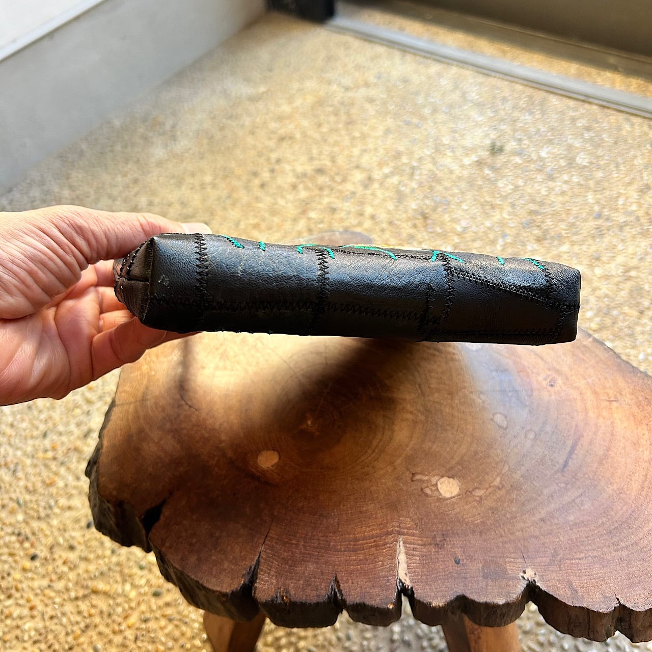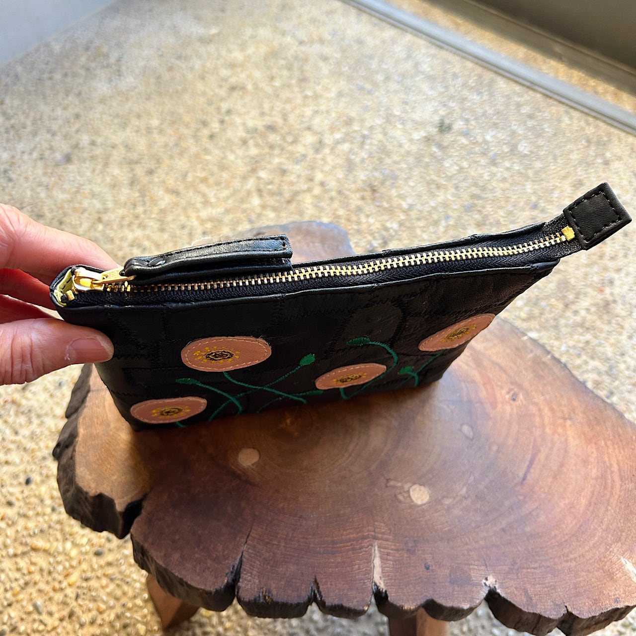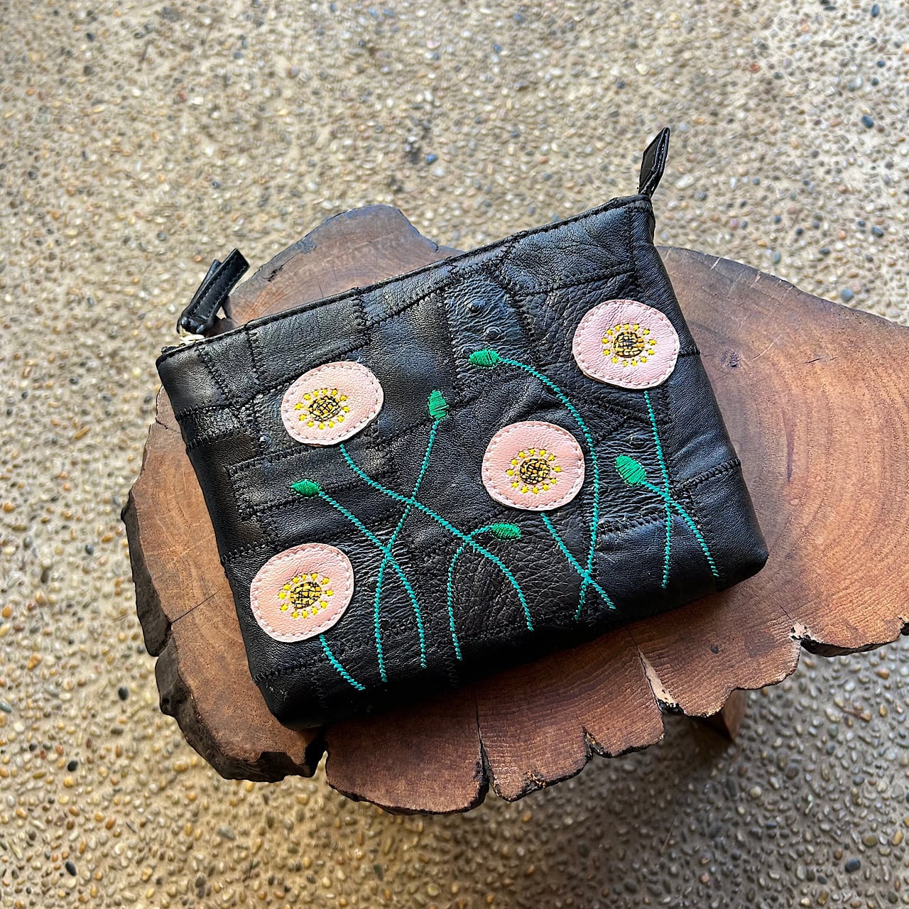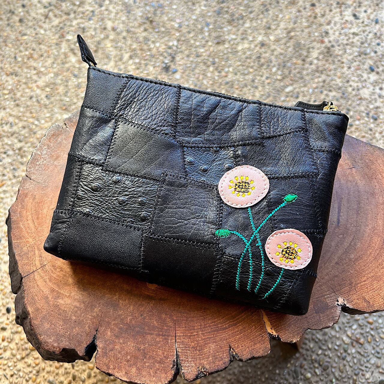 クレイジーキルトを革で施しファスナーポーチを作りました。