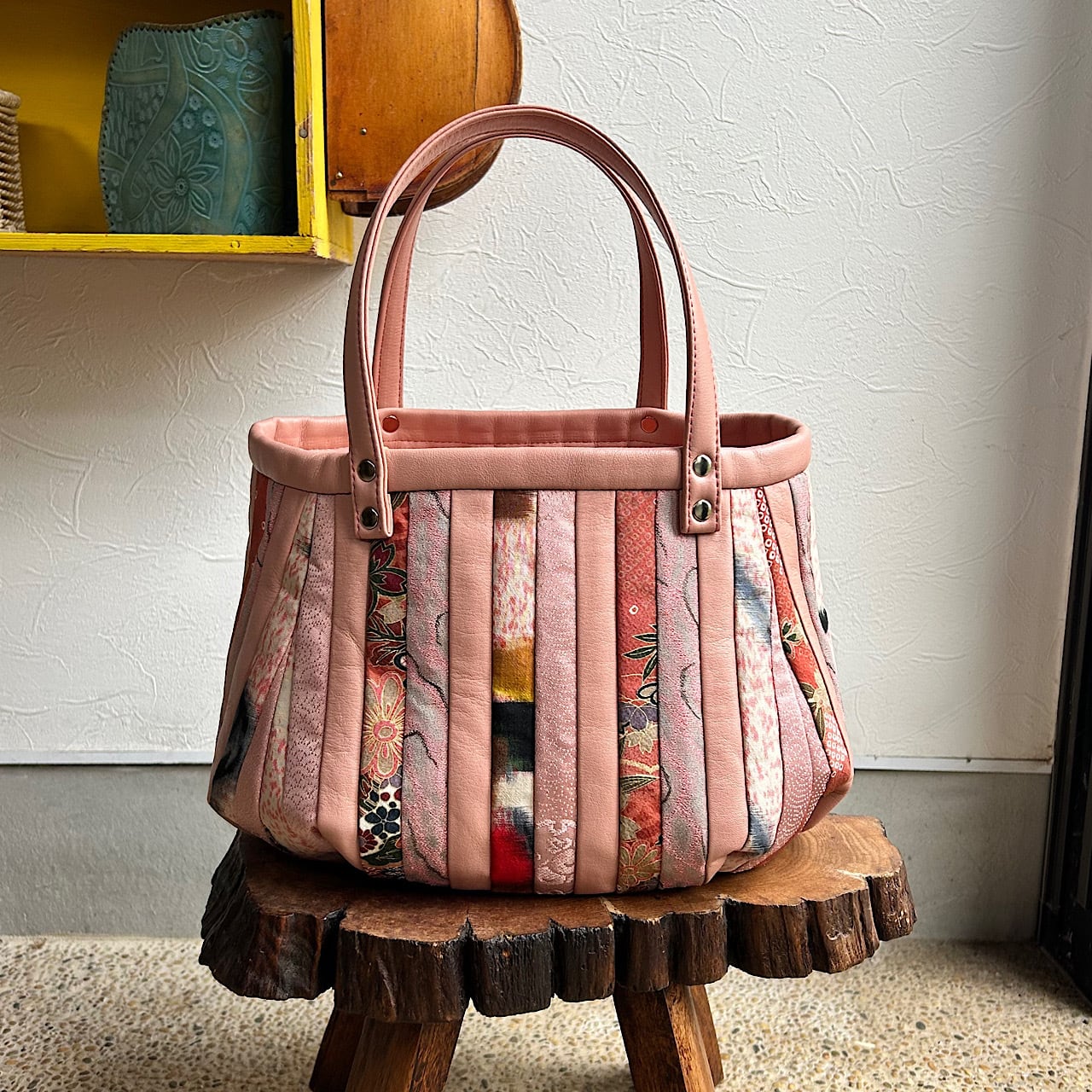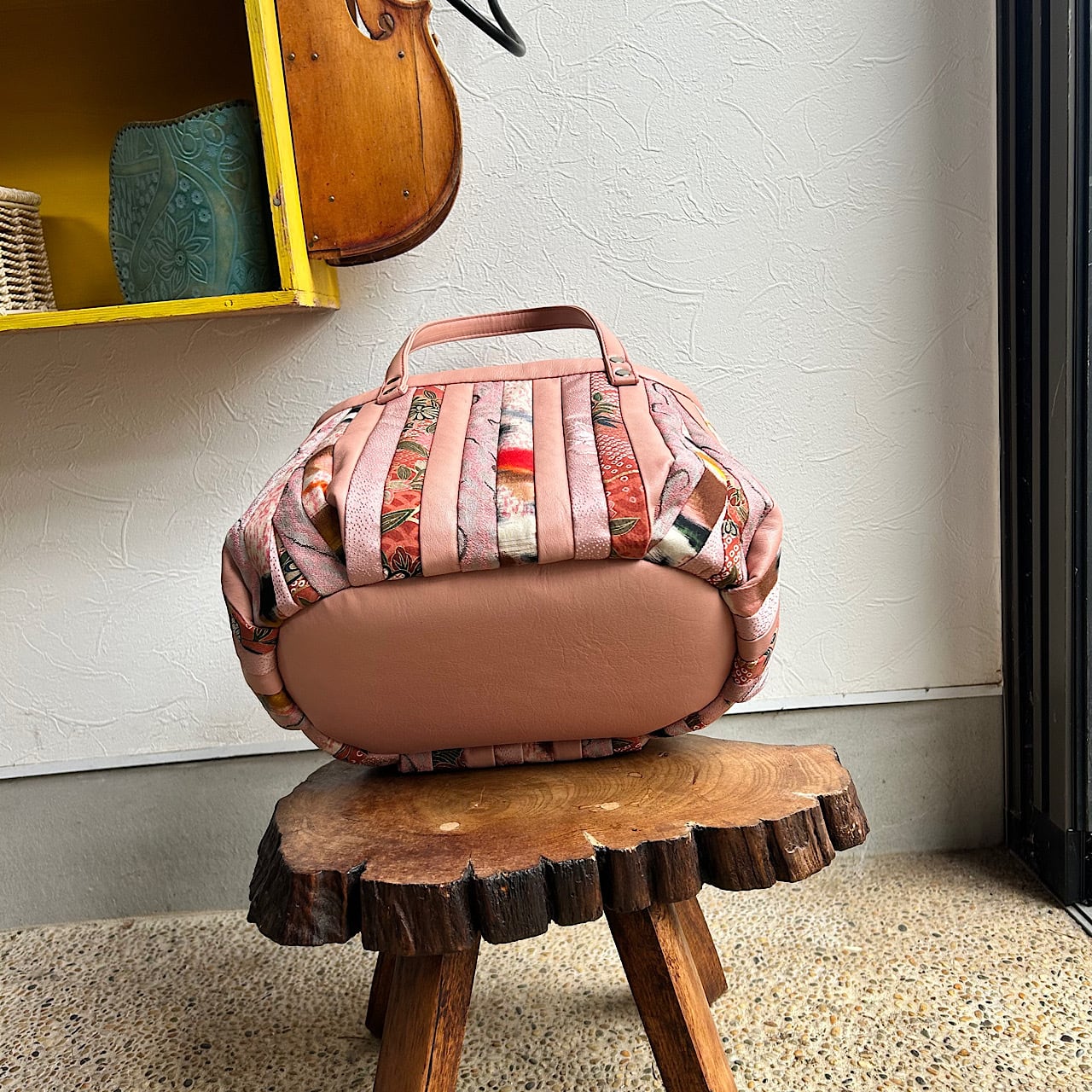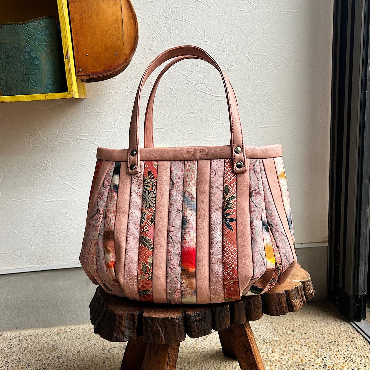 ピンクの牛革と着物の生地(古布)でパッチワークをして作りました。