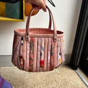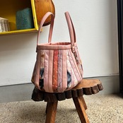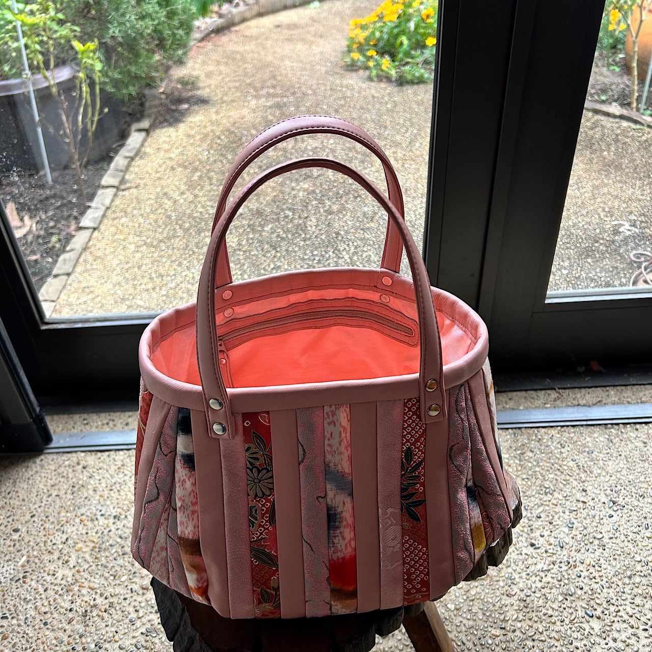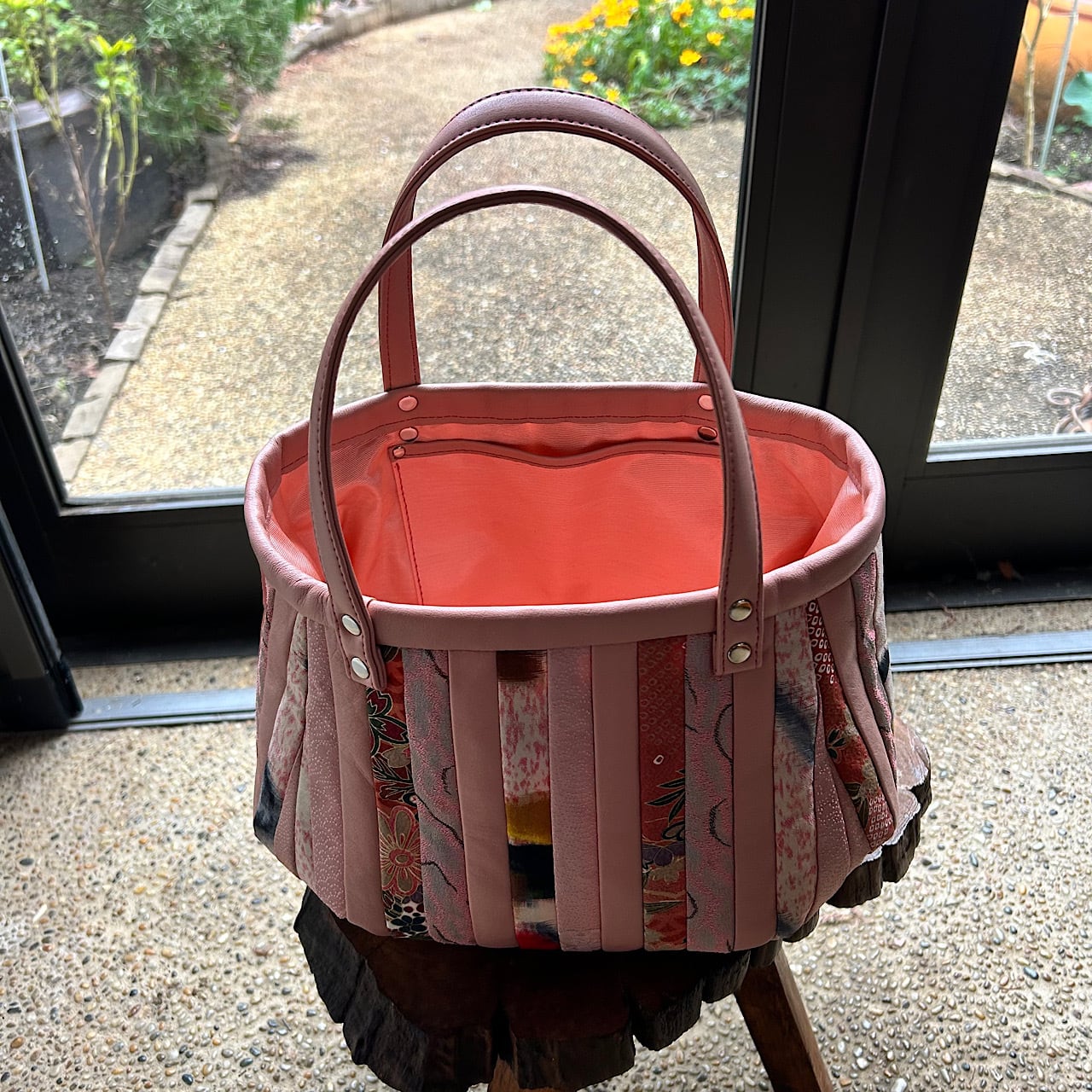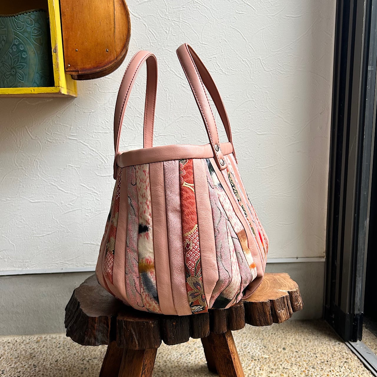 ピンクの牛革と着物の生地(古布)でパッチワークをして作りました。