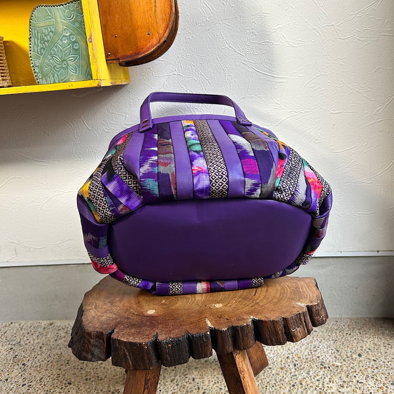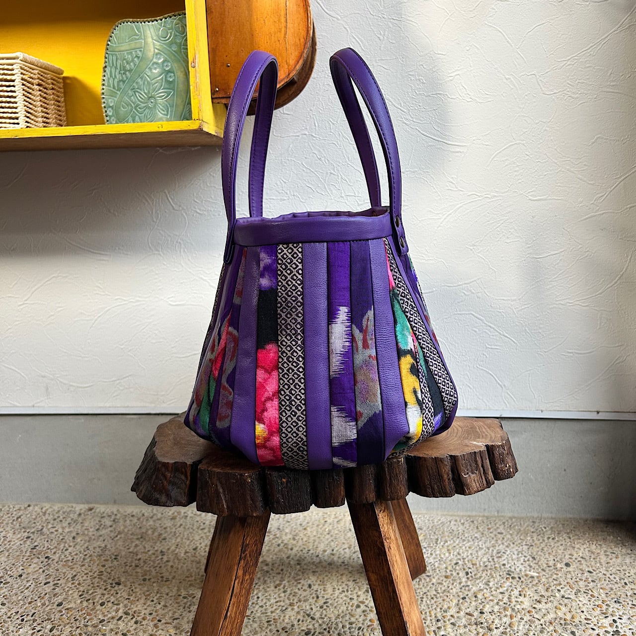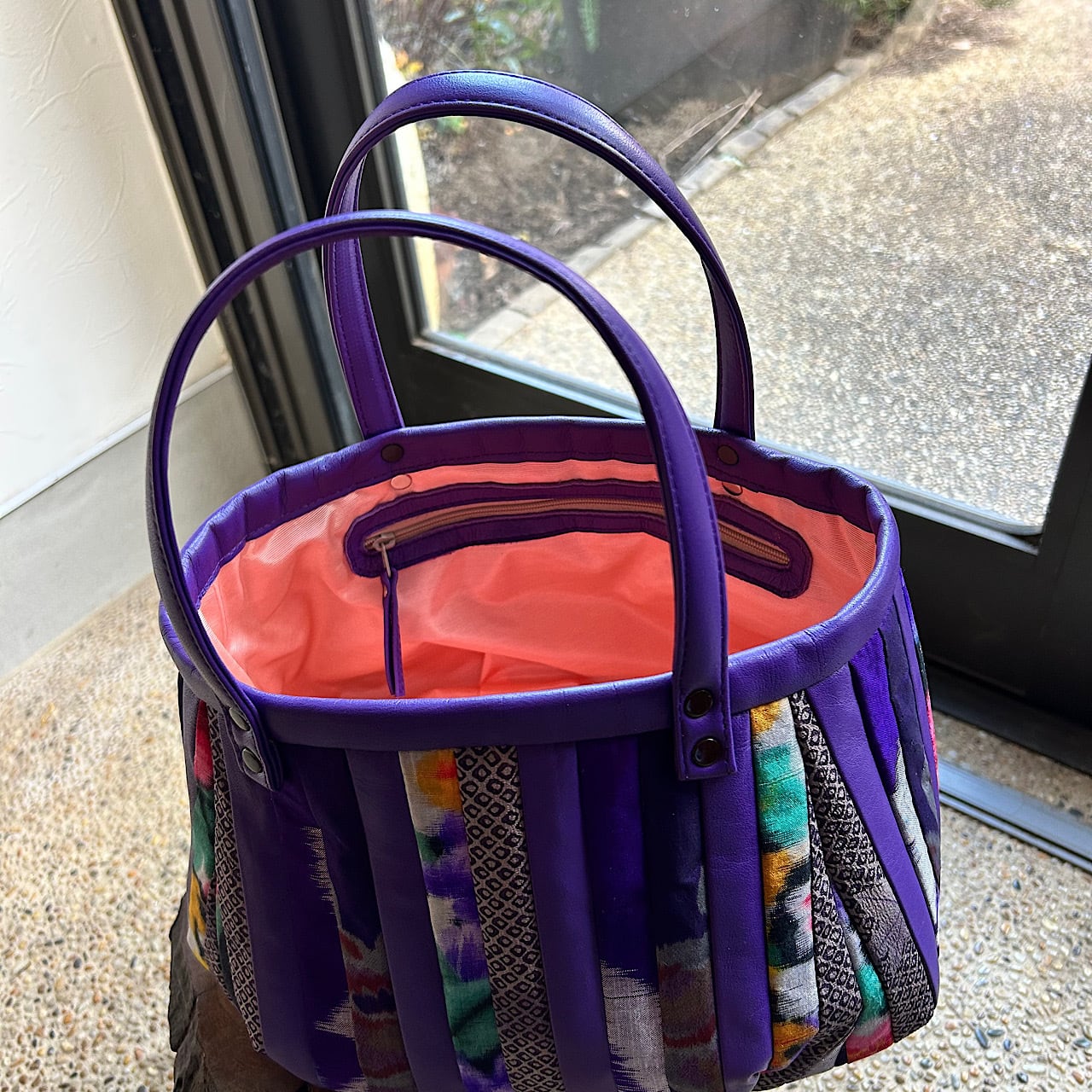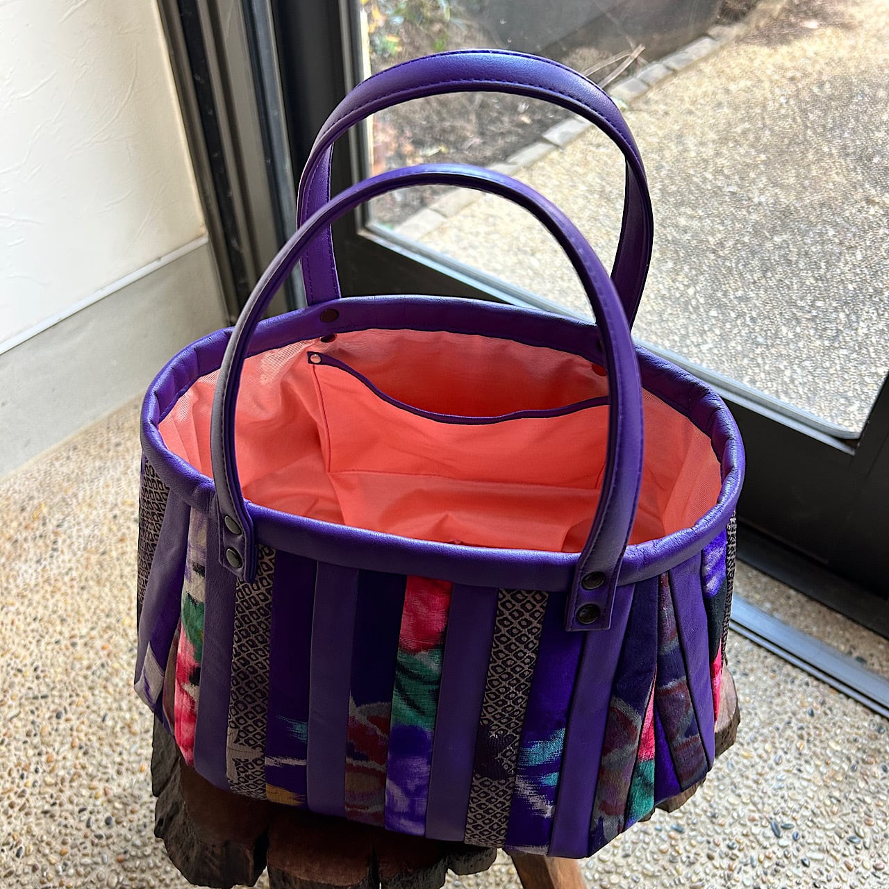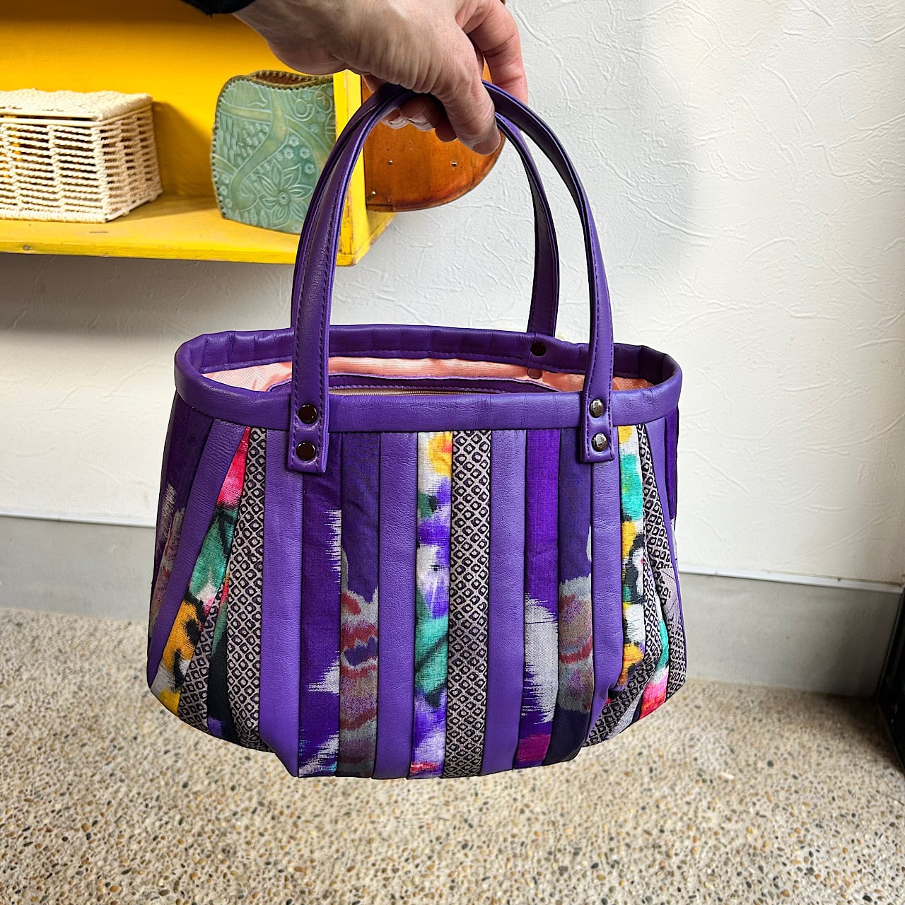 パープルの牛革と着物の生地(古布)でパッチワークをして作りました。