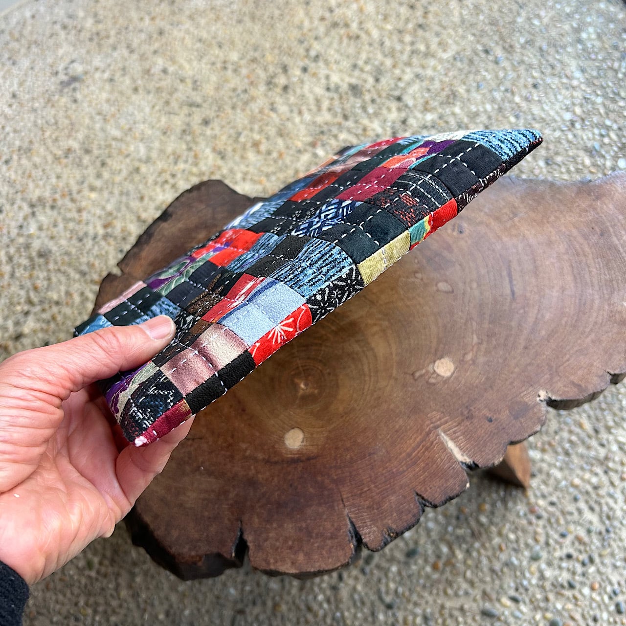 着物の生地でパッチワークと刺し子をしてファスナーポーチを作りました。