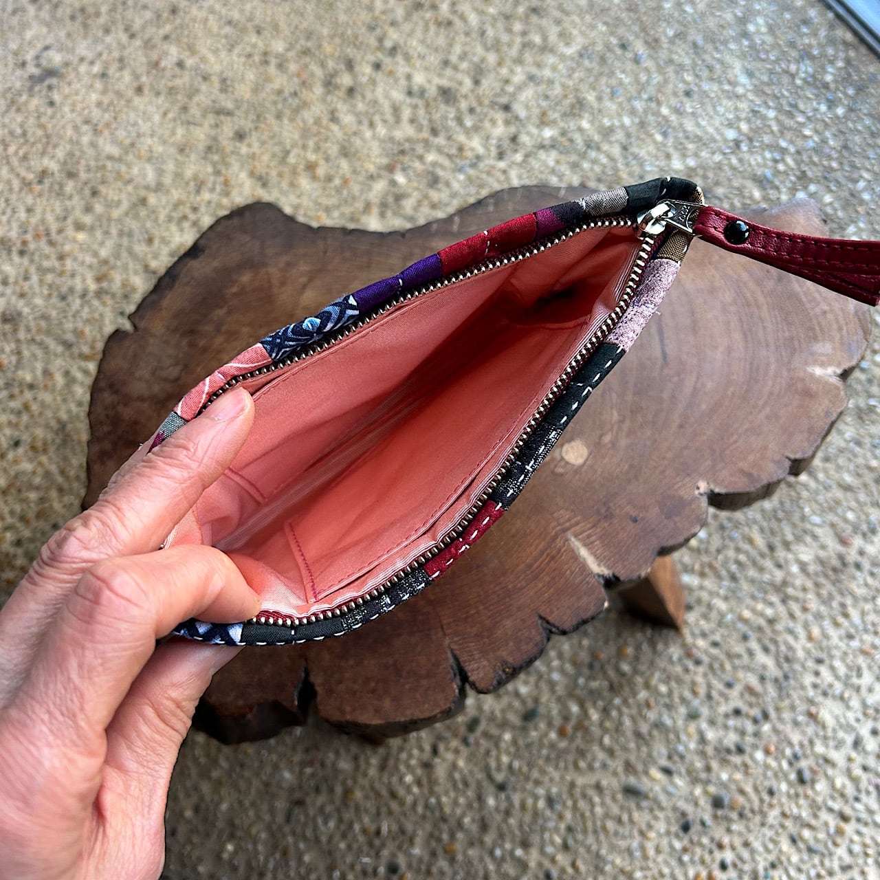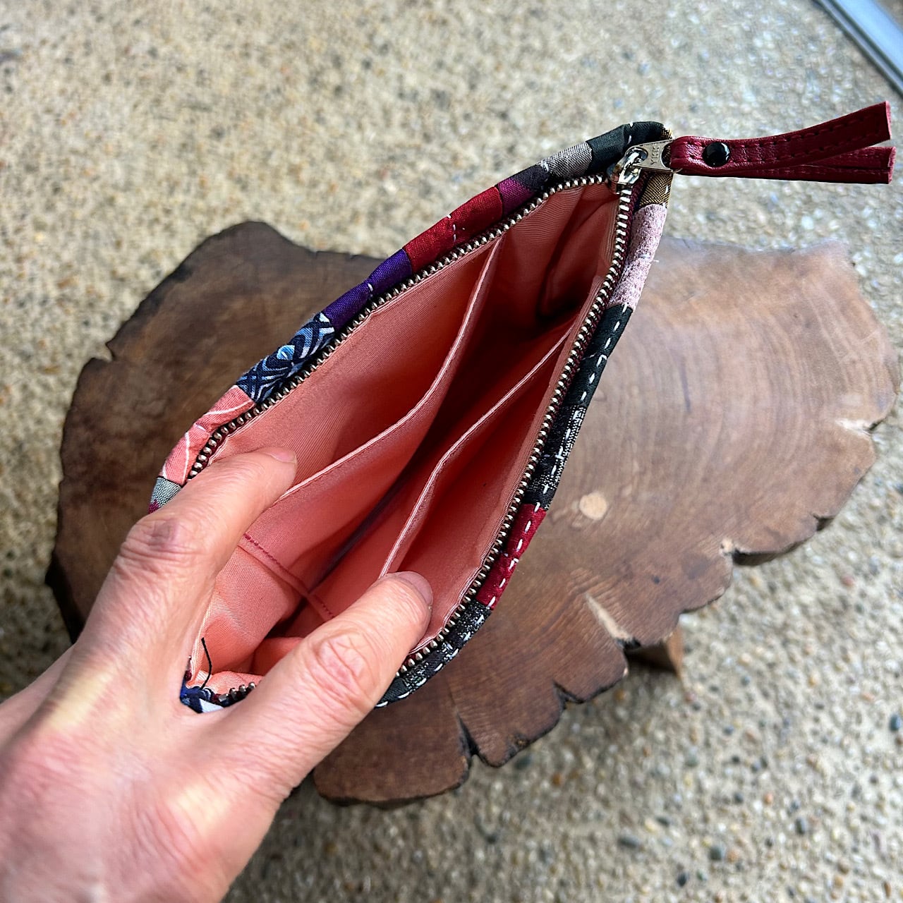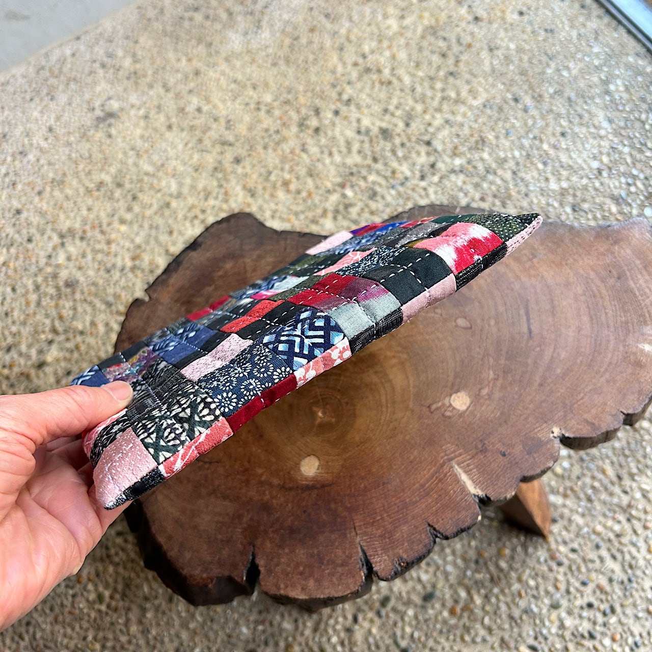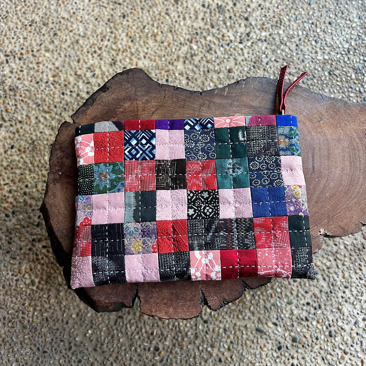 着物の生地でパッチワークと刺し子をしてファスナーポーチを作りました。