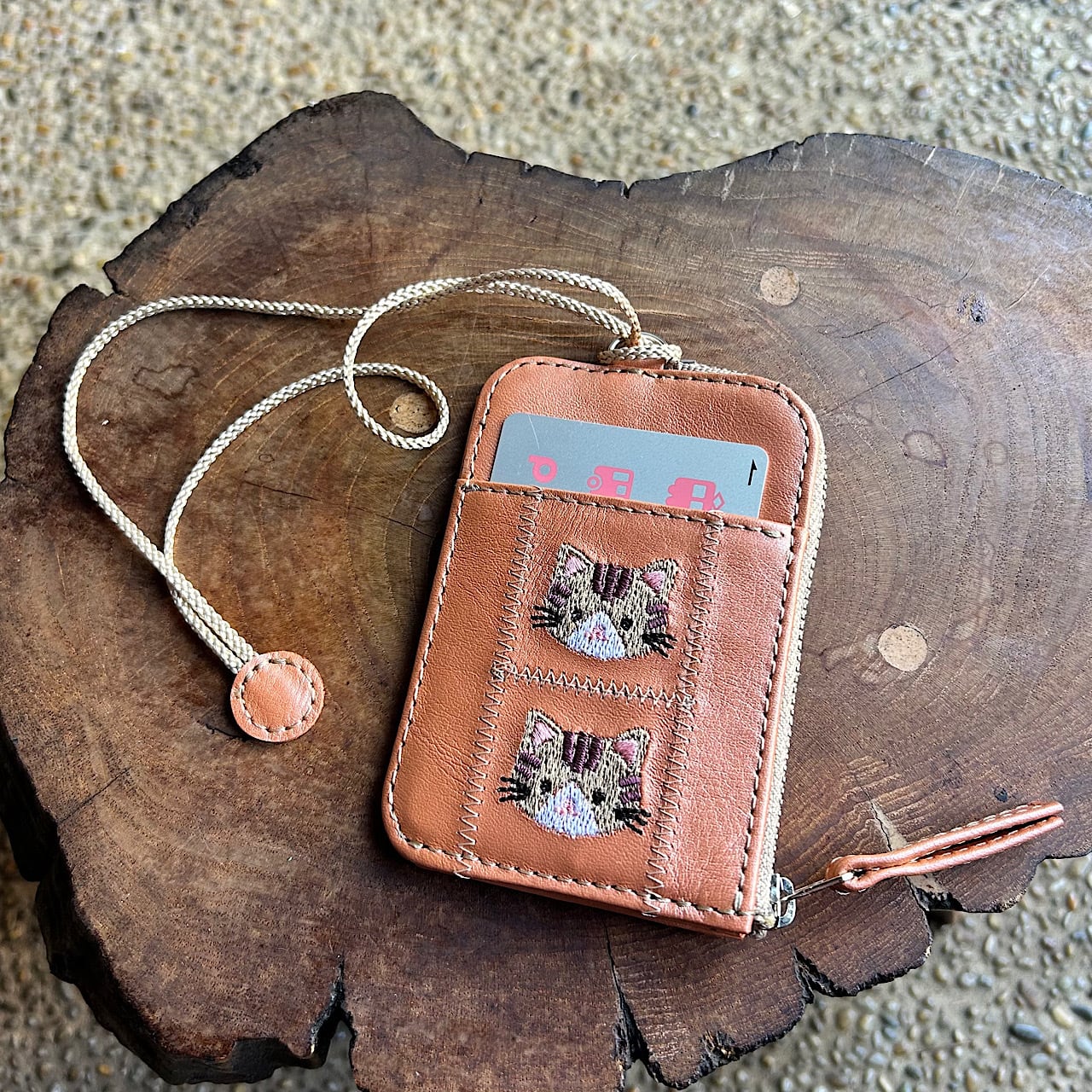 パールオレンジの牛革に茶トラ猫の刺繡を施し、パッチワークをして仕立て上げました。