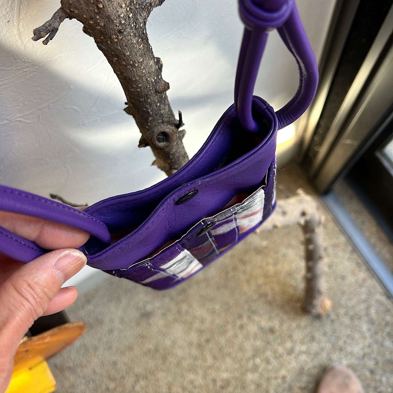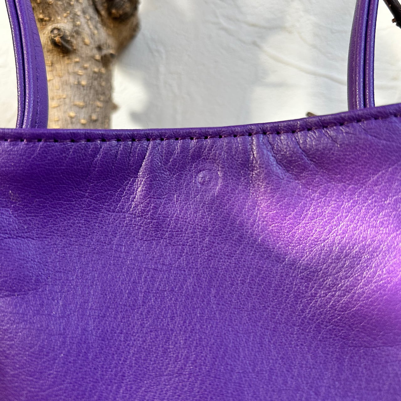 パープルの牛革と着物生地のパッチワーク、さらに刺し子を施してあります。