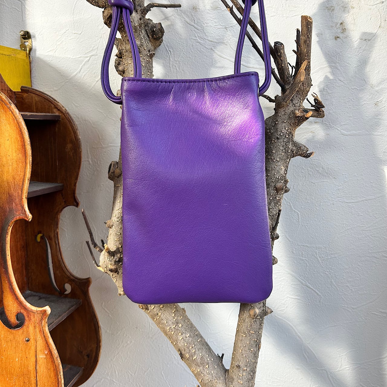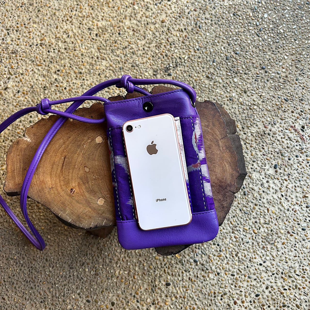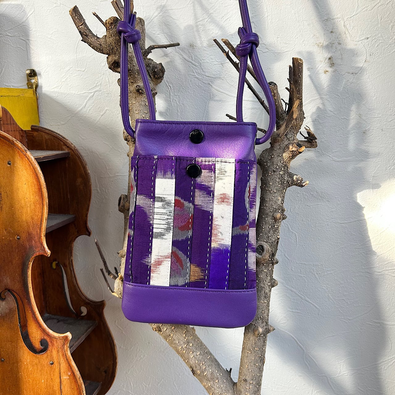 パープルの牛革と日本の伝統的な着物生地が美しく調和したスマホポシェットができました。