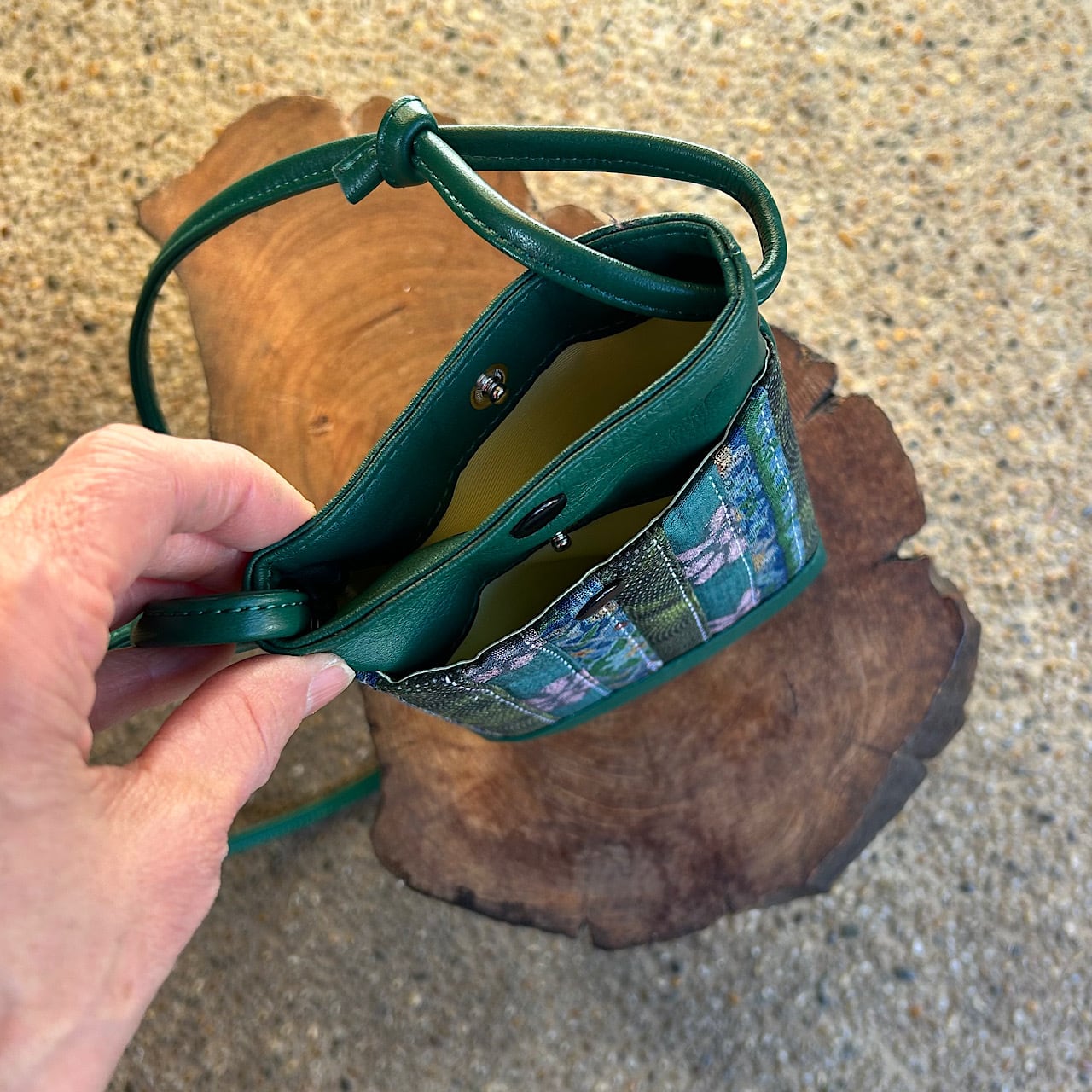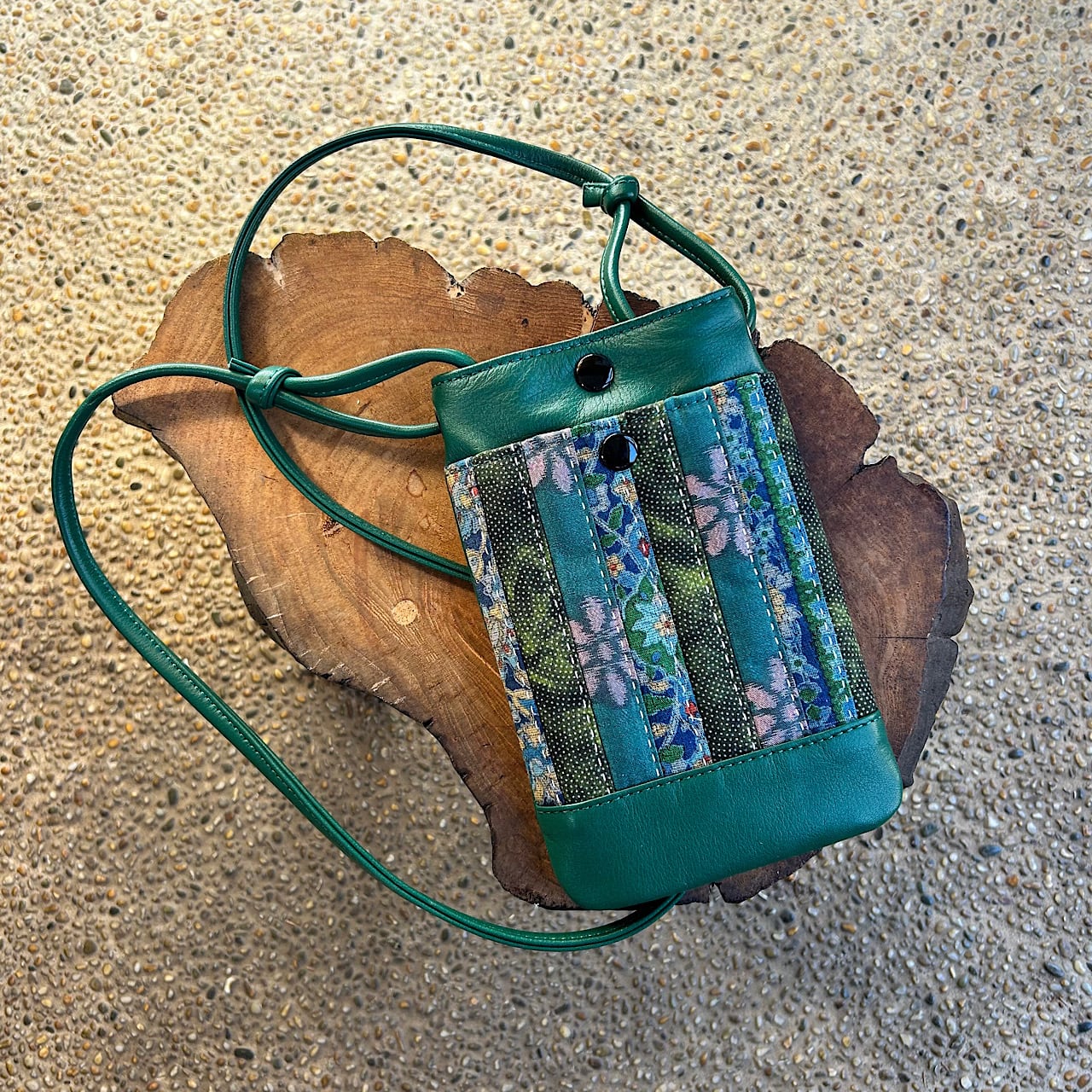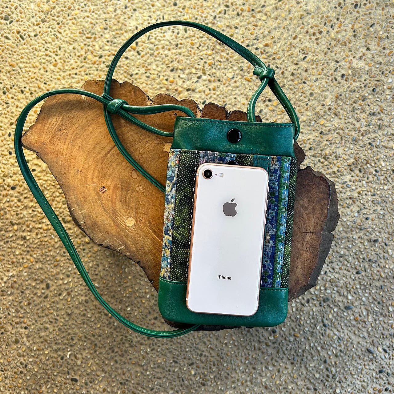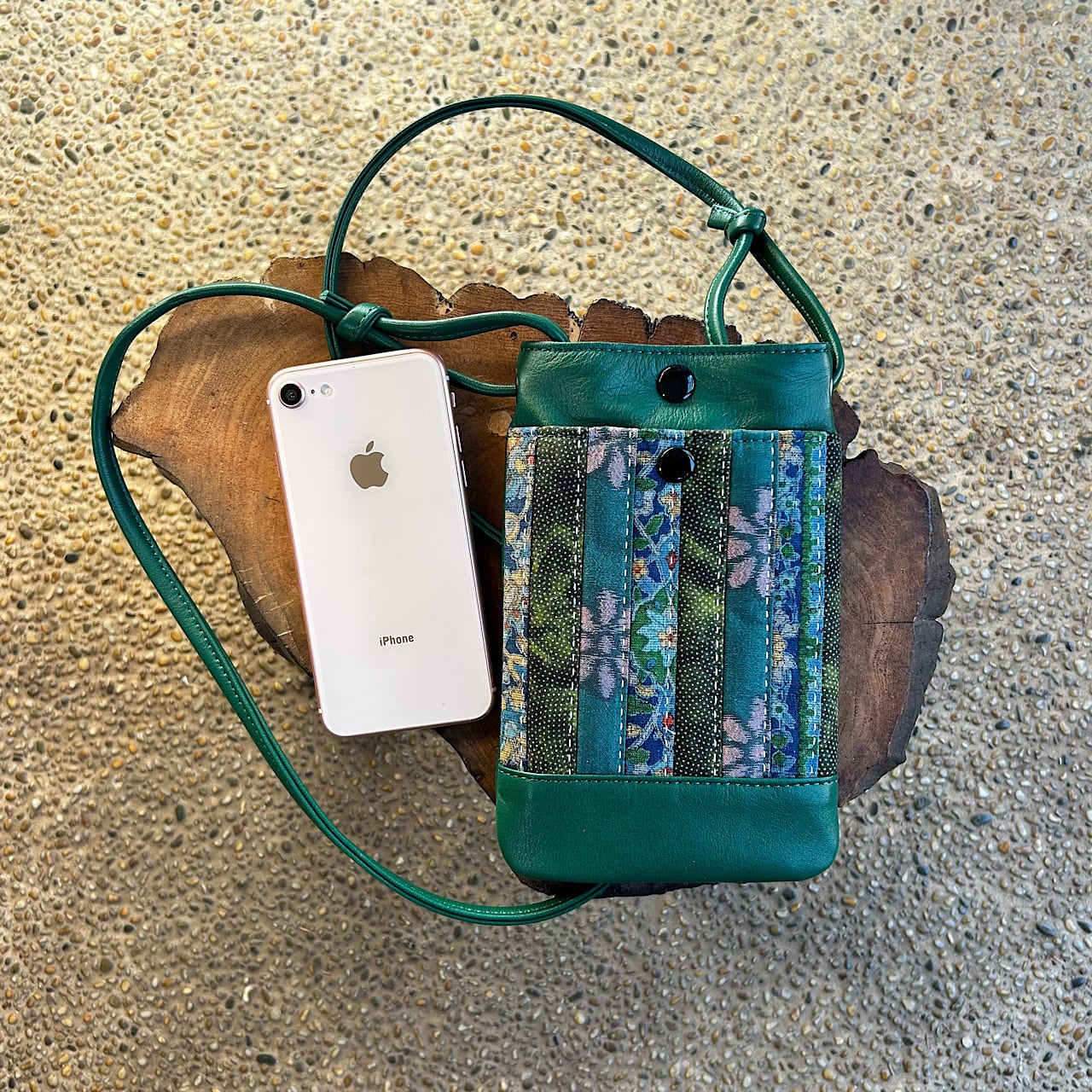 グリーンの牛革と日本の伝統的な着物生地が美しく調和したスマホポシェットができました。