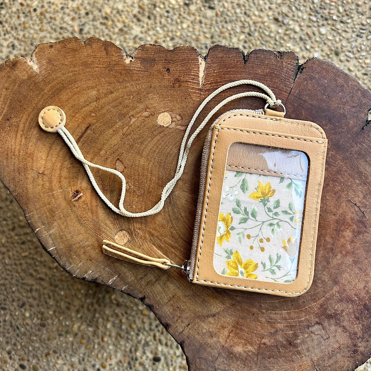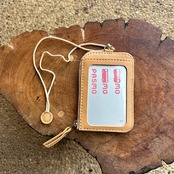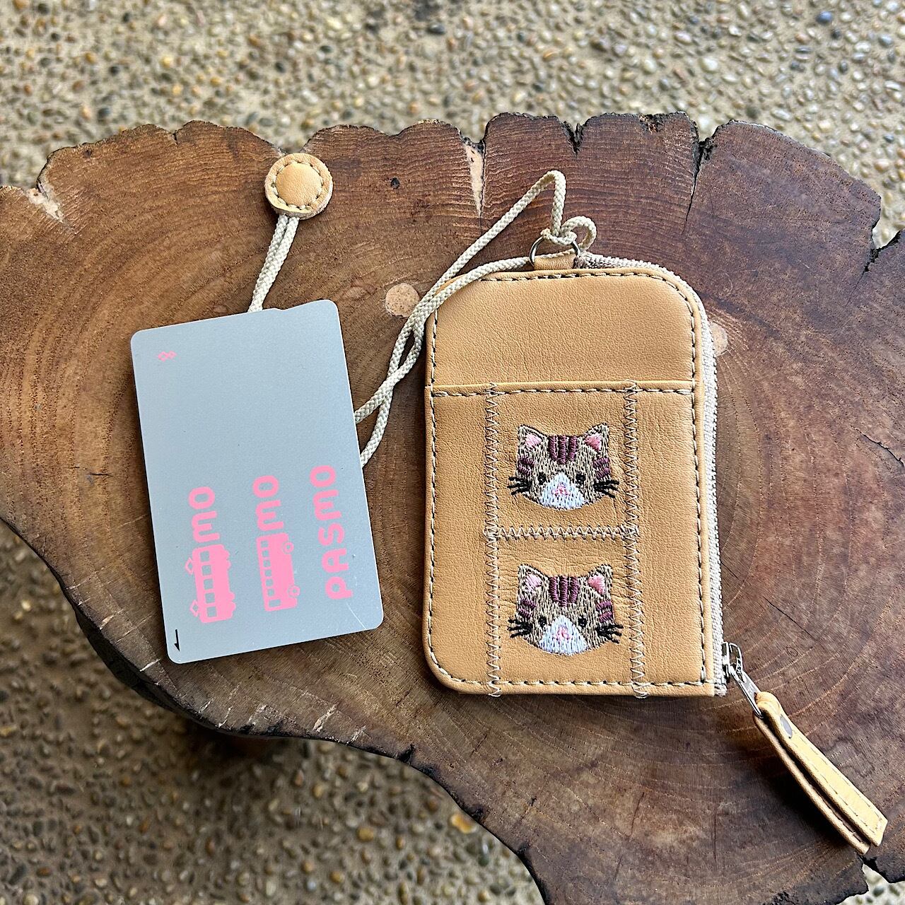 パスケース2枚用 小銭入れ付き(ベージュの革に茶トラ猫の刺繡)03003-53
