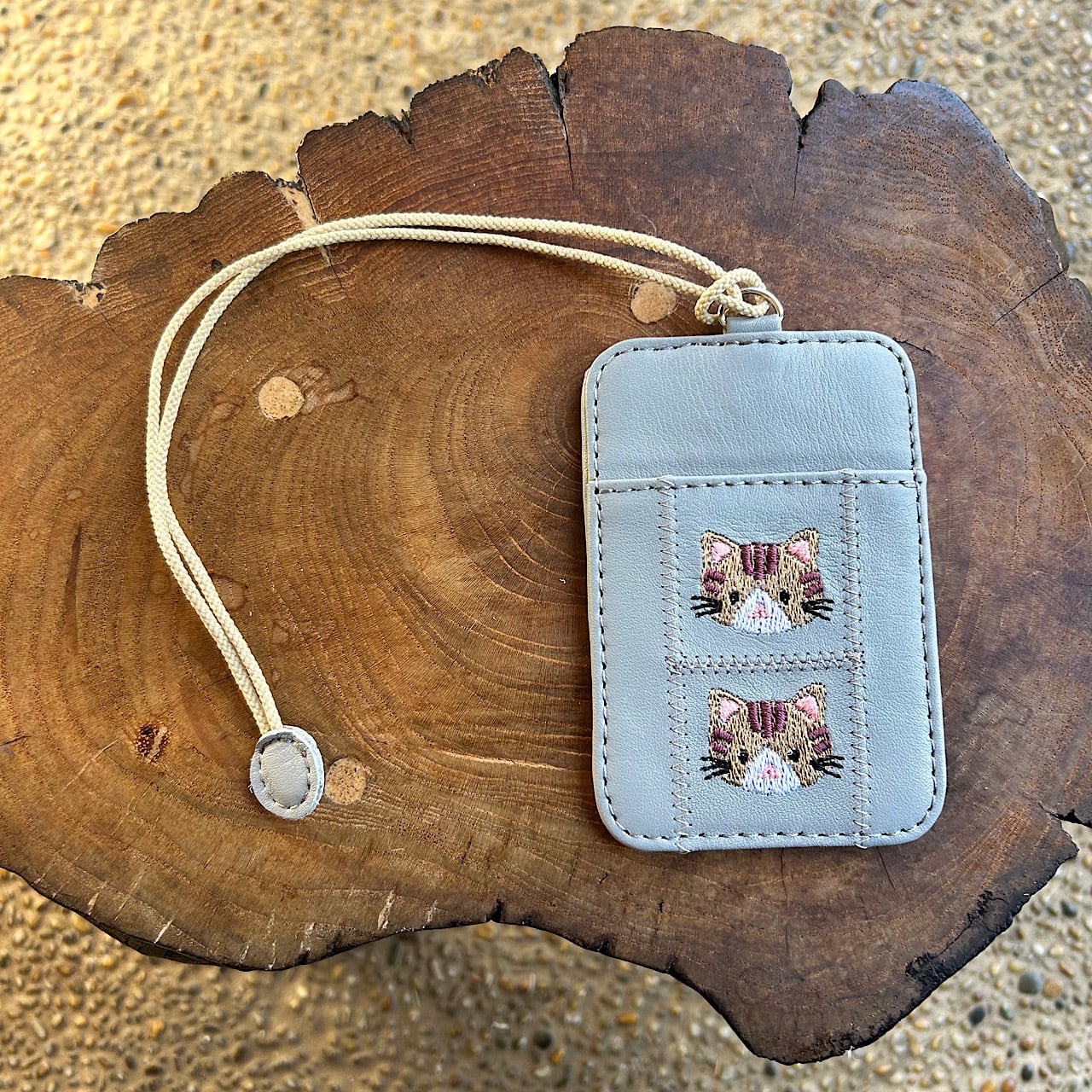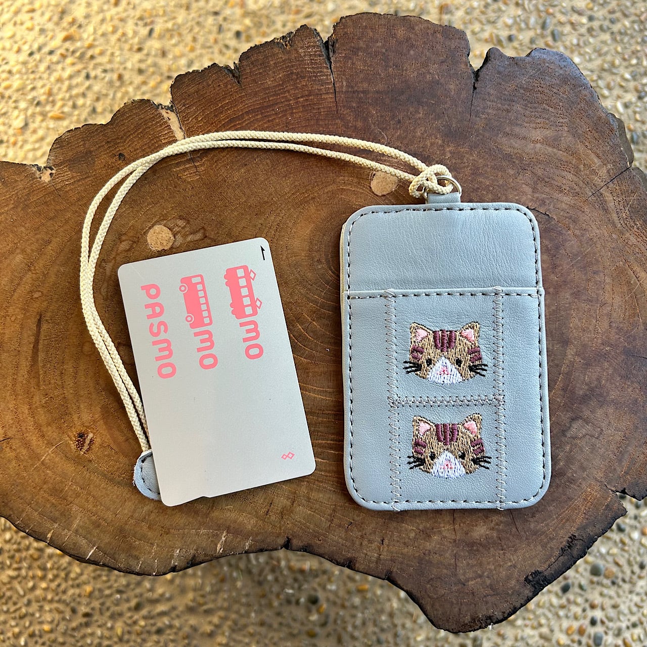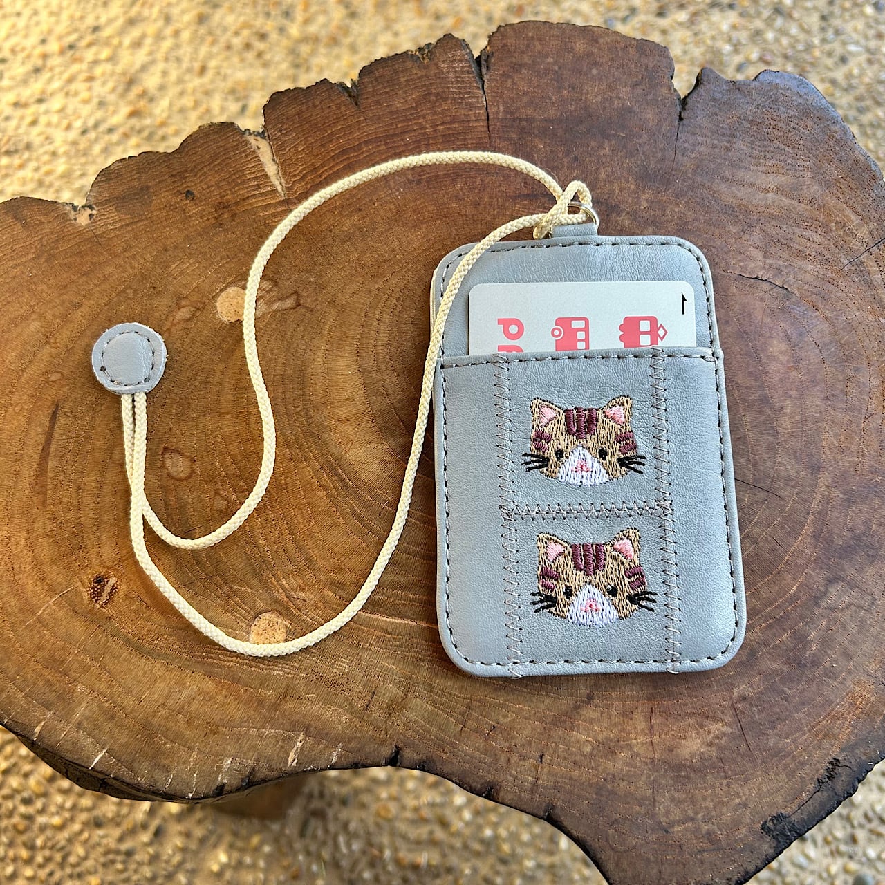 両面パスケース 2枚用 (ライトグレーの革に茶トラ猫の刺繡)03005-29