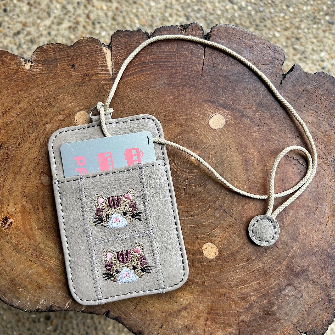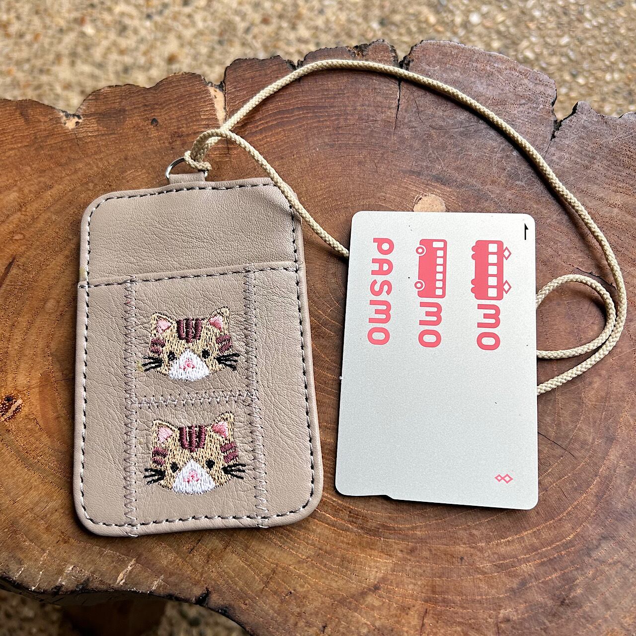 両面パスケース 2枚用 (サンドベージュの革に茶トラ猫の刺繡)03005-30