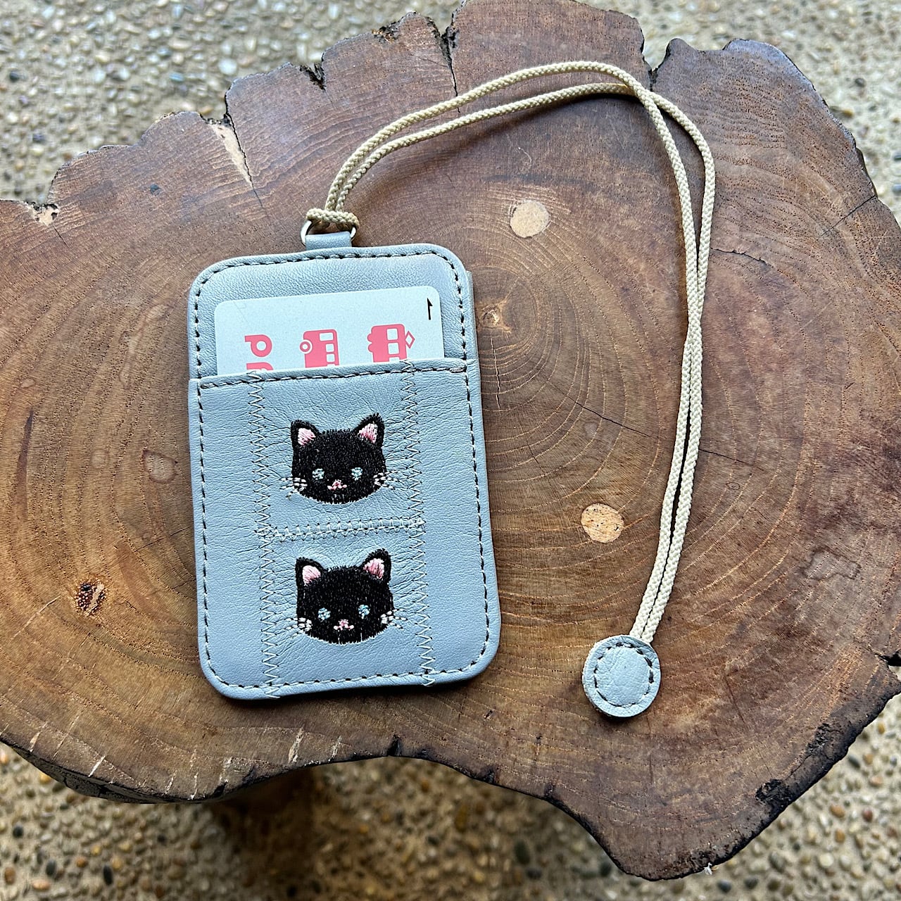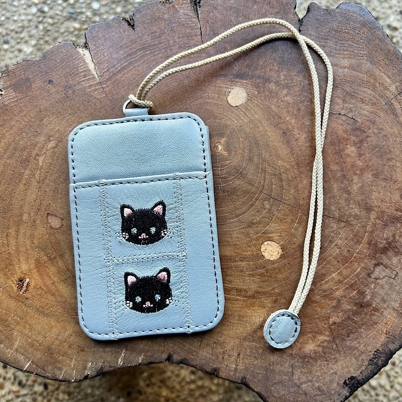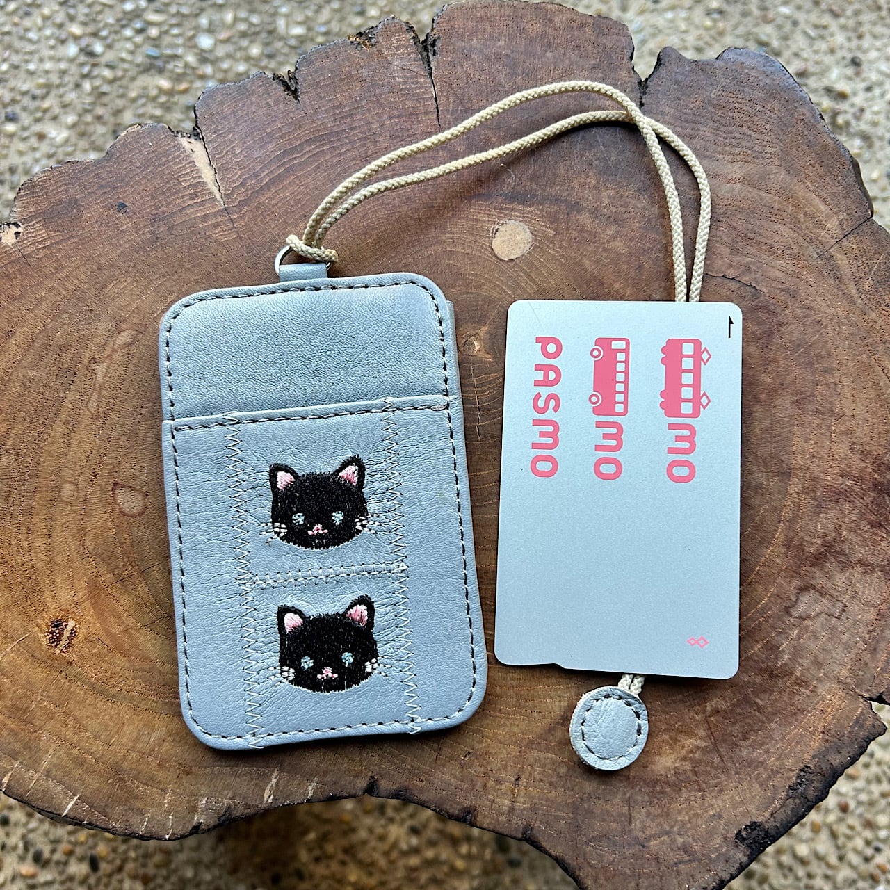 両面パスケース 2枚用 (ライトグレーの革に黒猫の刺繡)03005-33