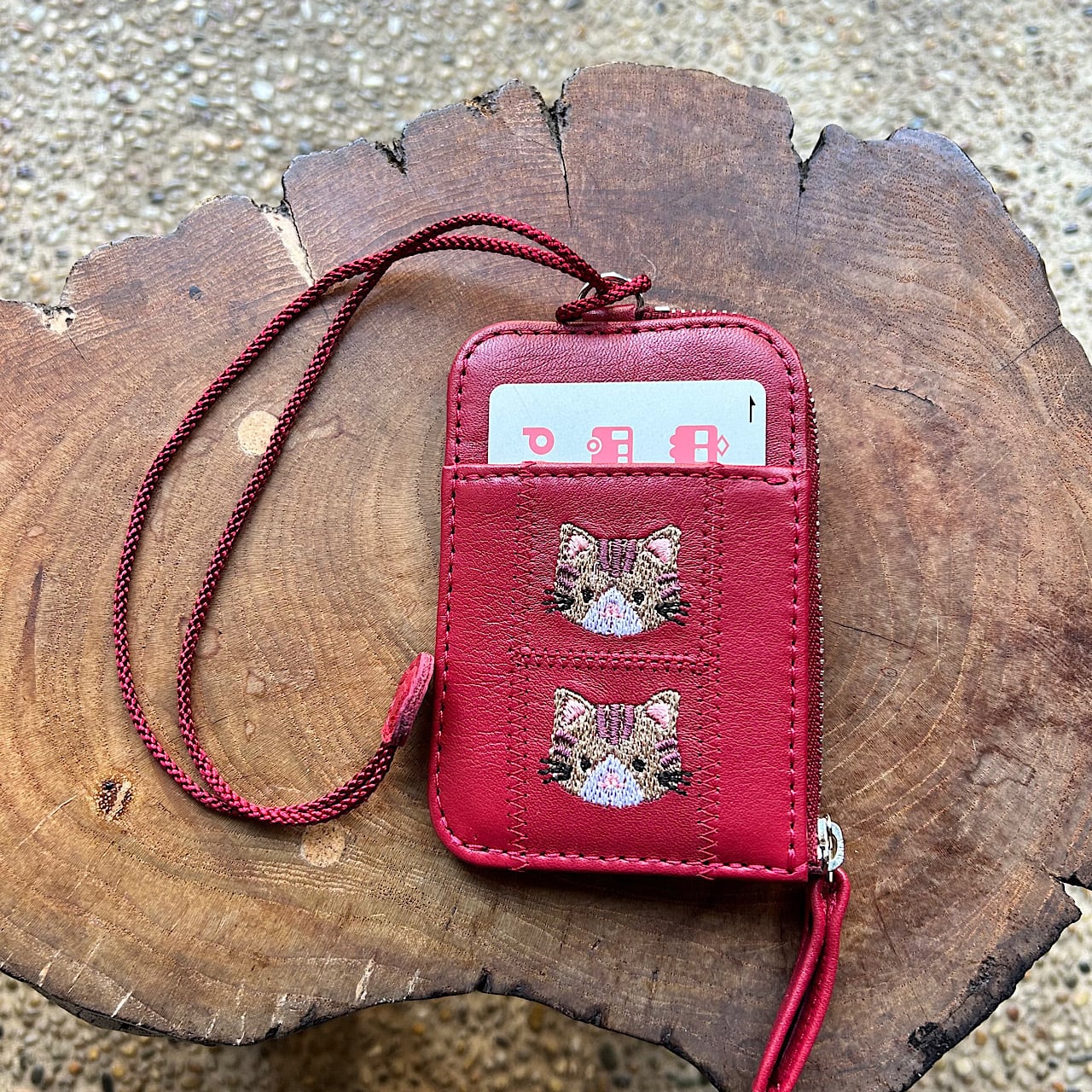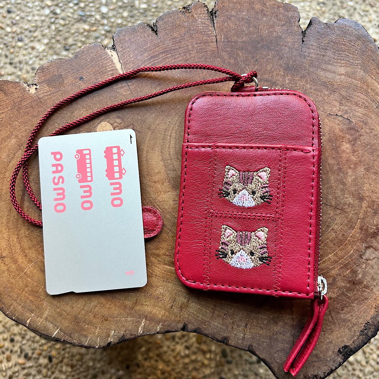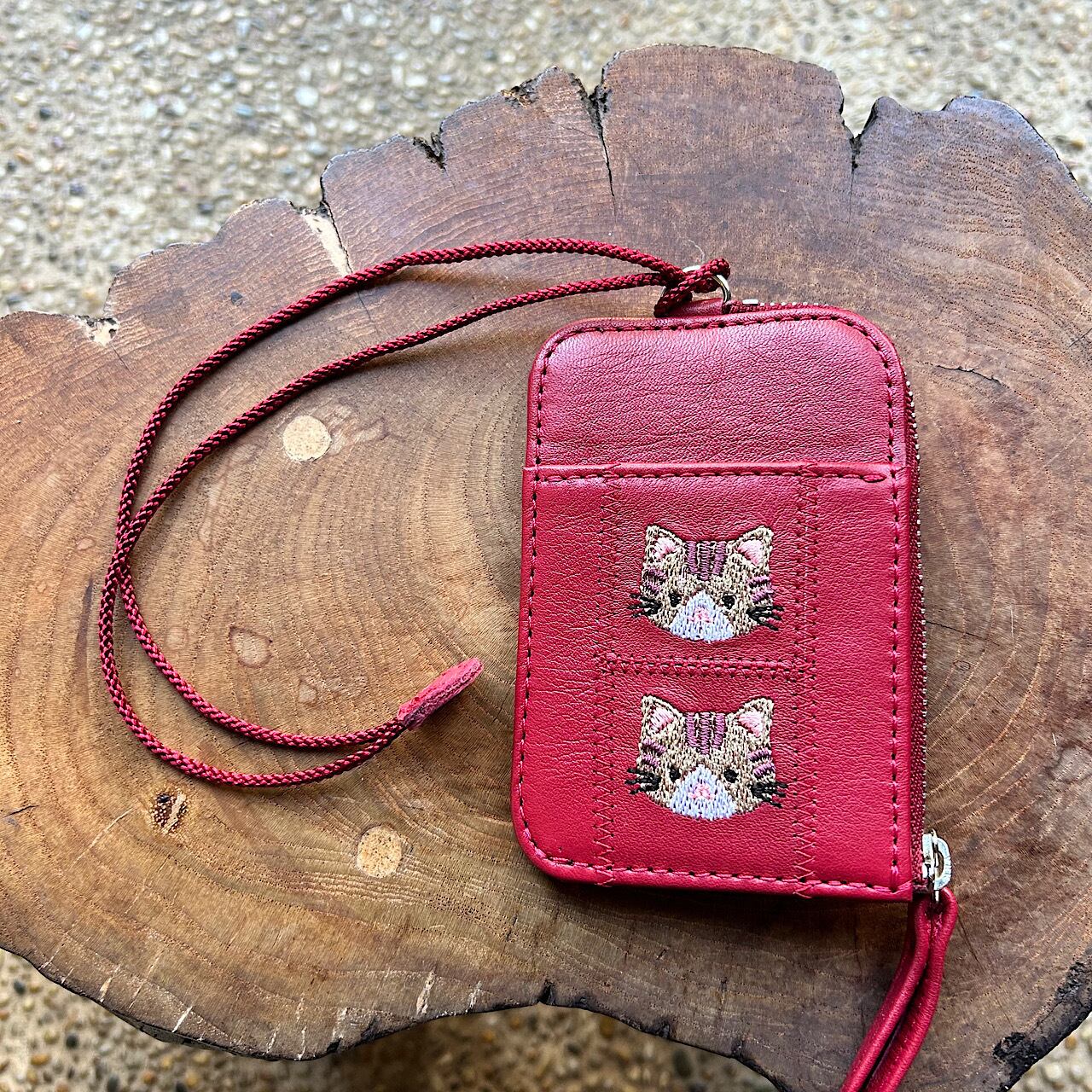 パスケース2枚用 小銭入れ付き(ワインレッドの革に茶トラ猫の刺繡)03003-54