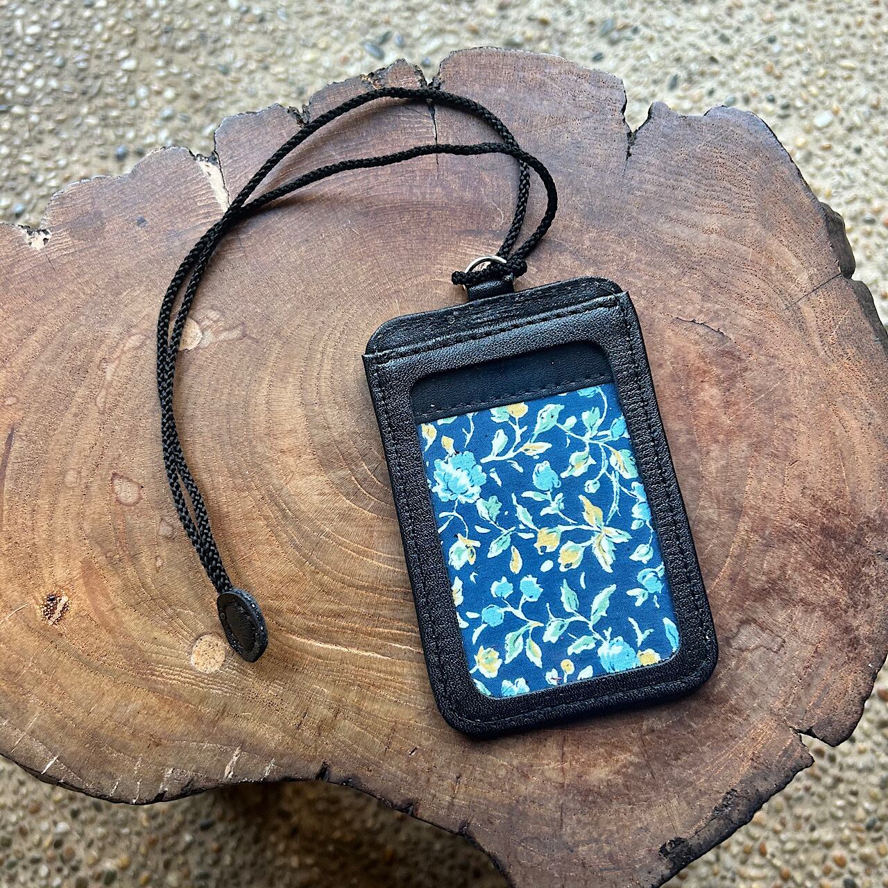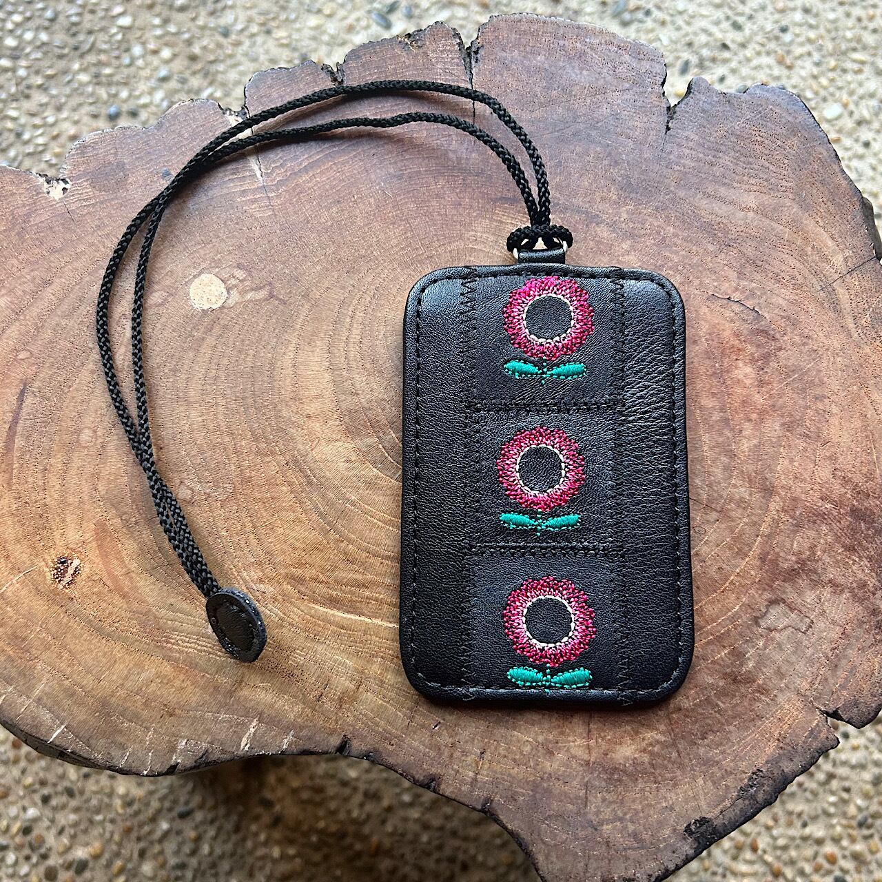 パスケース1枚用(黒の革に花の刺繍)03004-70
