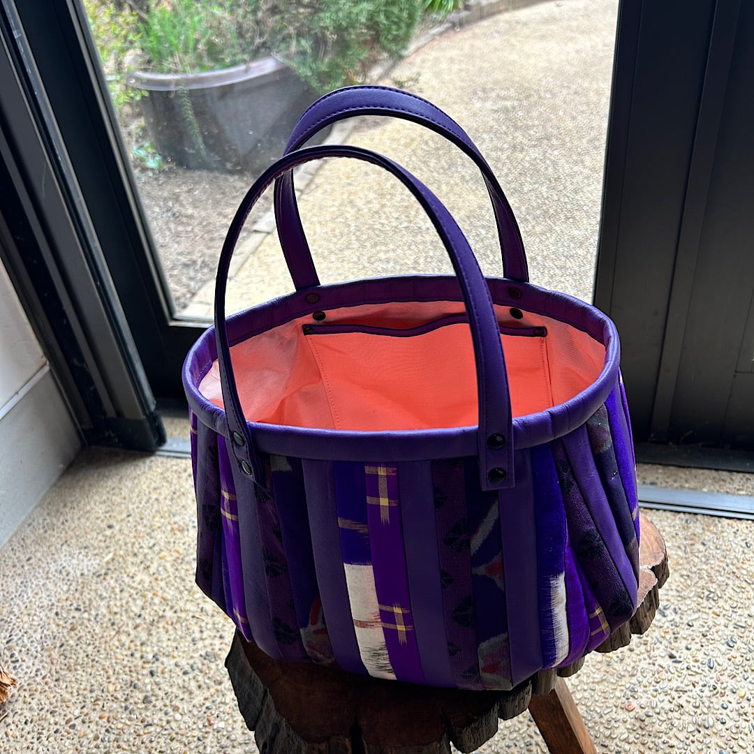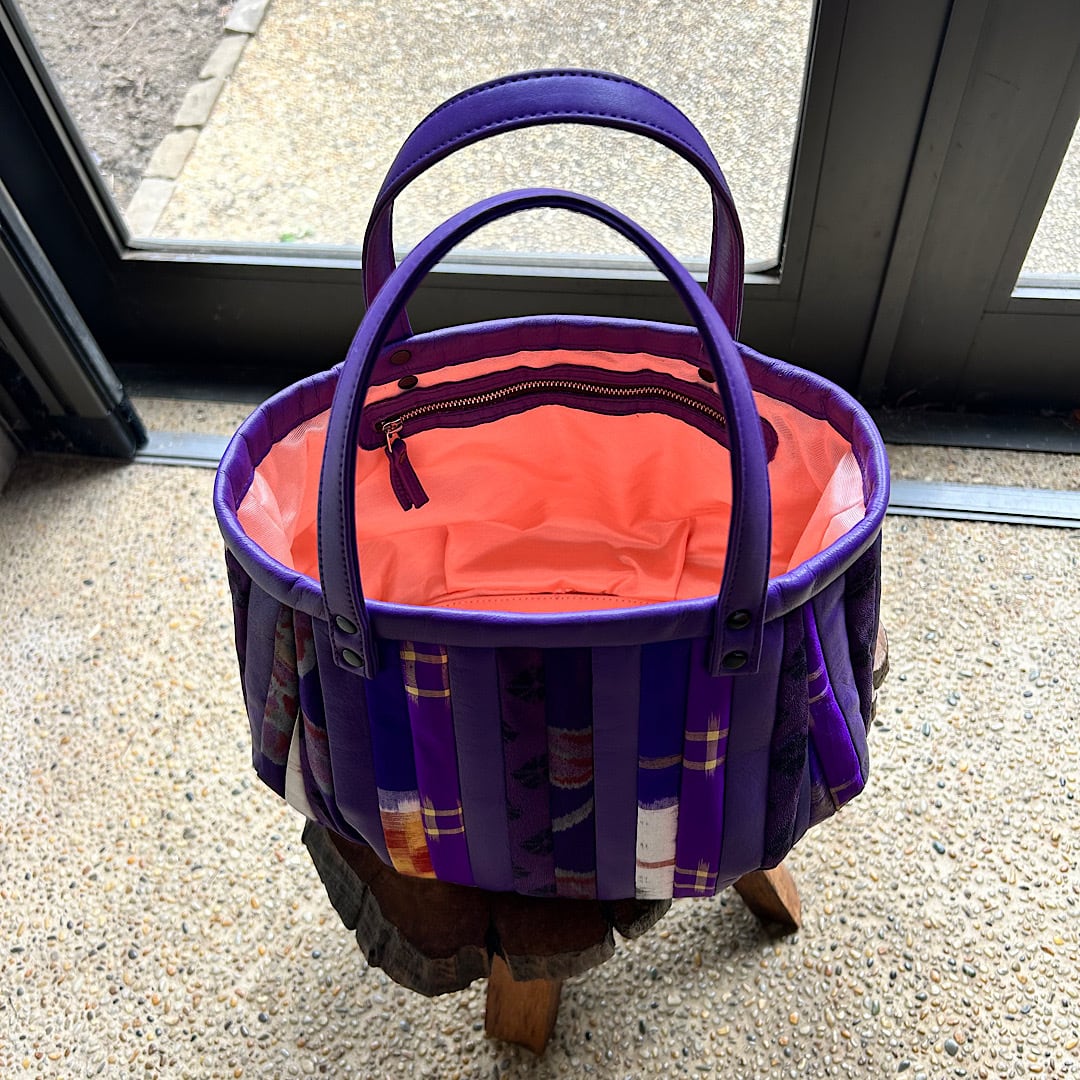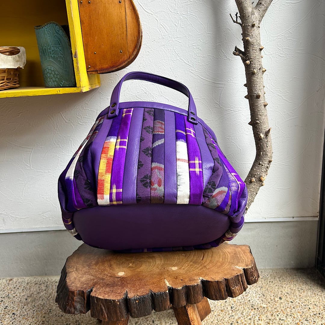 パープルの牛革と銘仙などの着物生地(古布)をパッチワークして作りました。