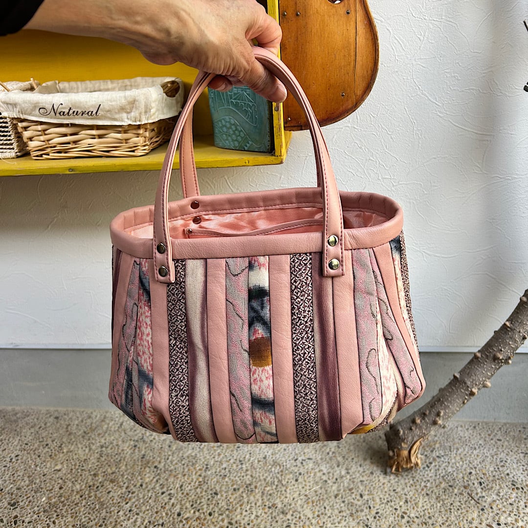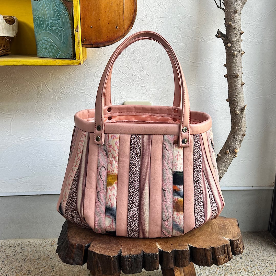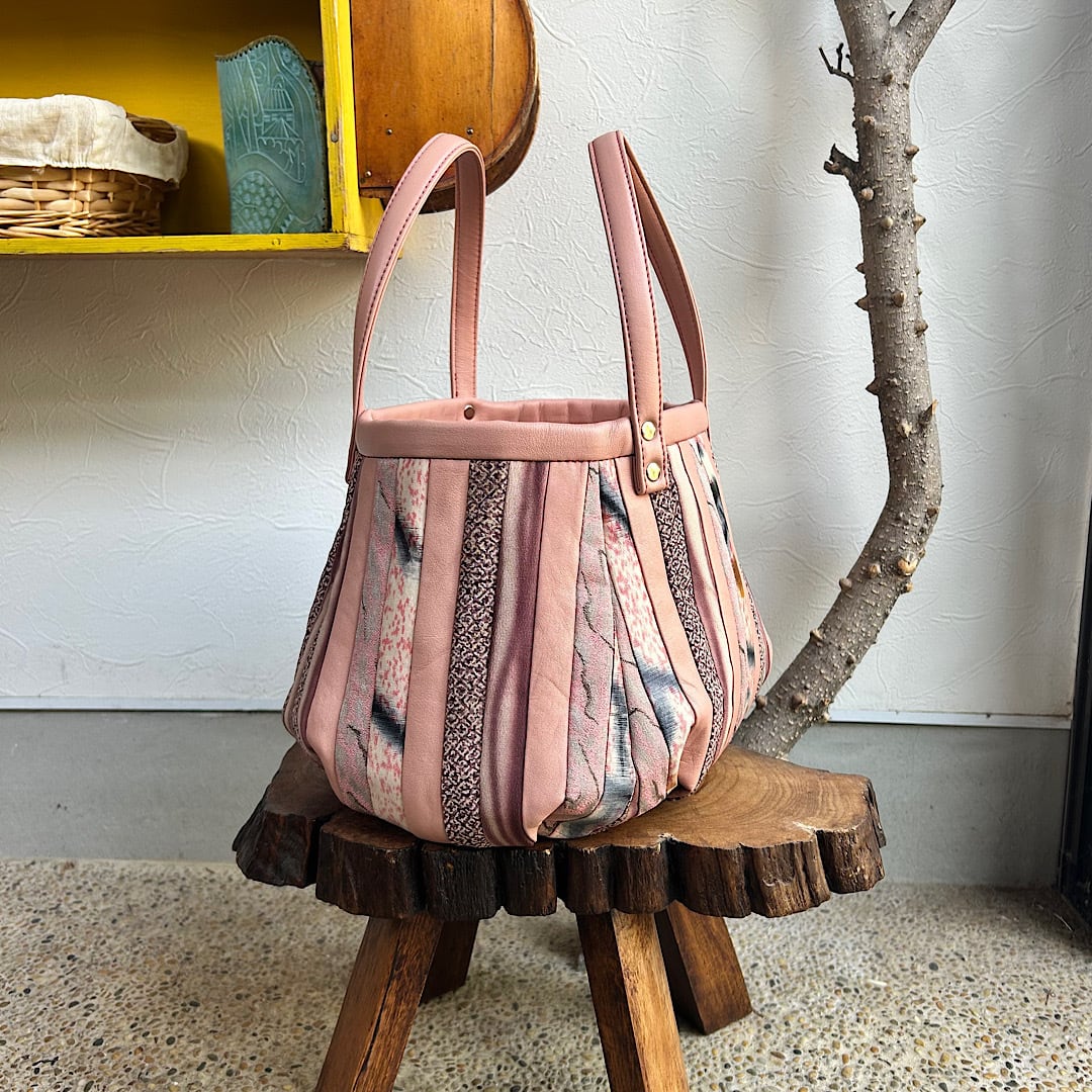革と古布のパッチワークバッグ(ピンクの革+着物生地)01016-138