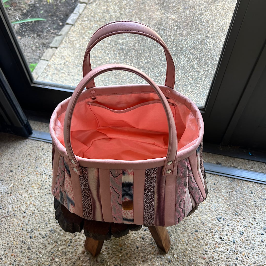 ピンクの牛革と着物生地(古布)をパッチワークして作りました。