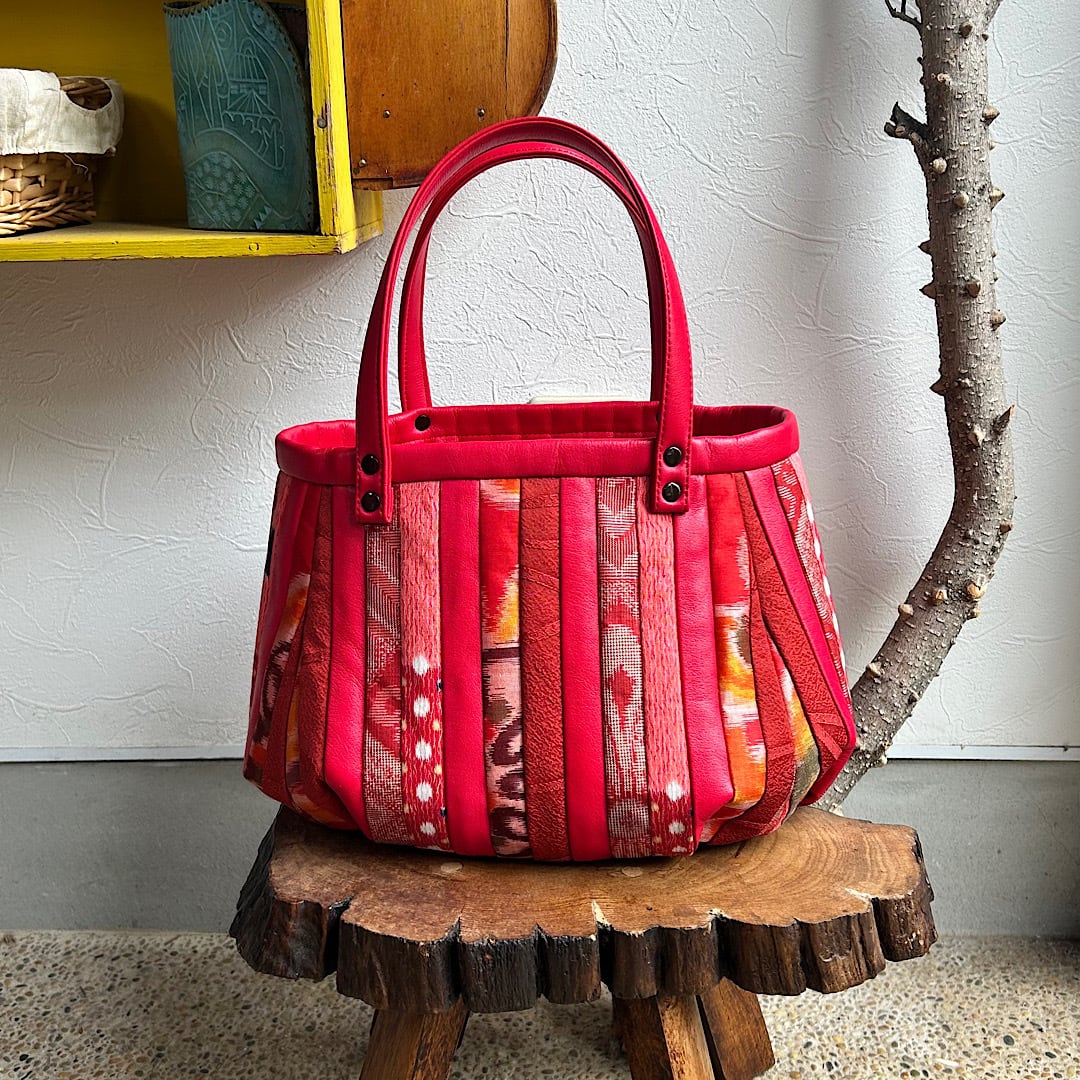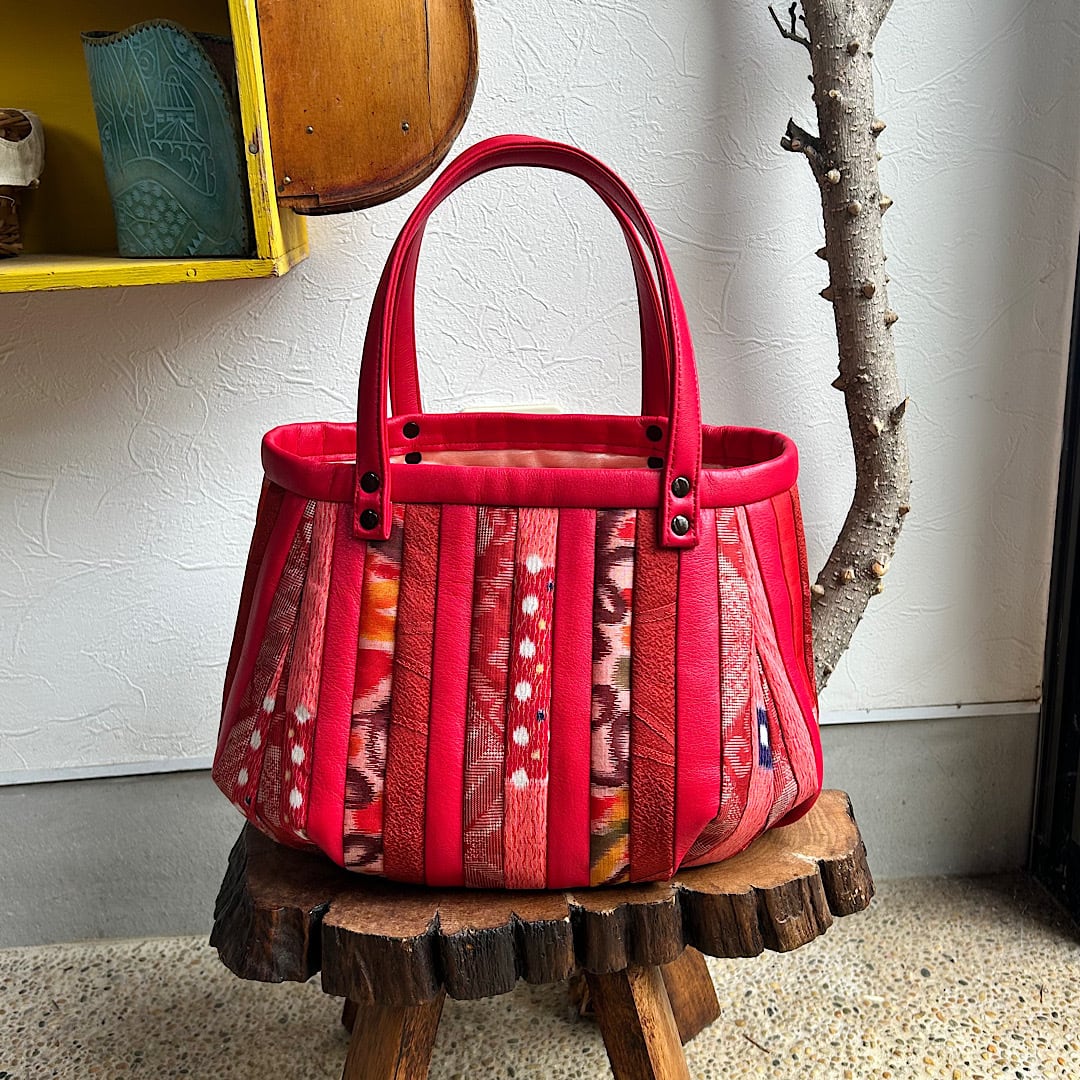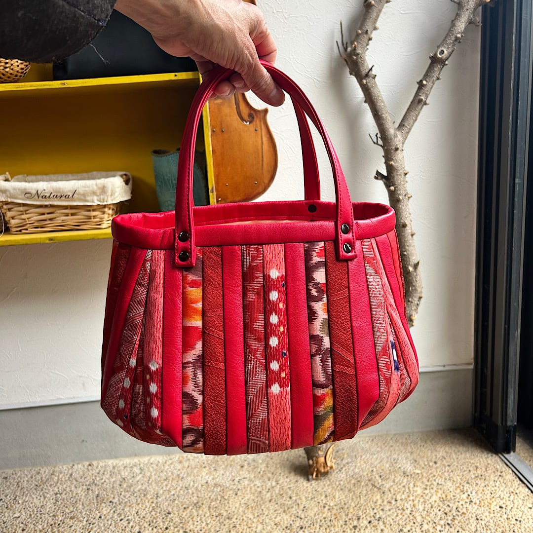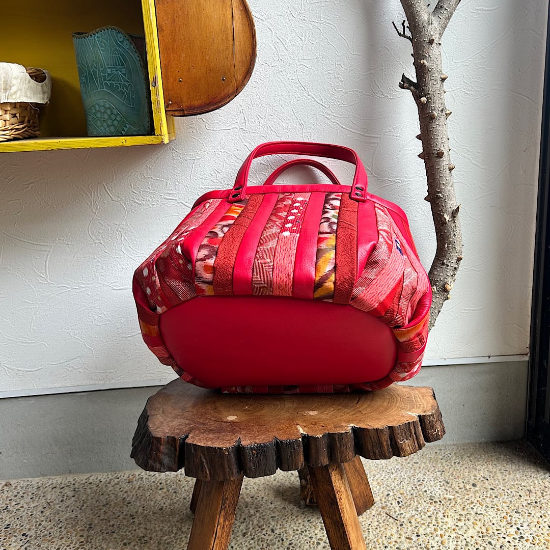 革と古布のパッチワークバッグ(赤の革+着物生地)01016-139
