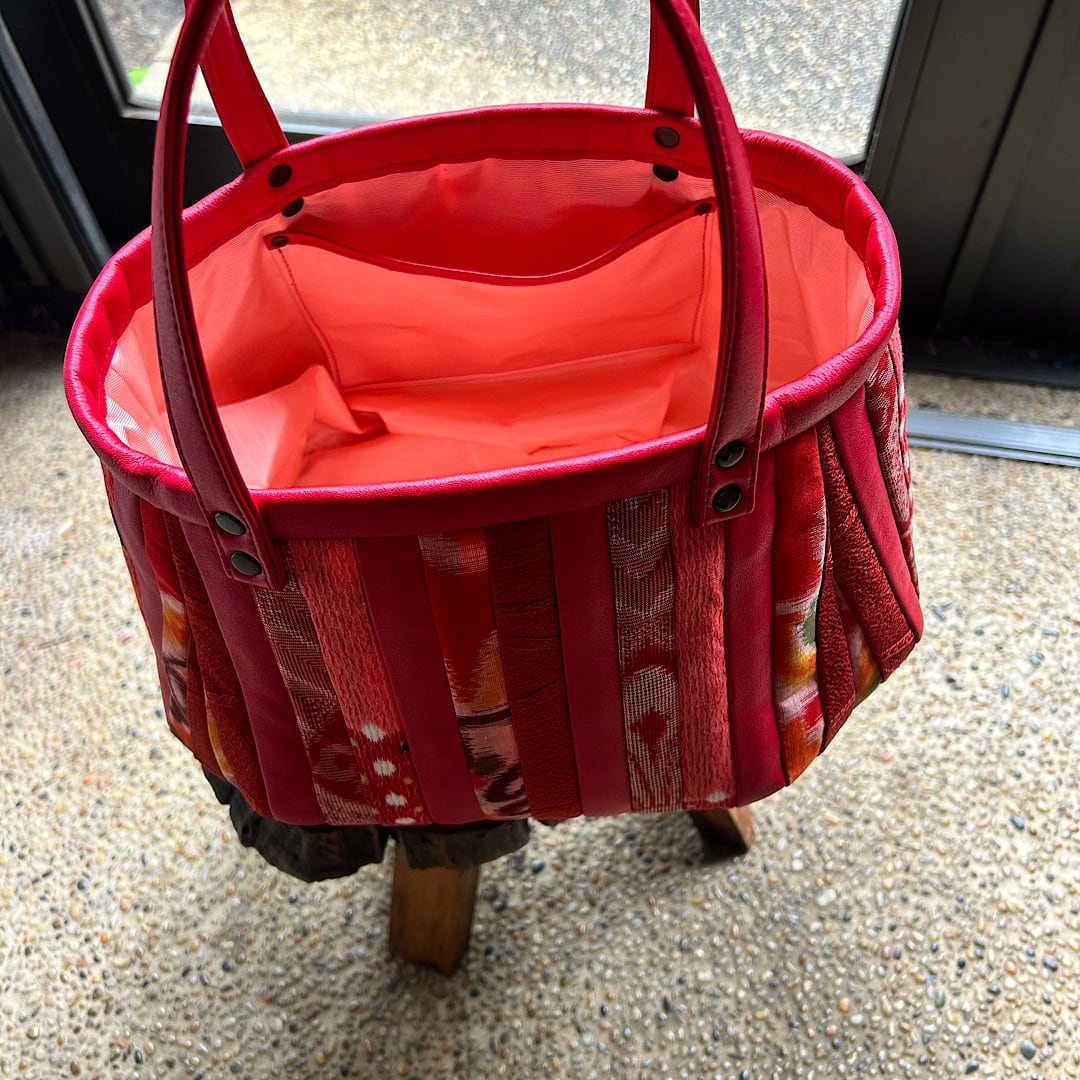 赤の牛革と着物生地(古布)をパッチワークして作りました。
