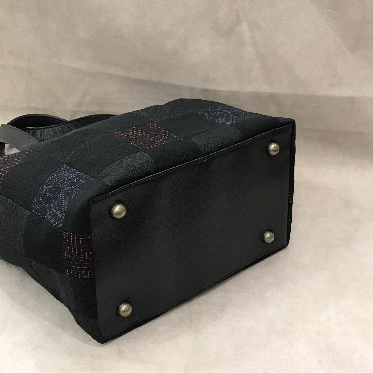 パッチワーク布は黒系の着物地を集め、底部分と口元部分と持ち手は黒の牛革。内側はオープンポケット1つ、ファスナーポケット1つ。