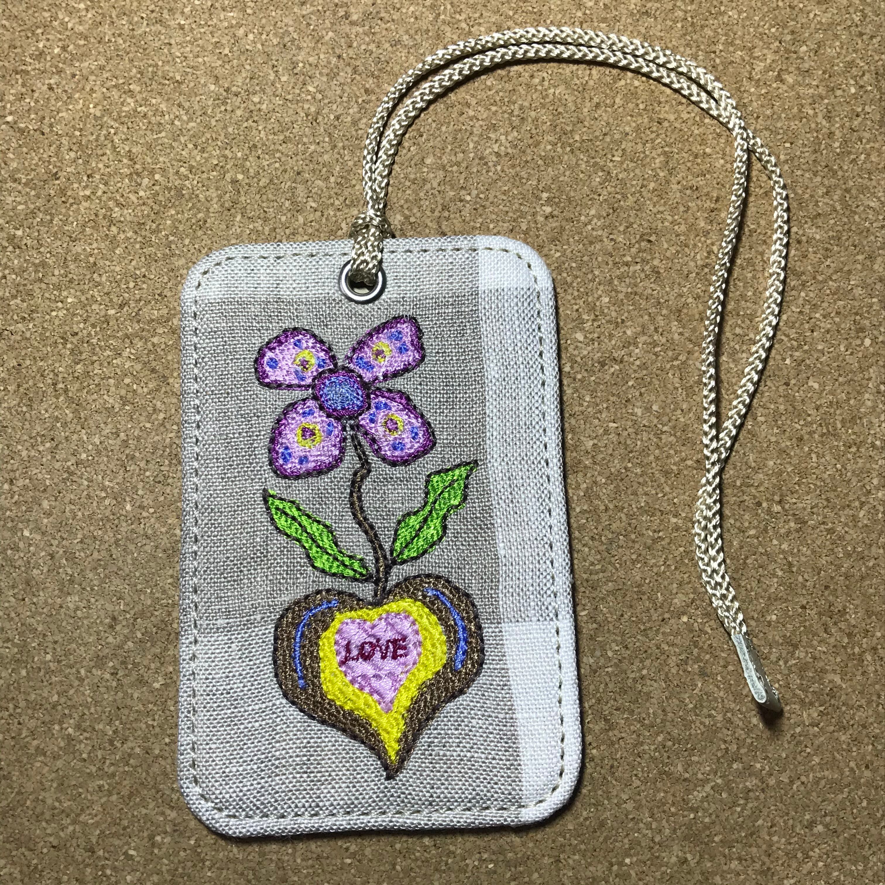 Suicaや PASMOのためのケース。カード1枚用のパスケースです。リネン布にお洒落な花の刺繍を施し、裏面は本革を使用しています。