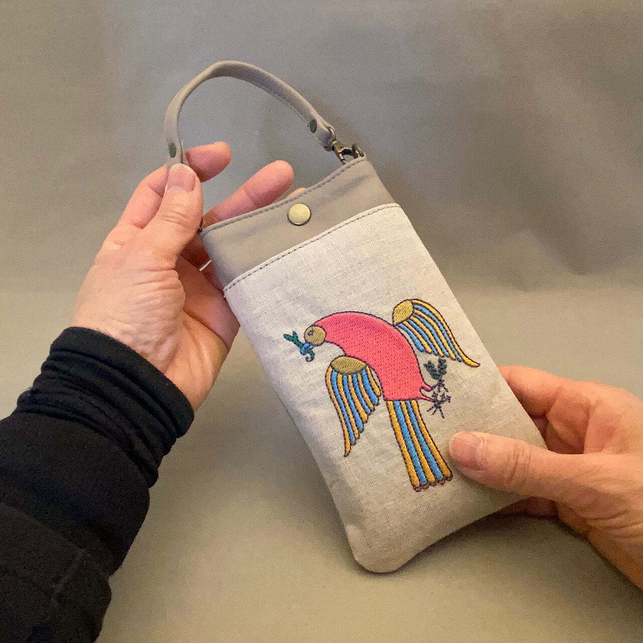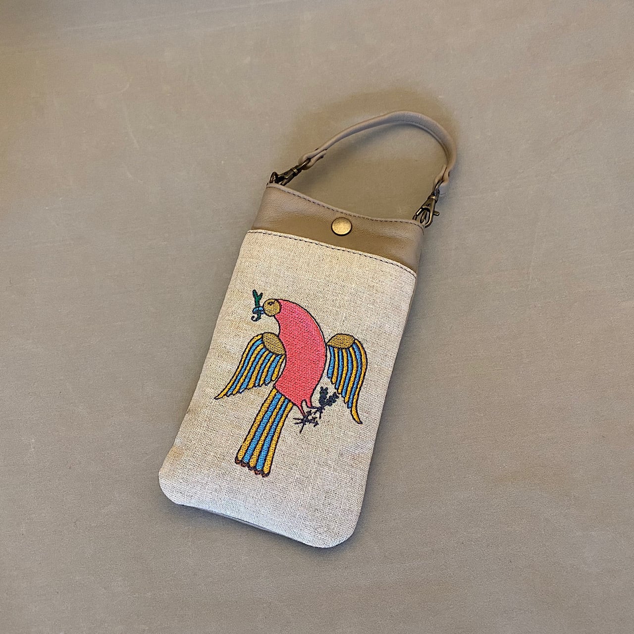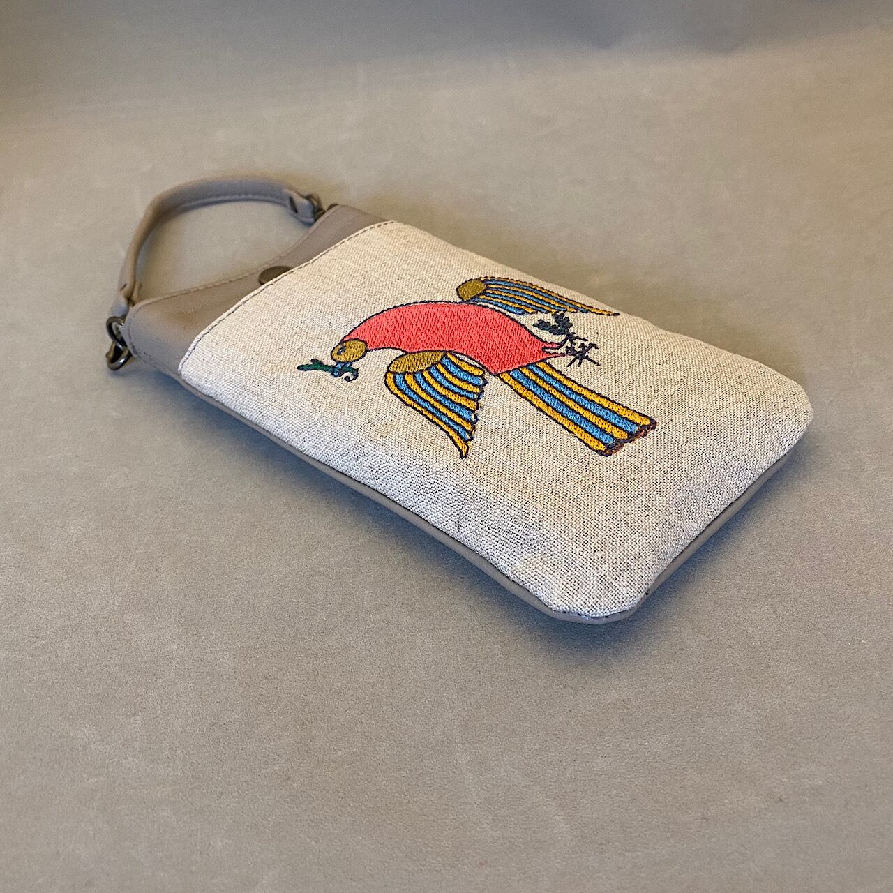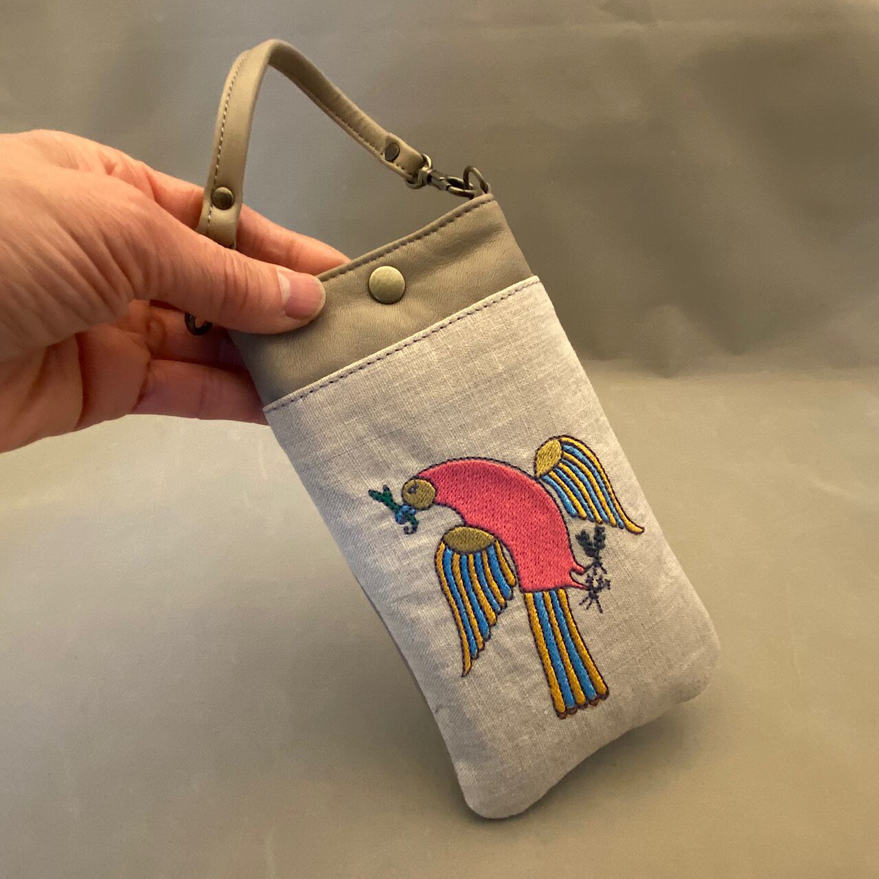 スマホポーチ(ベージュ革、鳥柄)No.03006-04