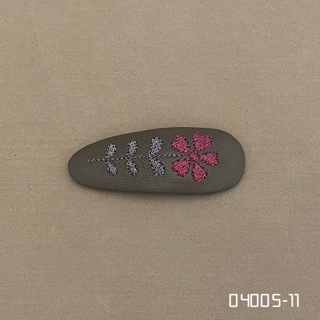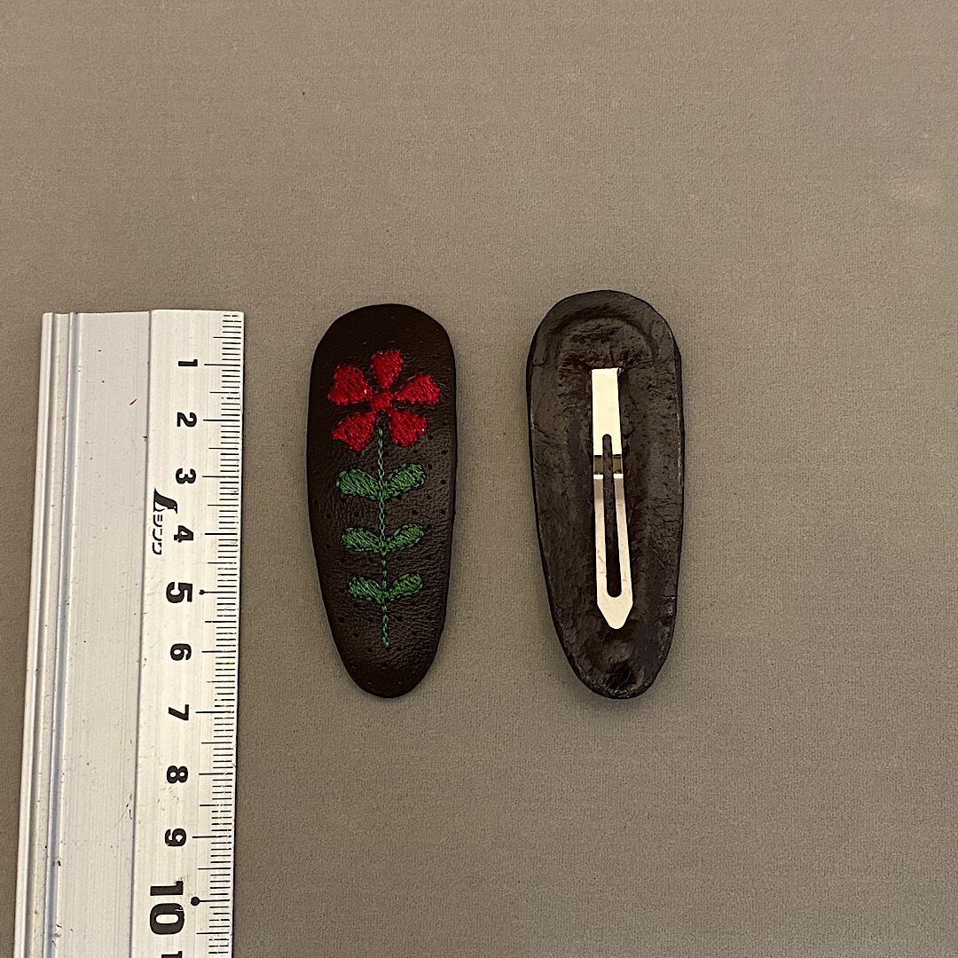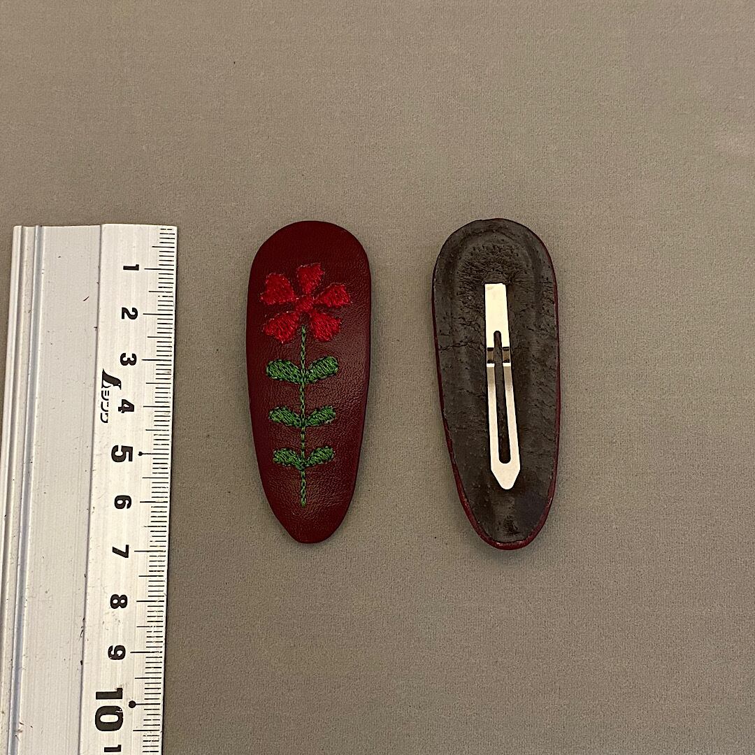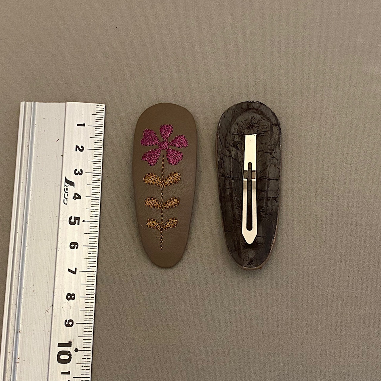 革に刺繍をしてパッチンピンに仕立てました。同色2個セットになります。