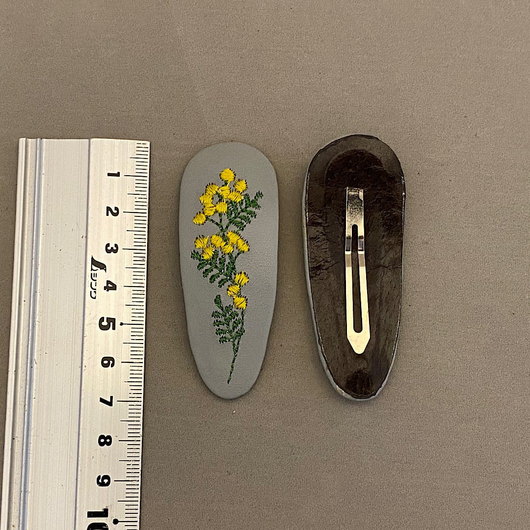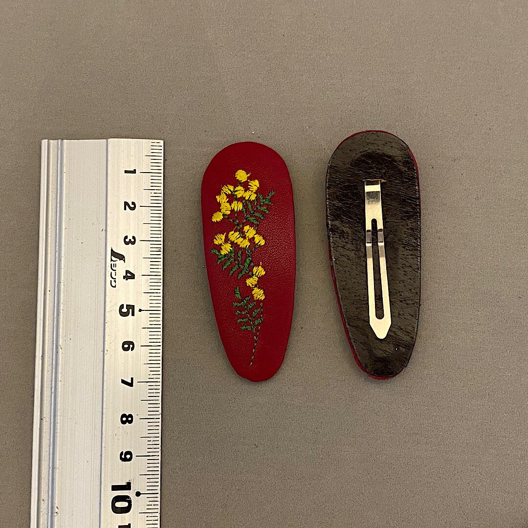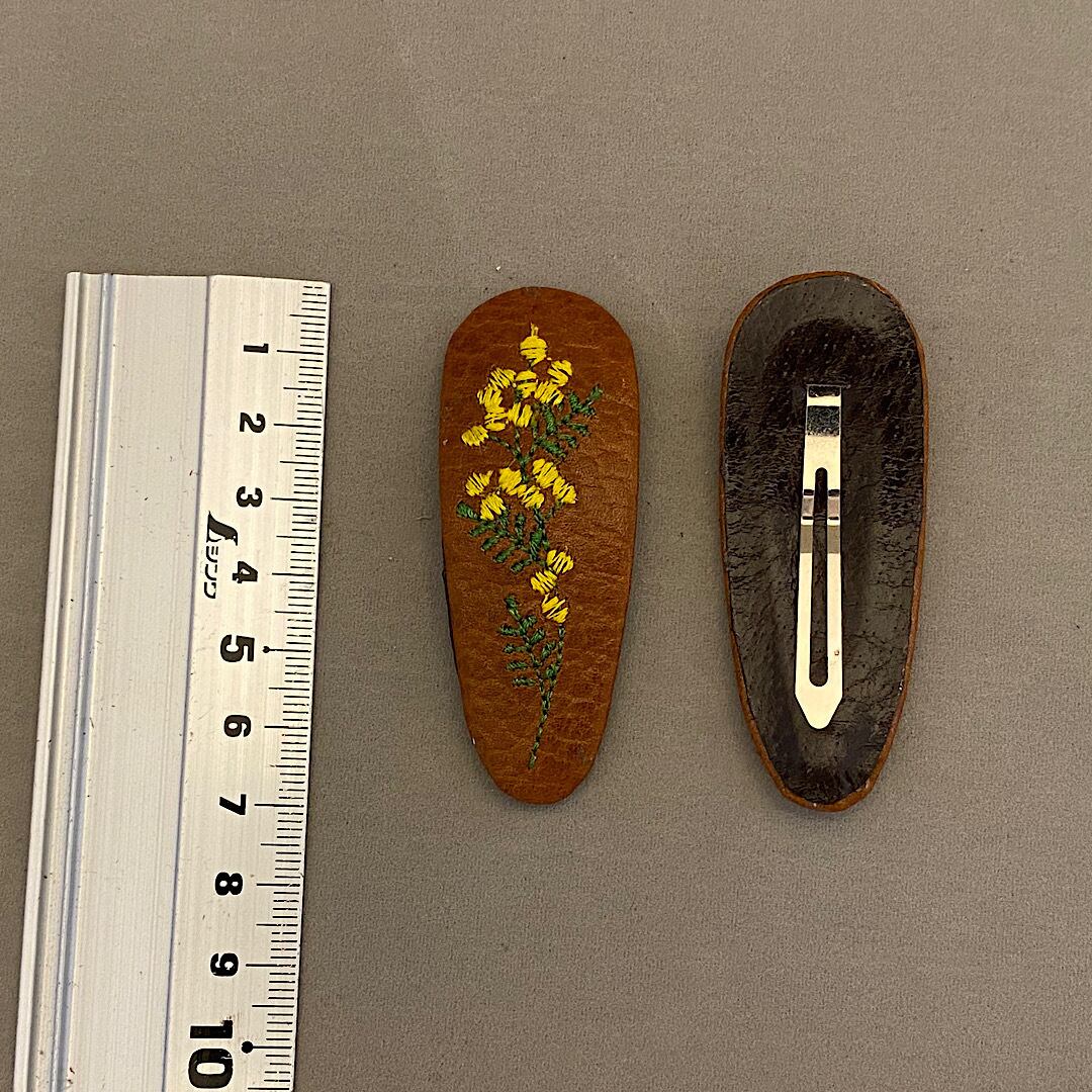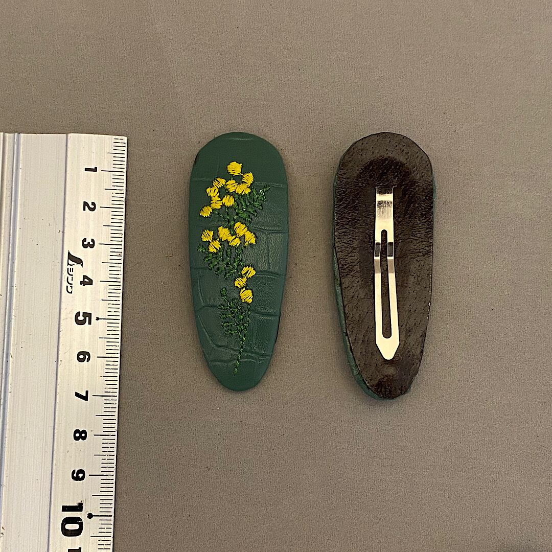 革にミモザの刺繍をしてパッチンピンに仕立てました。同色2個セットになります。