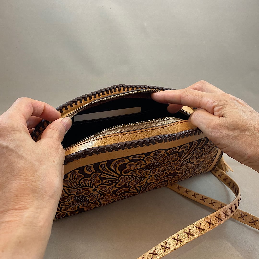 長財布は入りませんが、ミニ財布とスマホ、ハンカチ、ティッシュ程度はゆったりと入る大きさです。