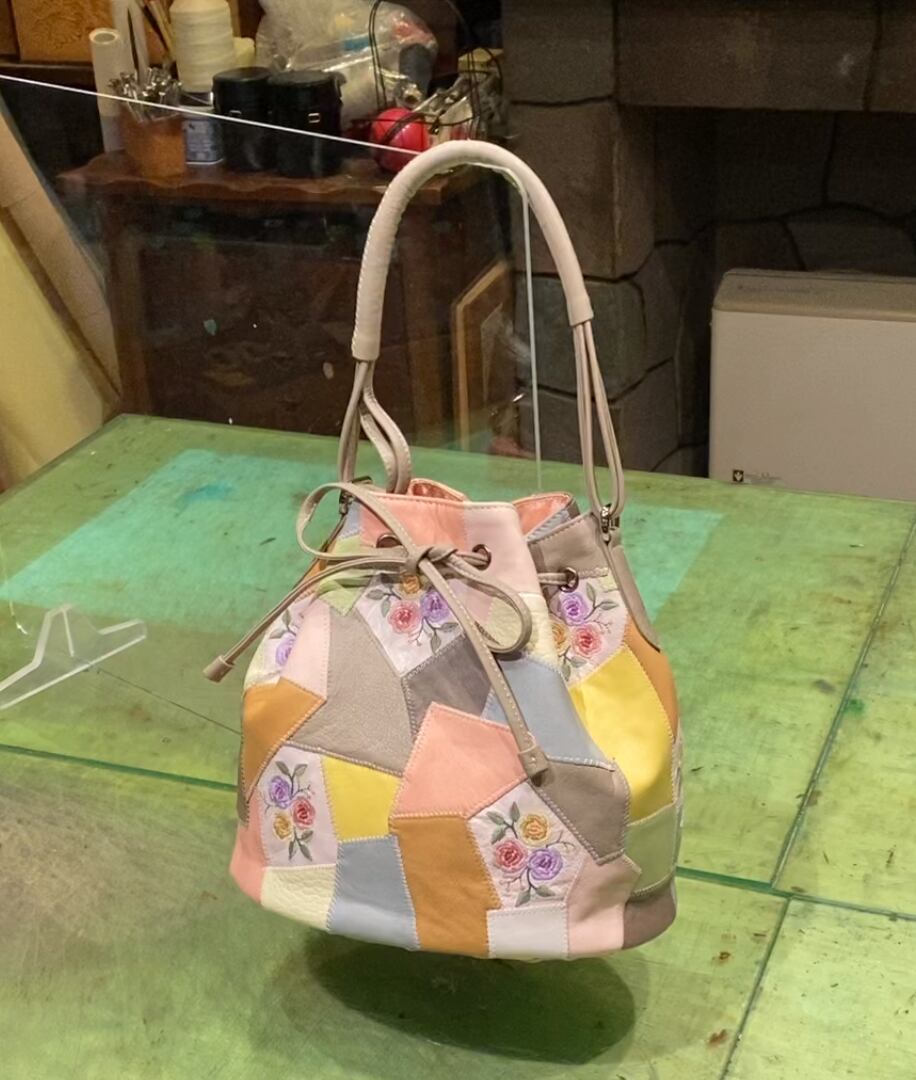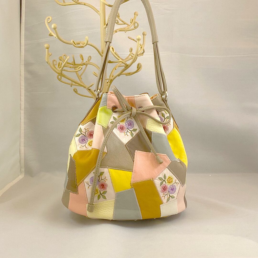 革をパッチワークして優しい色味のエレガントなバッグに仕立てました。
