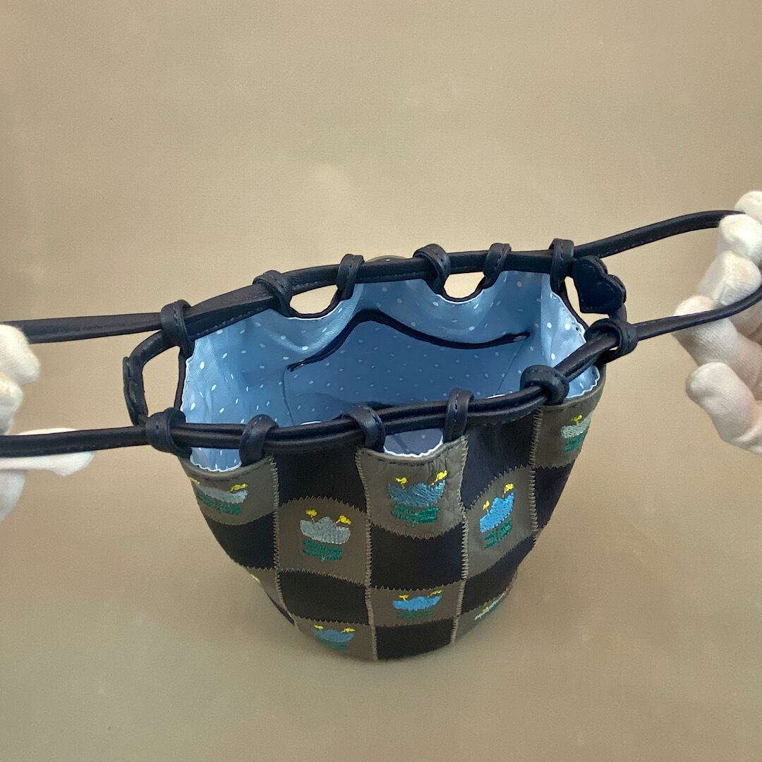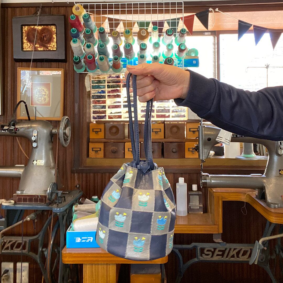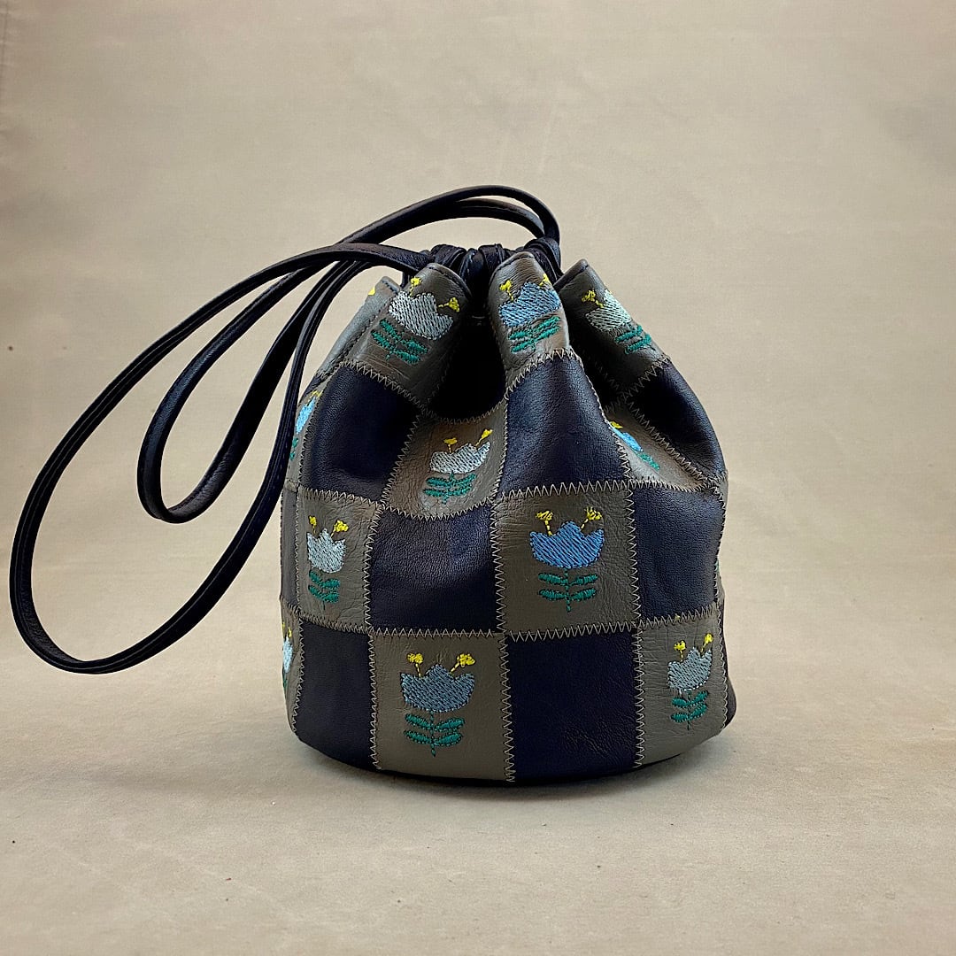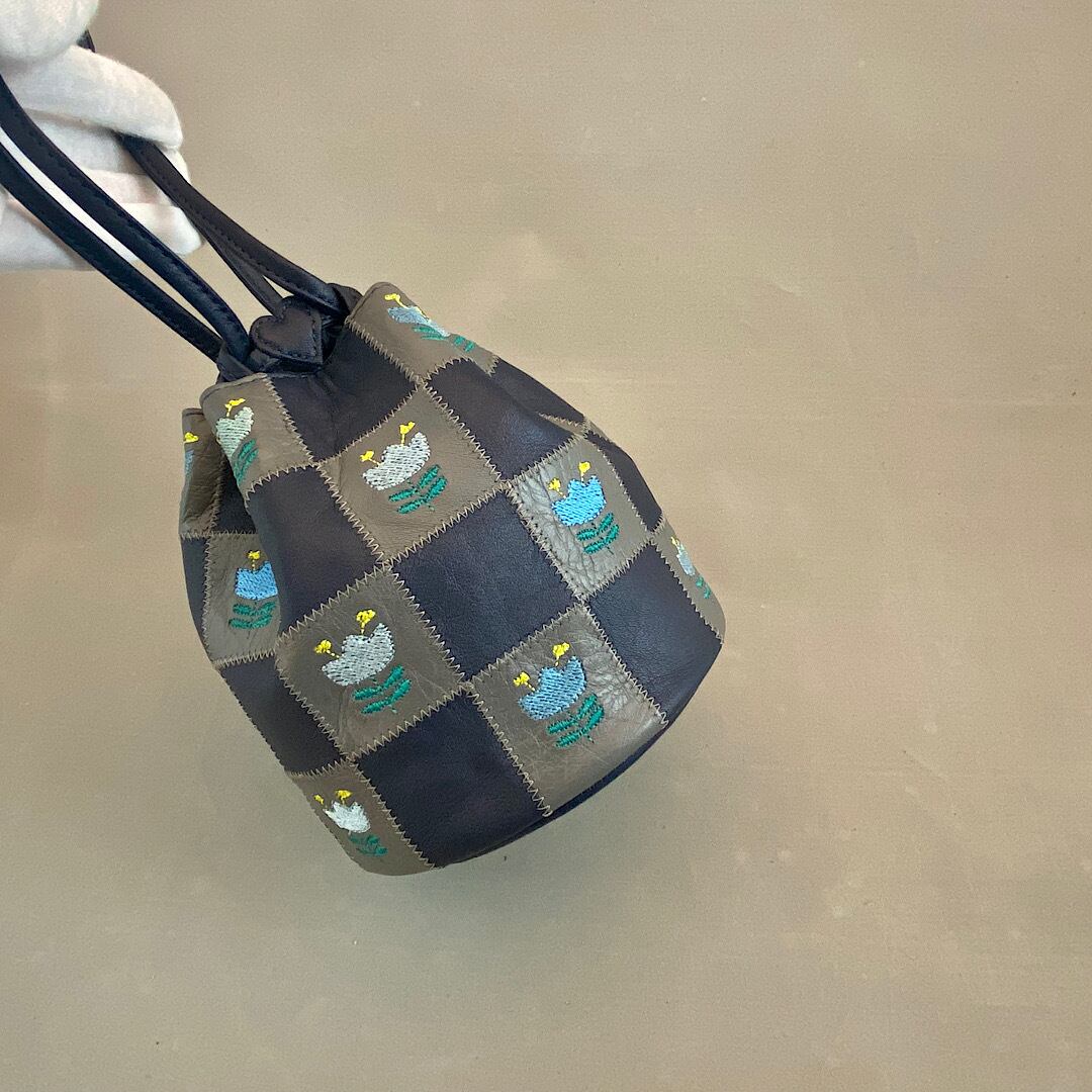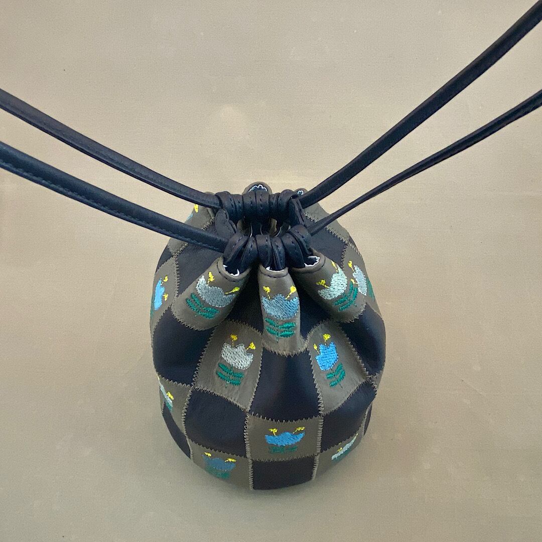 革にかわいい花の刺繍をしてパッチワークで仕立てた巾着のミニバッグです。