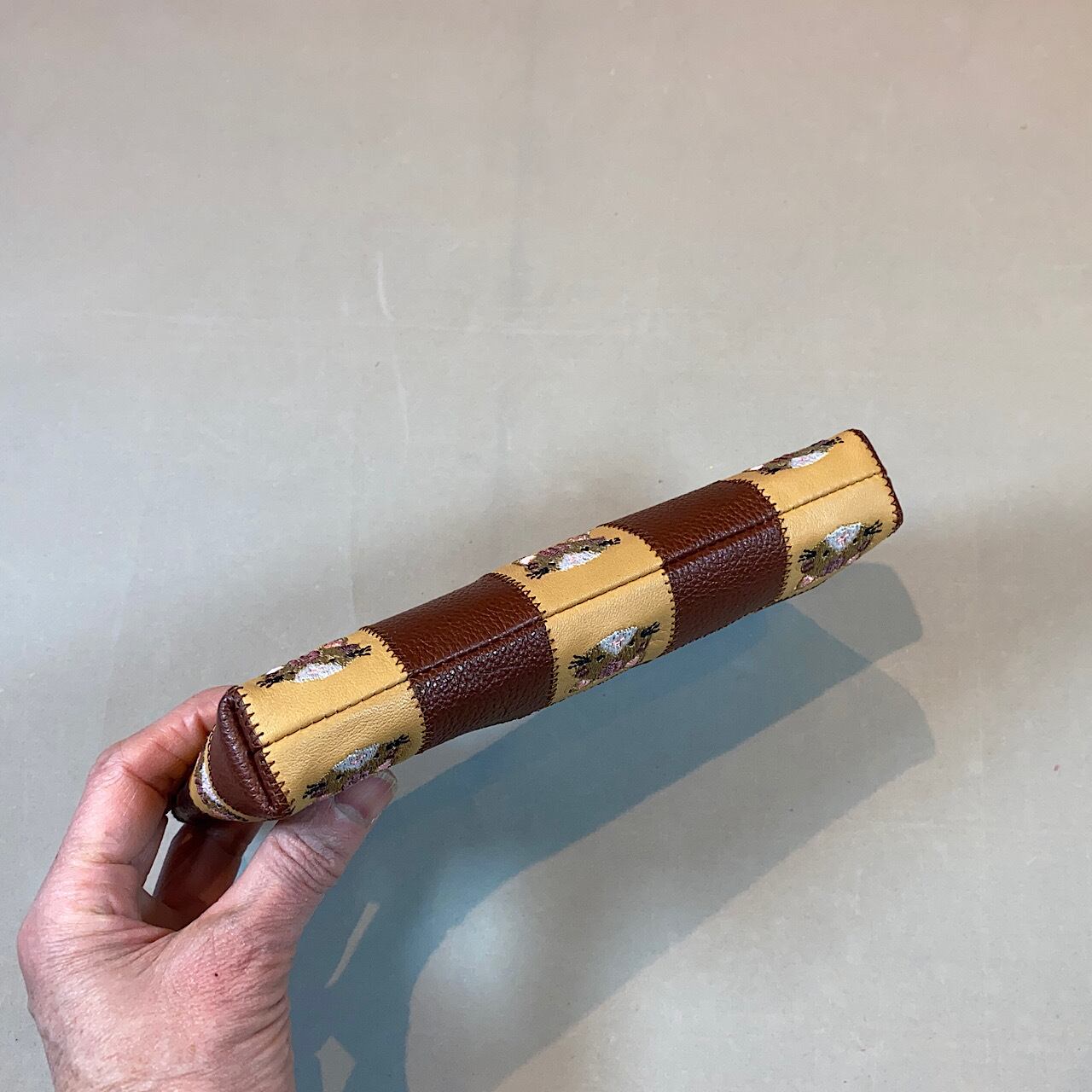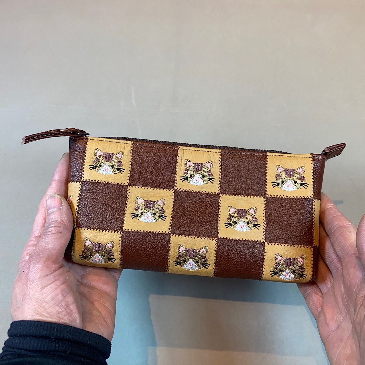 革パッチワークのファスナーポーチ(ブラウンに猫の刺繡) No.03008-06