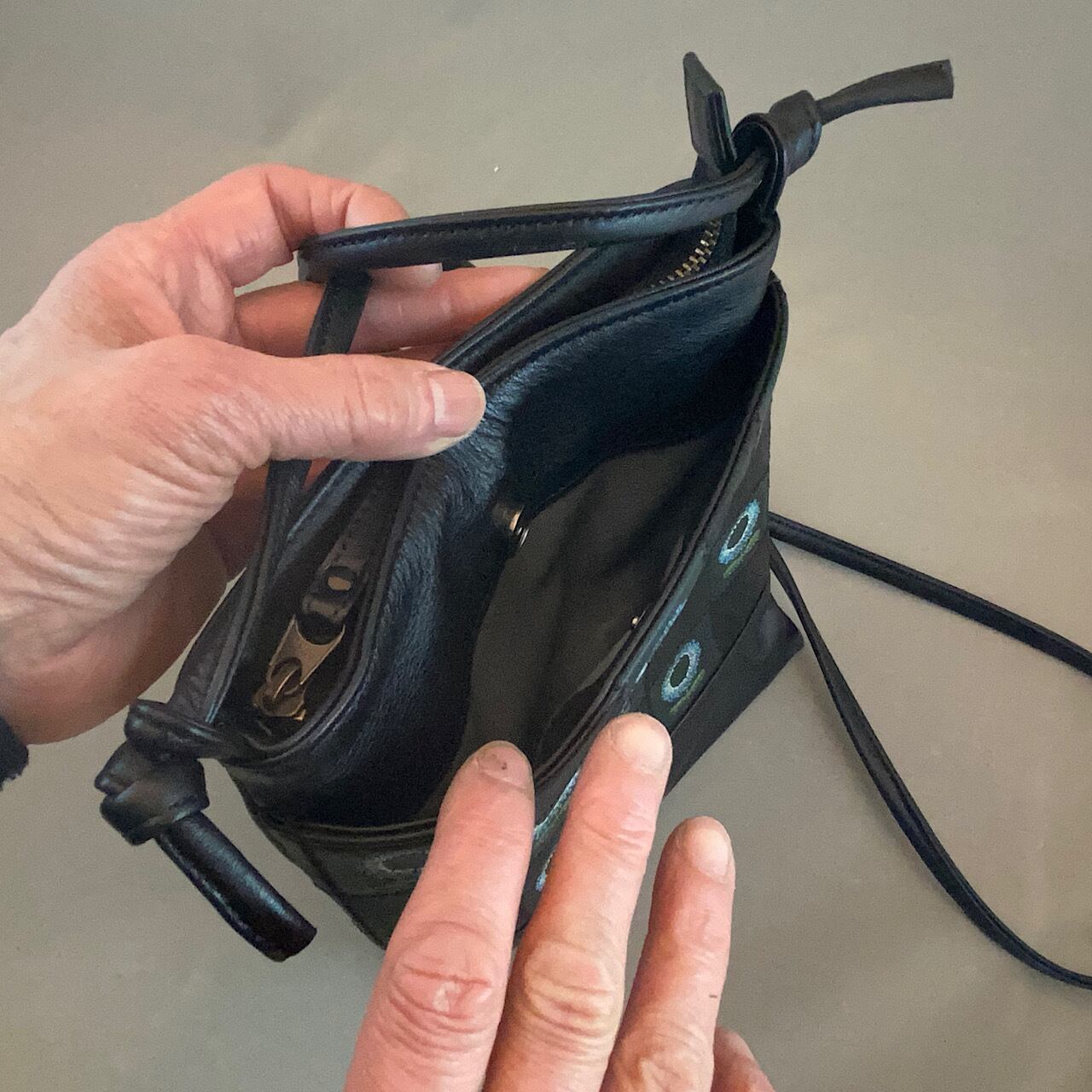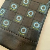ベースは黒の革。パッチワーク部分は黒の革とモスグリーンの革を縫いつなぎ、落ち着いたブルー系の花の刺繍をして仕立てたサコッシュです。