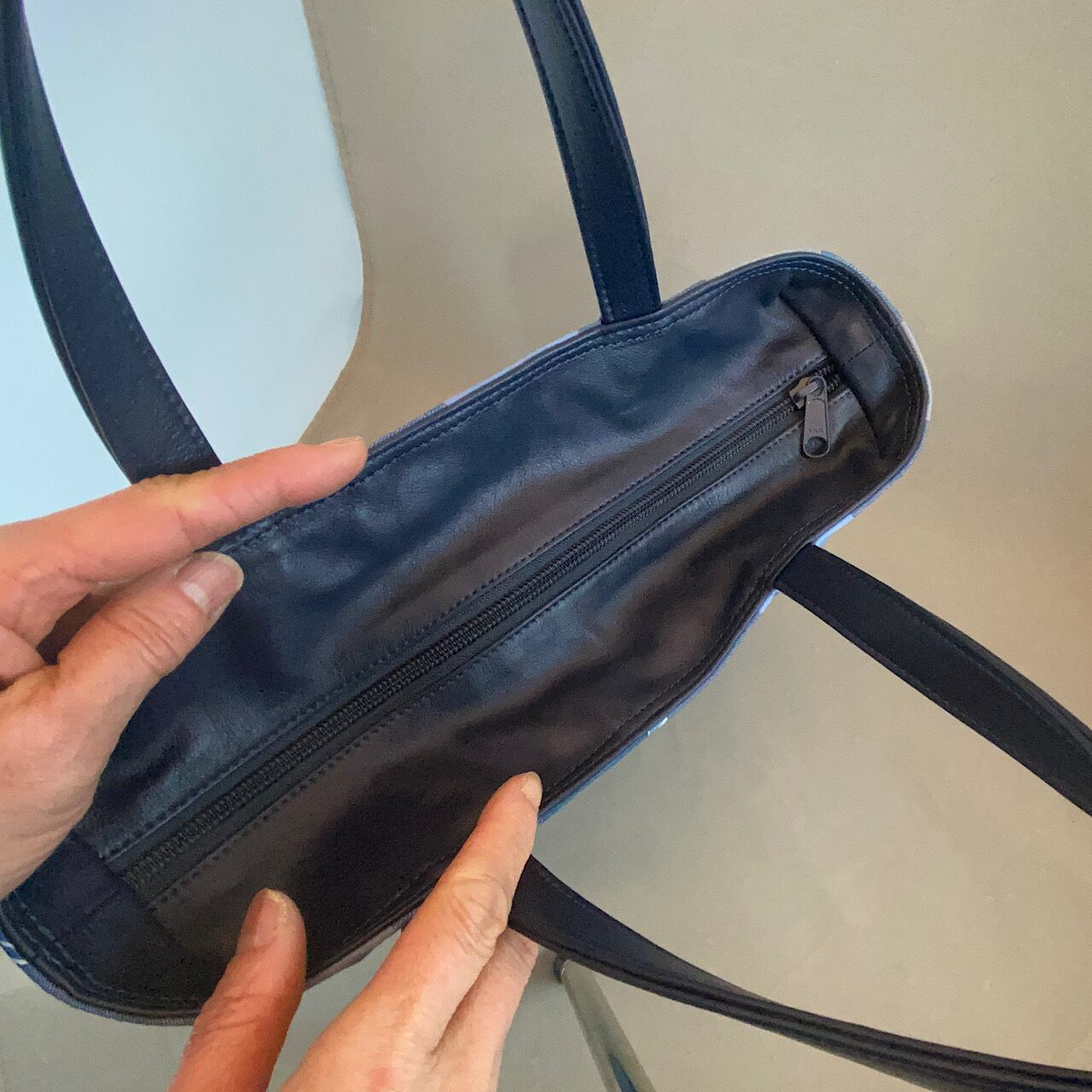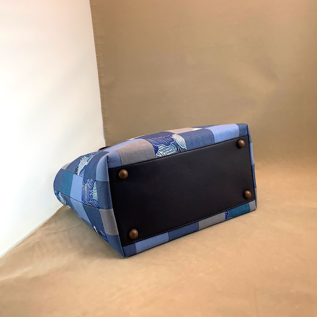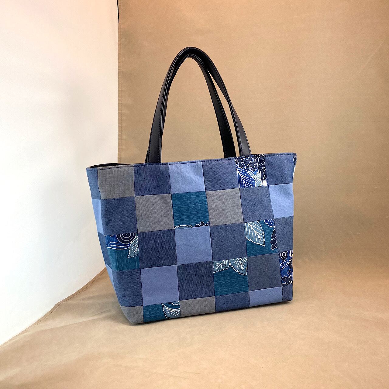 パッチワーク布はダンガリー等の中厚の綿地、底部分と口元部分と持ち手は紺色の牛革。内側はオープンポケット2つ、ファスナーポケット1つ。