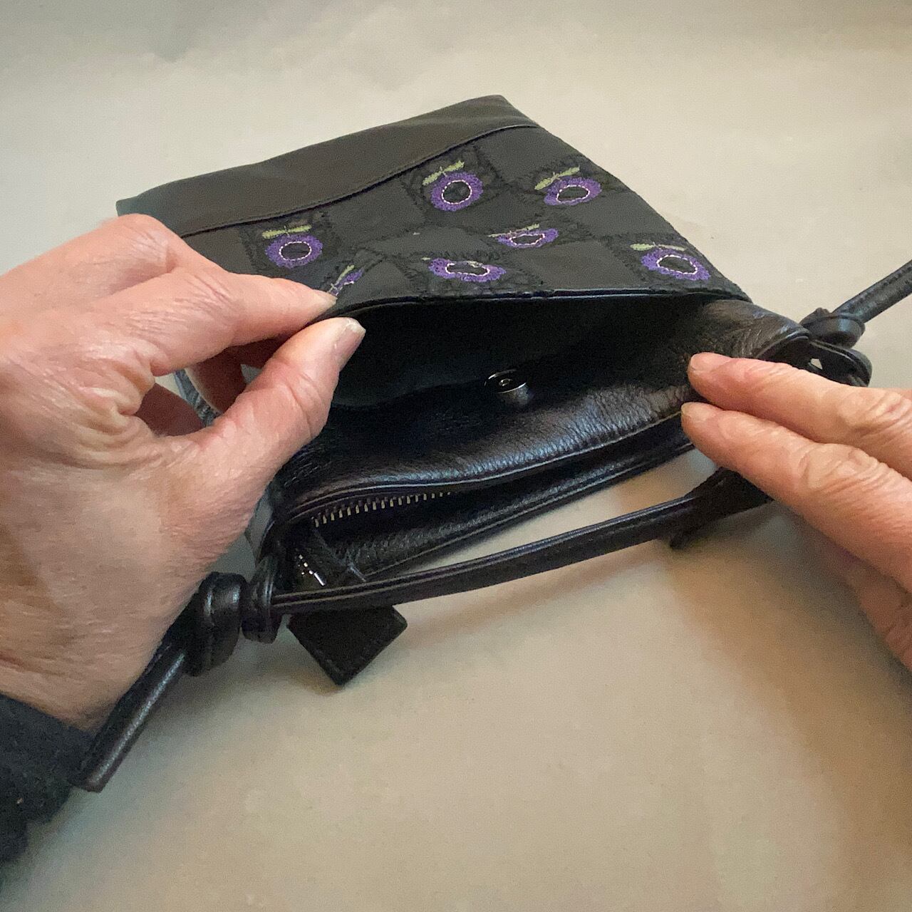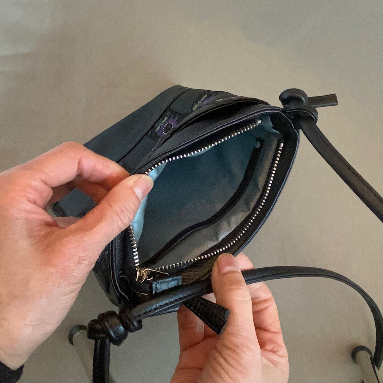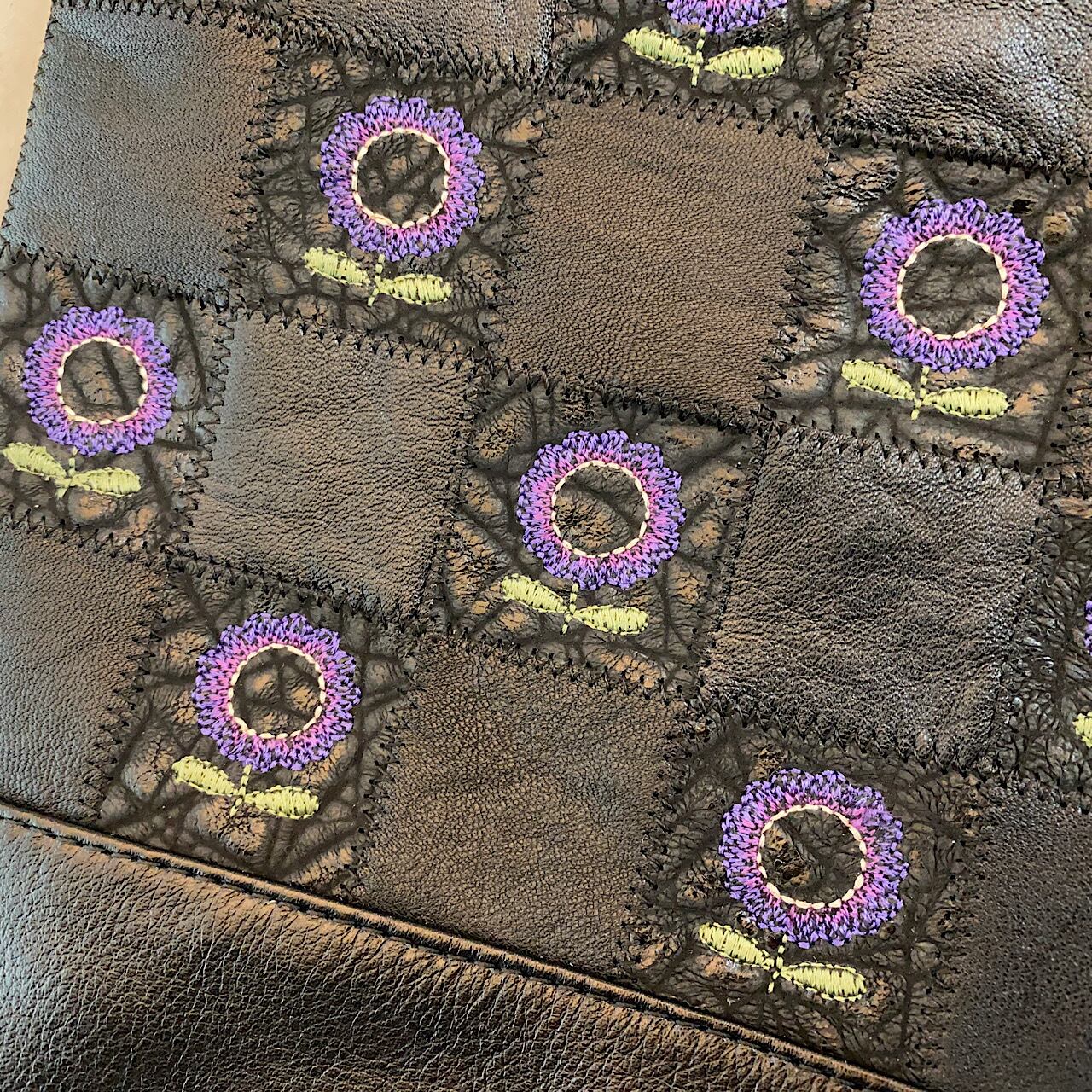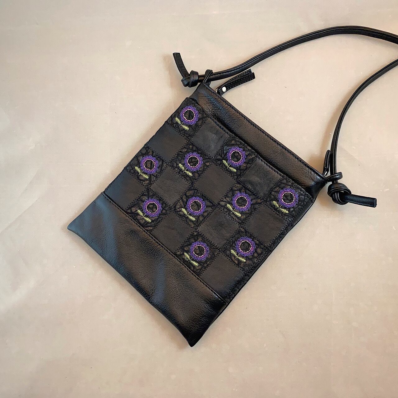ベースは黒の革。パッチワーク部分は2種のテイストの違う黒の革を縫いつなぎ、エレガントなパープルの花の刺繍をして仕立てたサコッシュです。