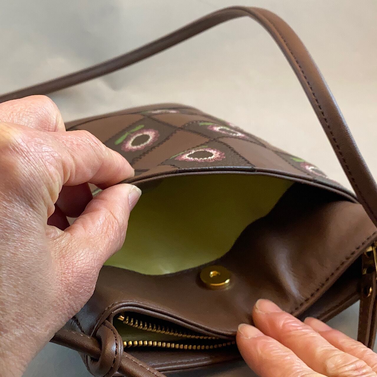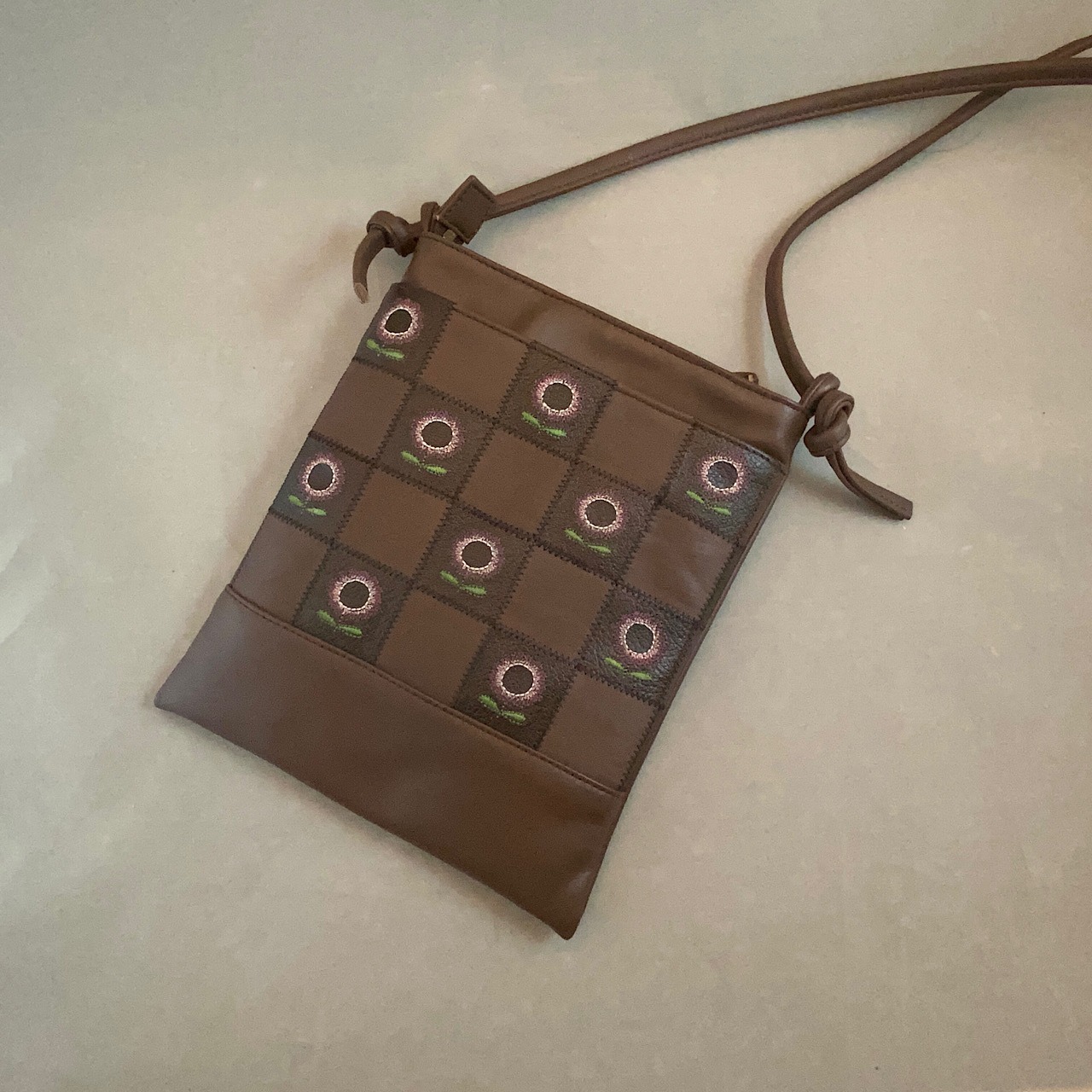 ベースは茶の牛革。パッチワーク部分はシボのある焦げ茶の革と縫いつなぎ、エレガントな花の刺繍をして仕立てたサコッシュです。