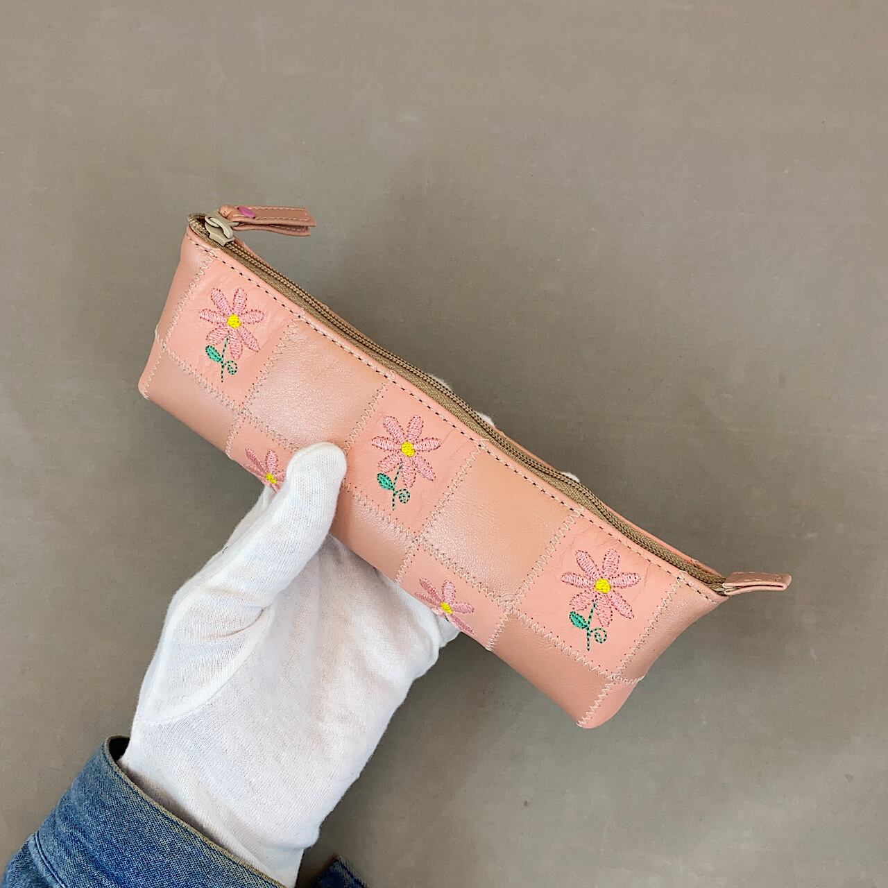 ペンケース・ファスナー付き小物入れ(パールピンク+花の刺繍)No.03013-08