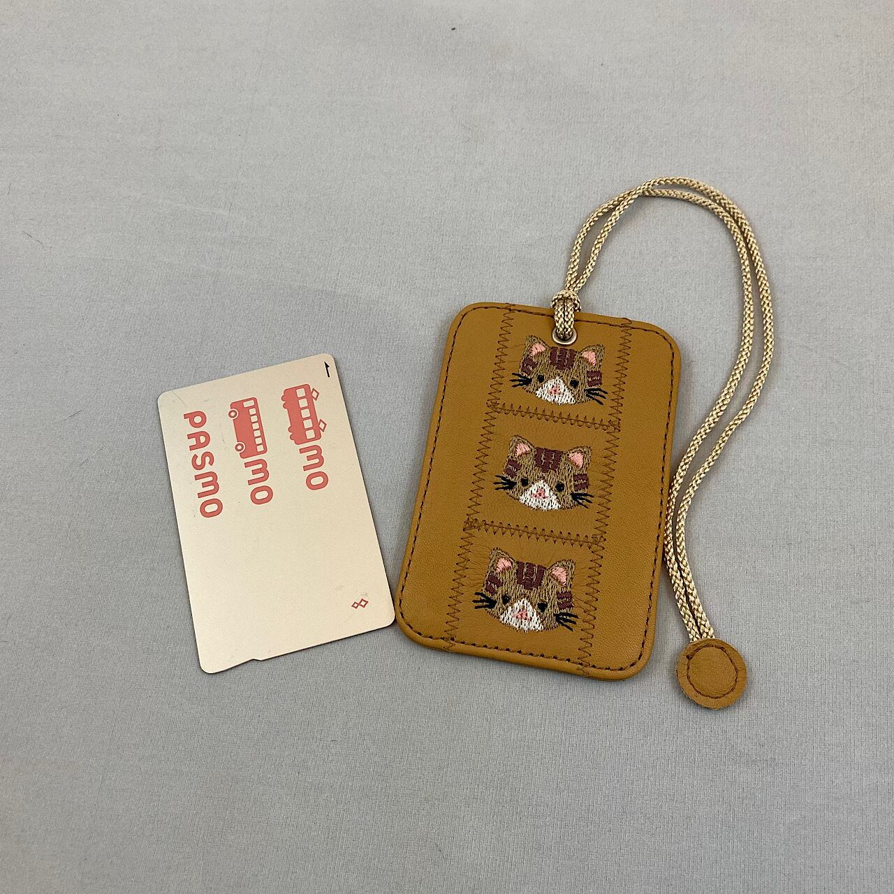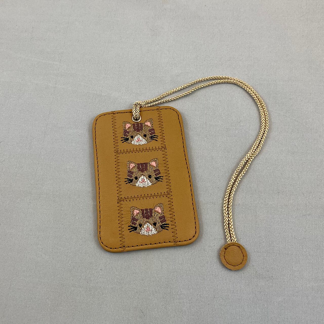 パスケース1枚用(キャメルに茶トラ猫の刺繍)No.03004-23