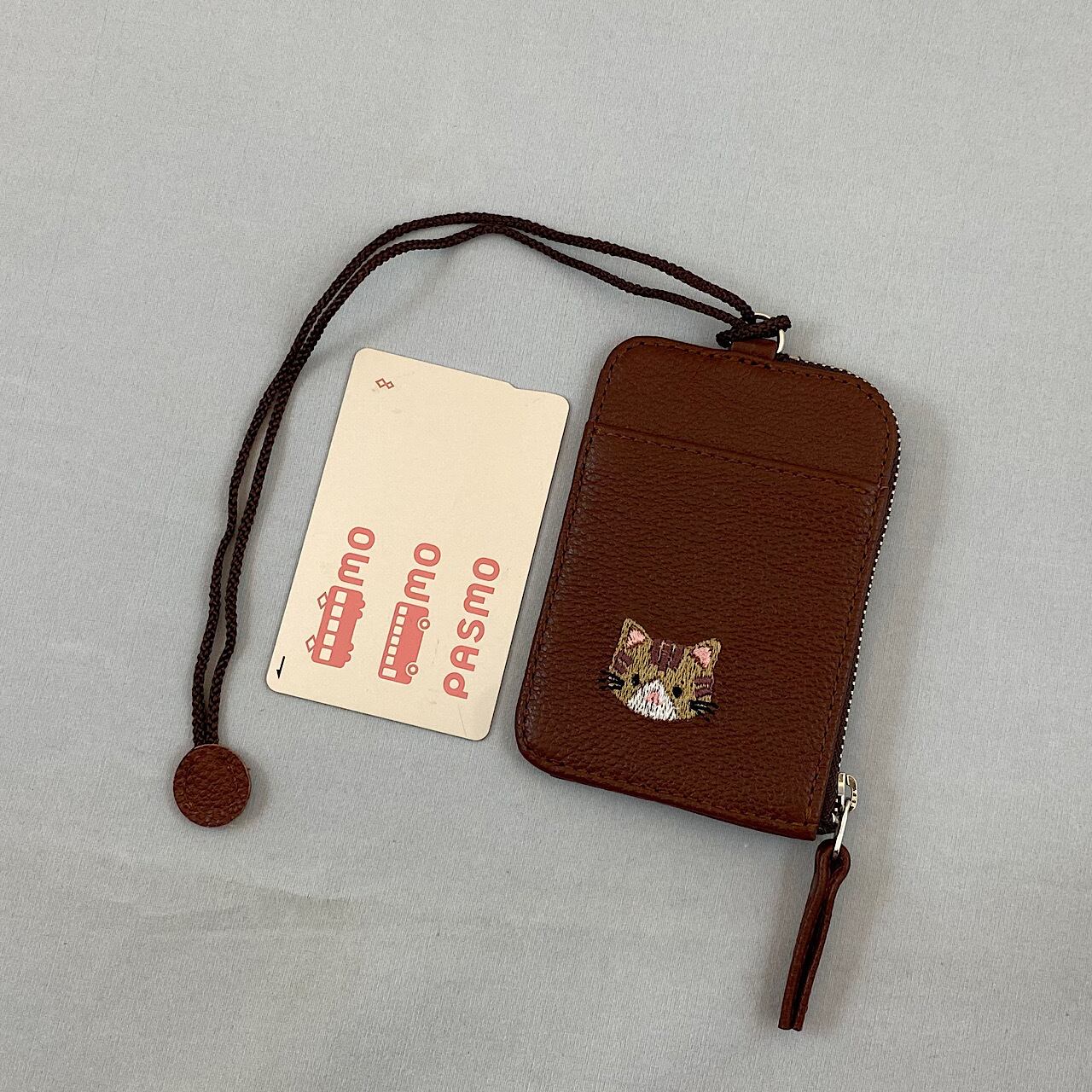 パスケース(小銭入れ付き、焦げ茶に茶トラ猫の刺繍)No.03003-11